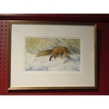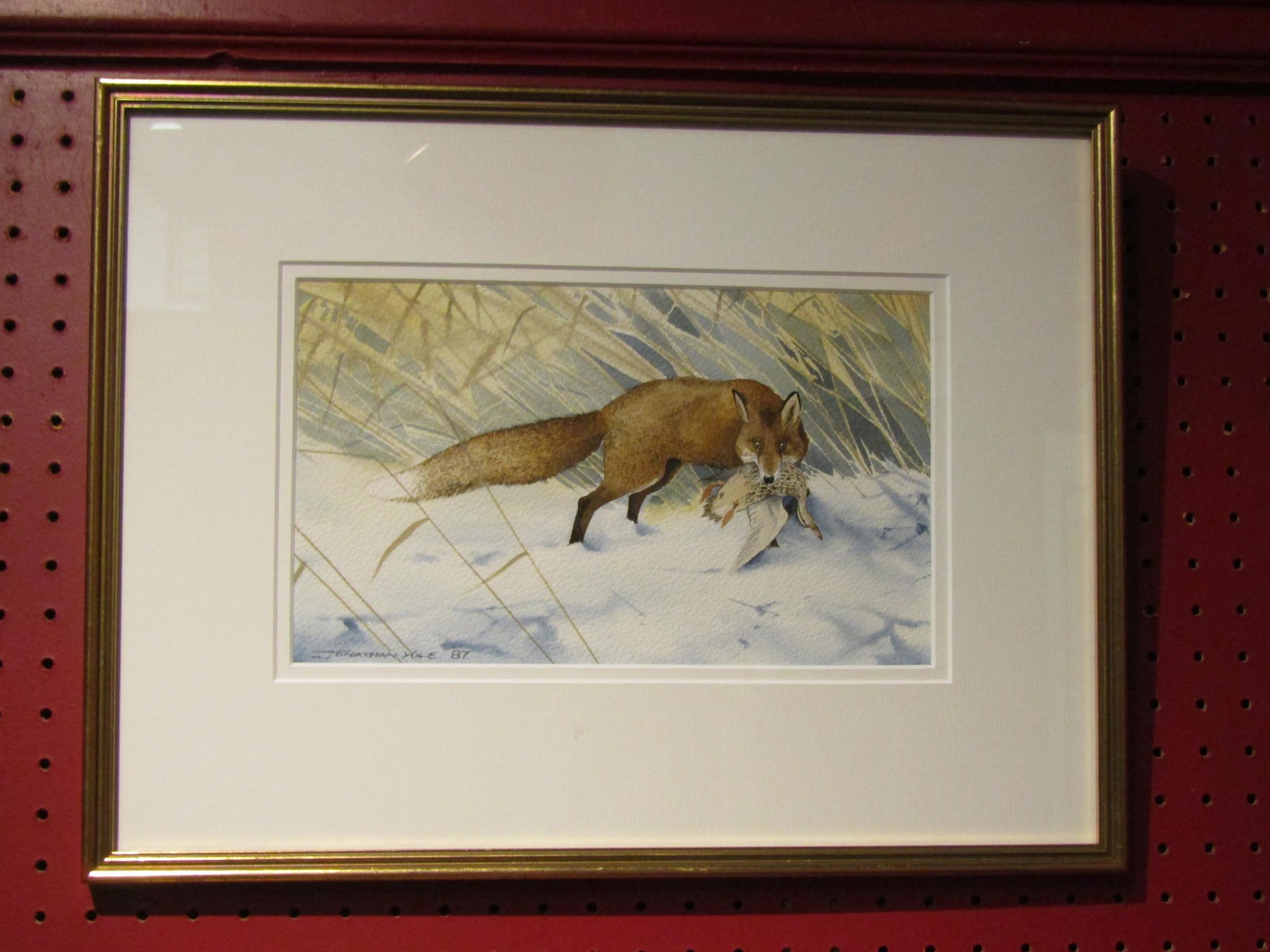 JONATHAN YULE (XX): A watercolour of fox with catch in its mouth, signed and dated '87 lower left, 14.5cm x 24.5cm image size, framed and glazed