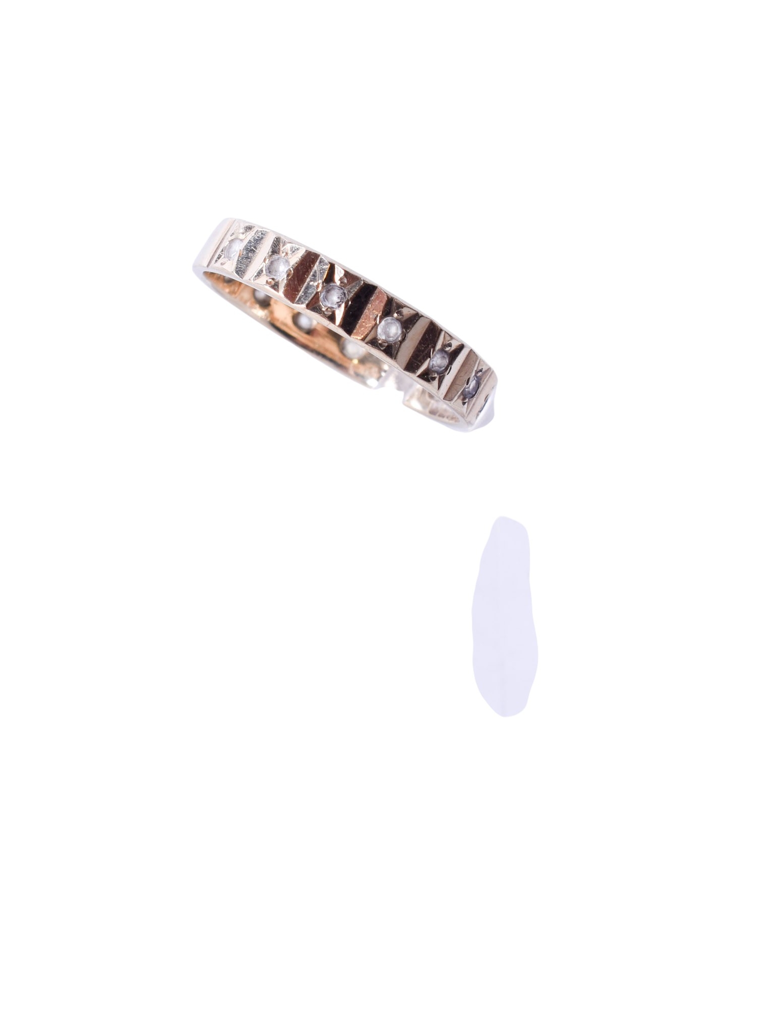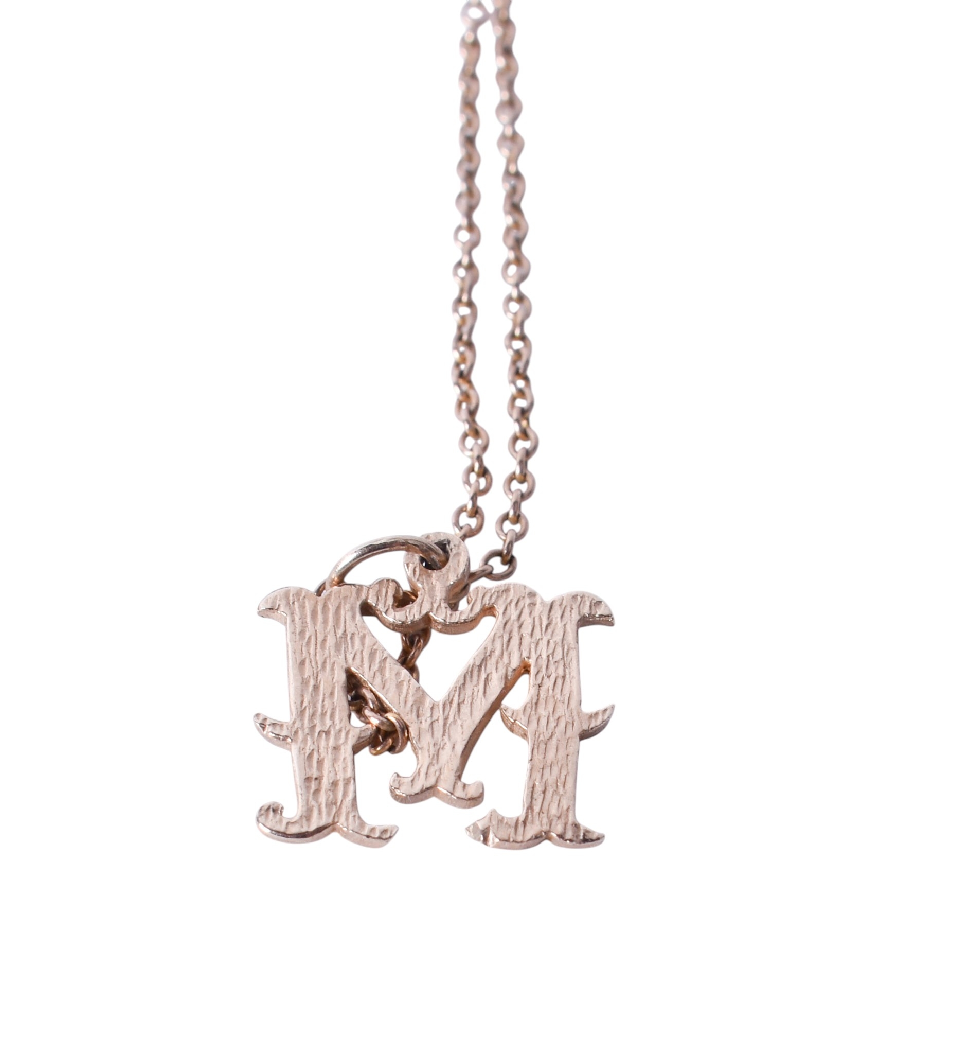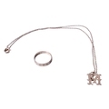 A 9ct gold ring and a yellow metal 'M' pendant and chain. The ring set with small colourless stones, hallmarked, gross weight 2g, the pendant and chain unmarked, this weighing 3g.