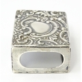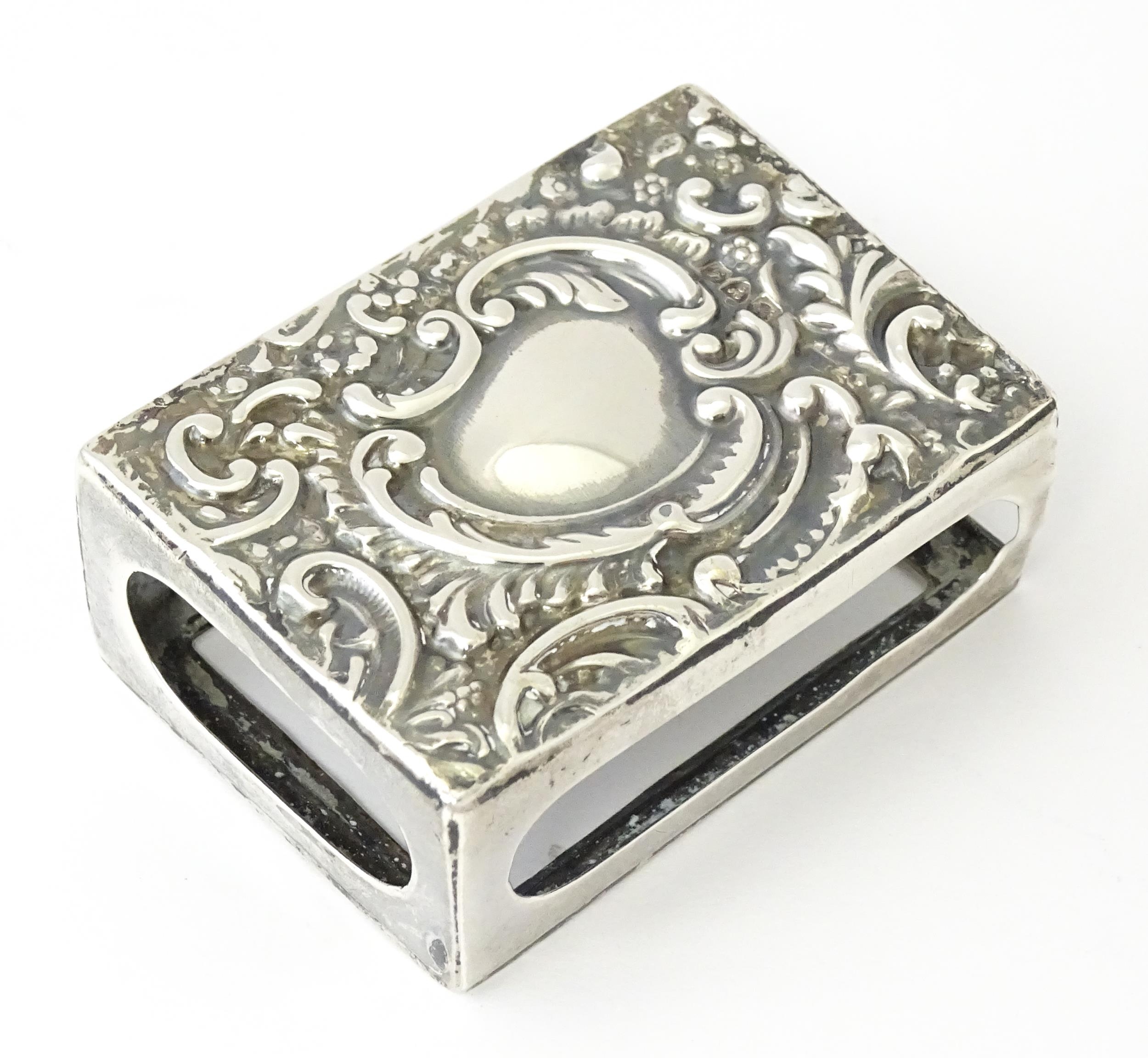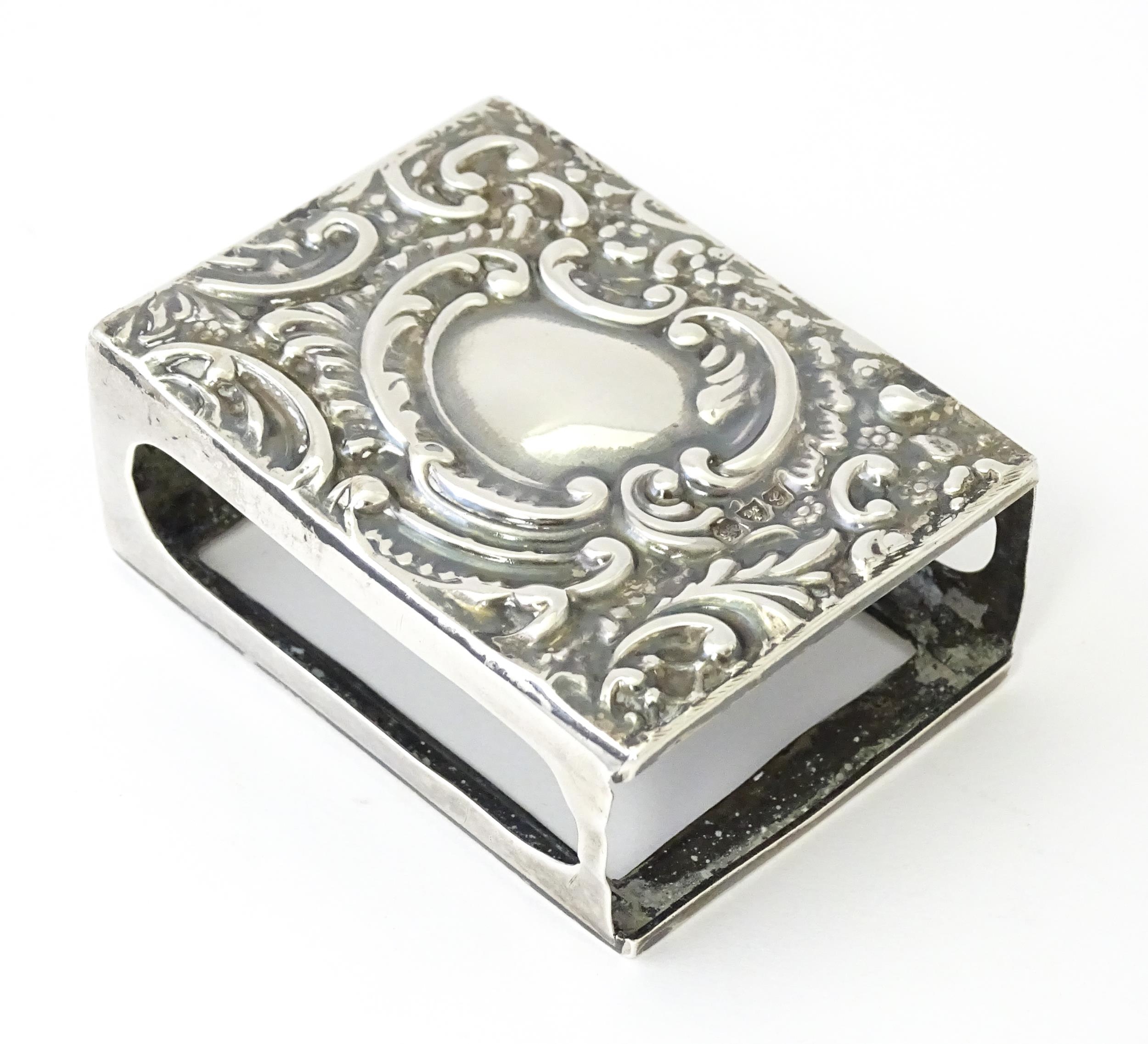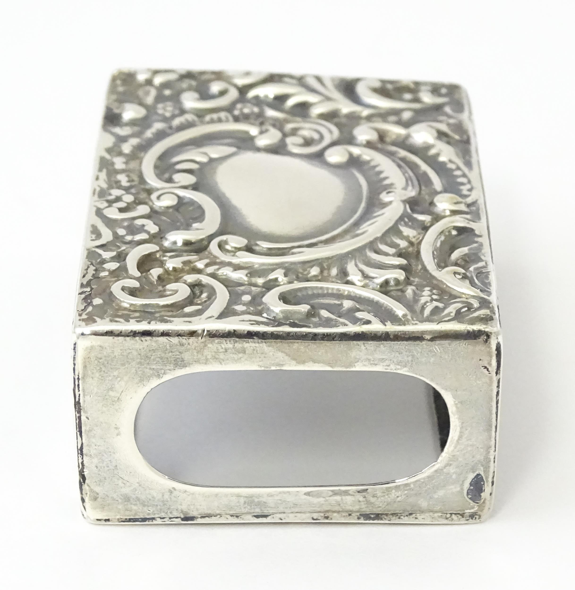 A silver match box cover with embossed decoration, hallmarked Chester 1907. Approx 2 1/4" wide.