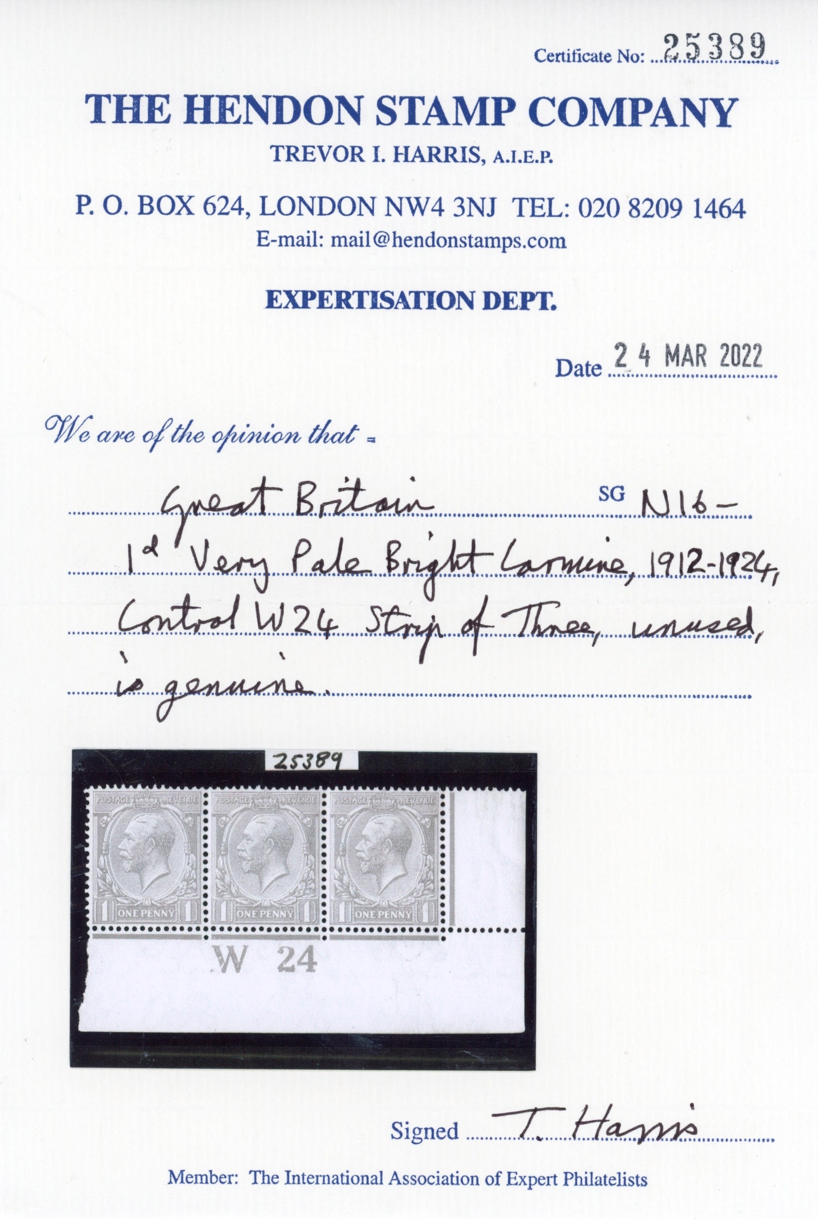 1912â??24 Royal Cypher 1d very pale bright carmine, mint control W24 strip of three in an extraordinary pale shade, large part o.g. (left stamp unmounted); small inclusion affecting right stamp although not noticeable from front. Hendon Stamp Company opinion (2022). SG 360 var, Spec N16 (12) v