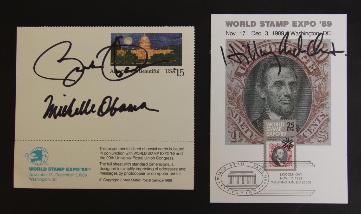 Autographs, U.S.A, Barack OBAMA, Michelle OBAMA on stamp card; Hillary Roddam CLINTON on stamped expo postcard [2]