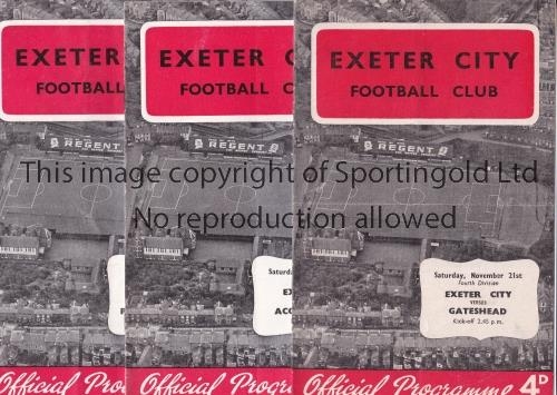 EXETER CITY Three home programmes v Gateshead 59/60, last League season for Gateshead, Accrington Stanley 60/1 and Peterborough United 60/1, Peterborough's first League season. Generally good
