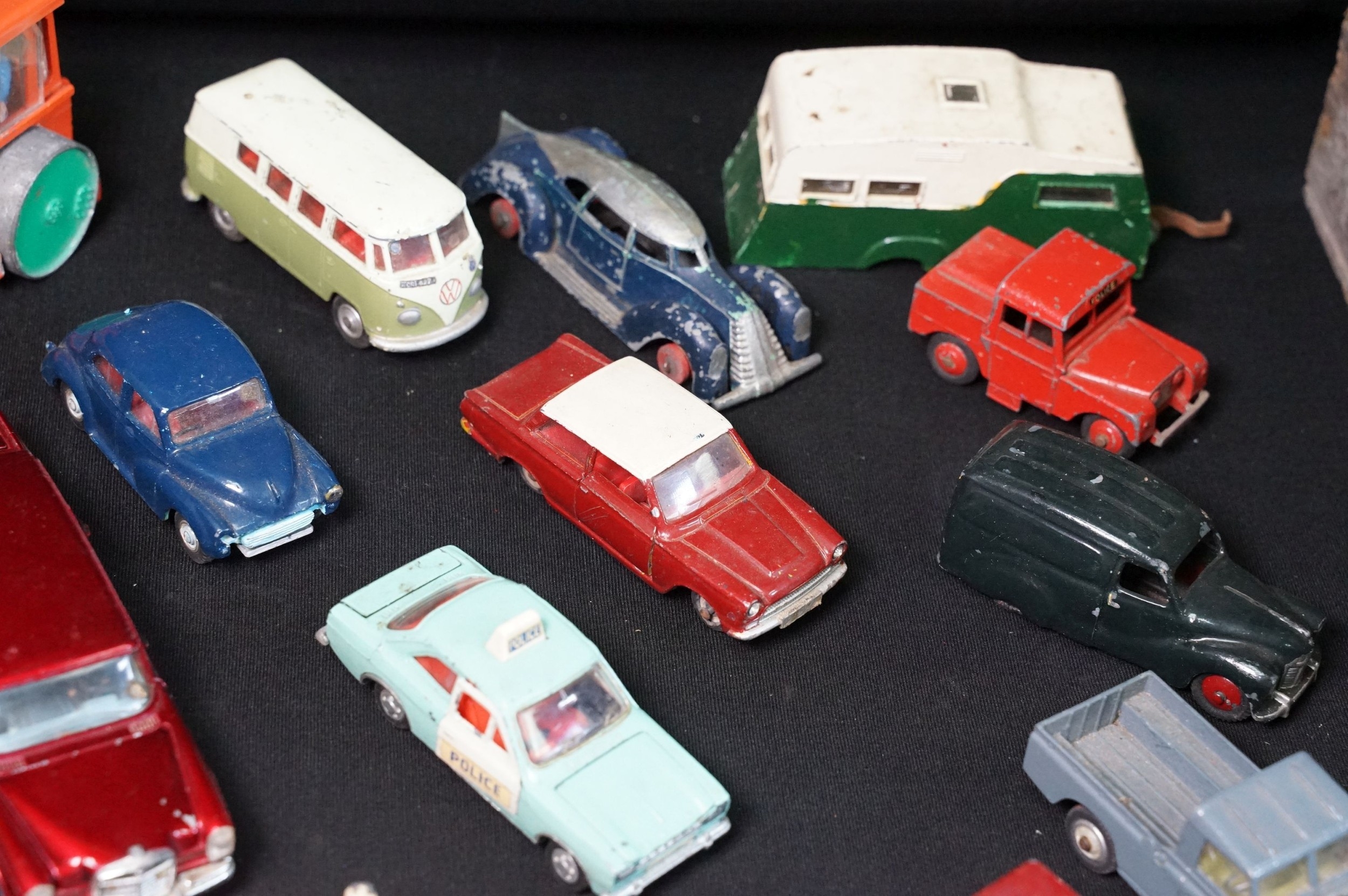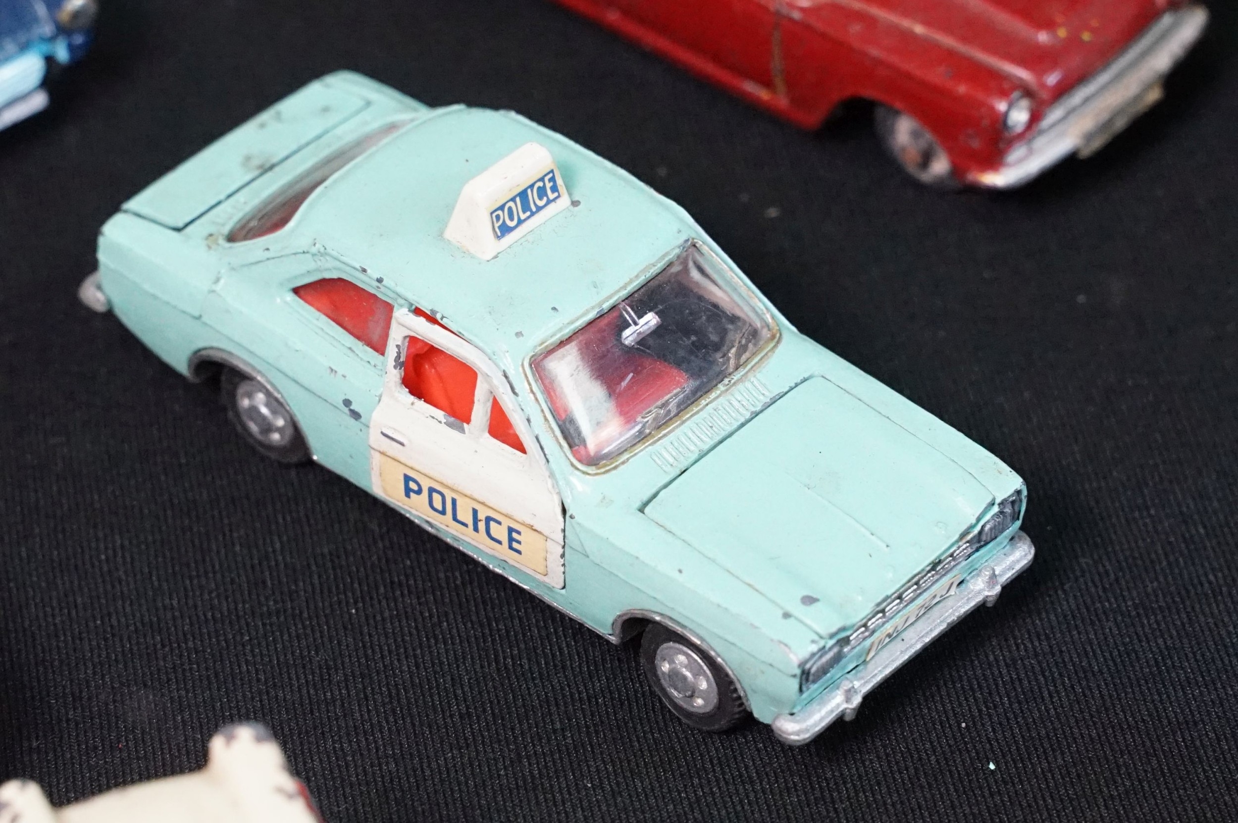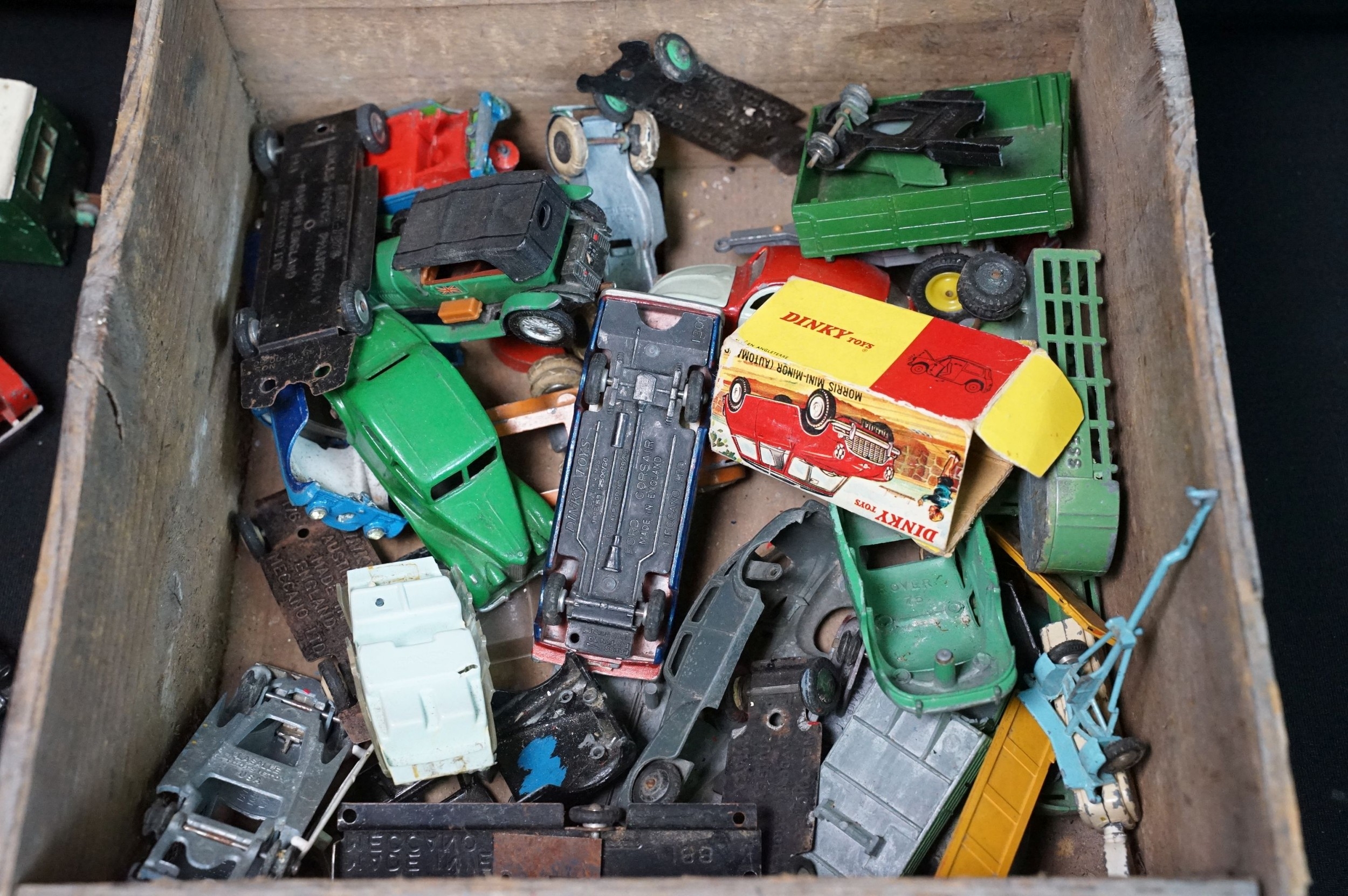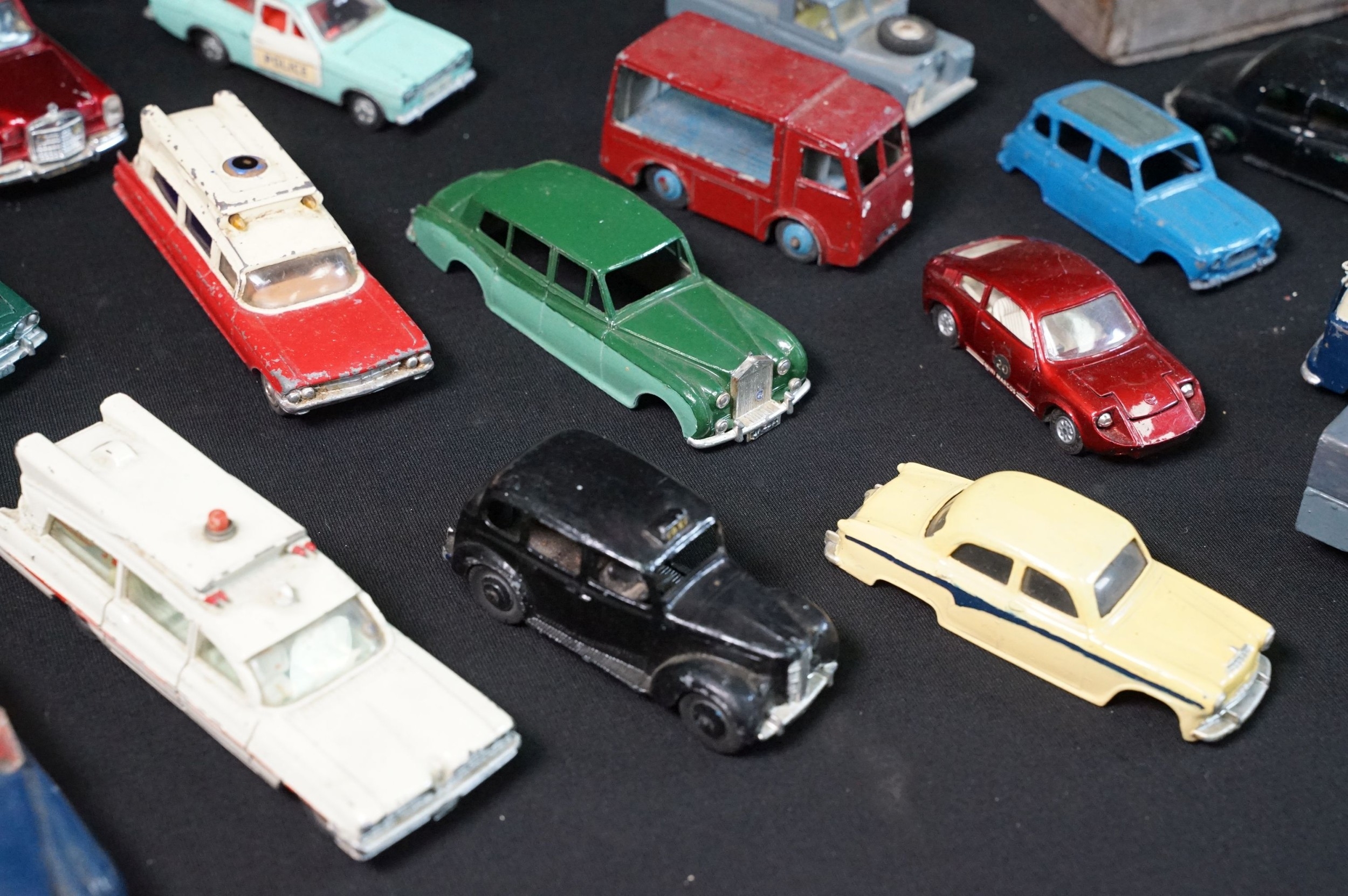 40 Mid 20th C play worn diecast models to include Corgi & Dinky featuring Dinky Police Ford Escort, Corgi Austin A60, Dinky Mercedes Benz 600 etc plus a large quantity of spare chassis, bodies and parts