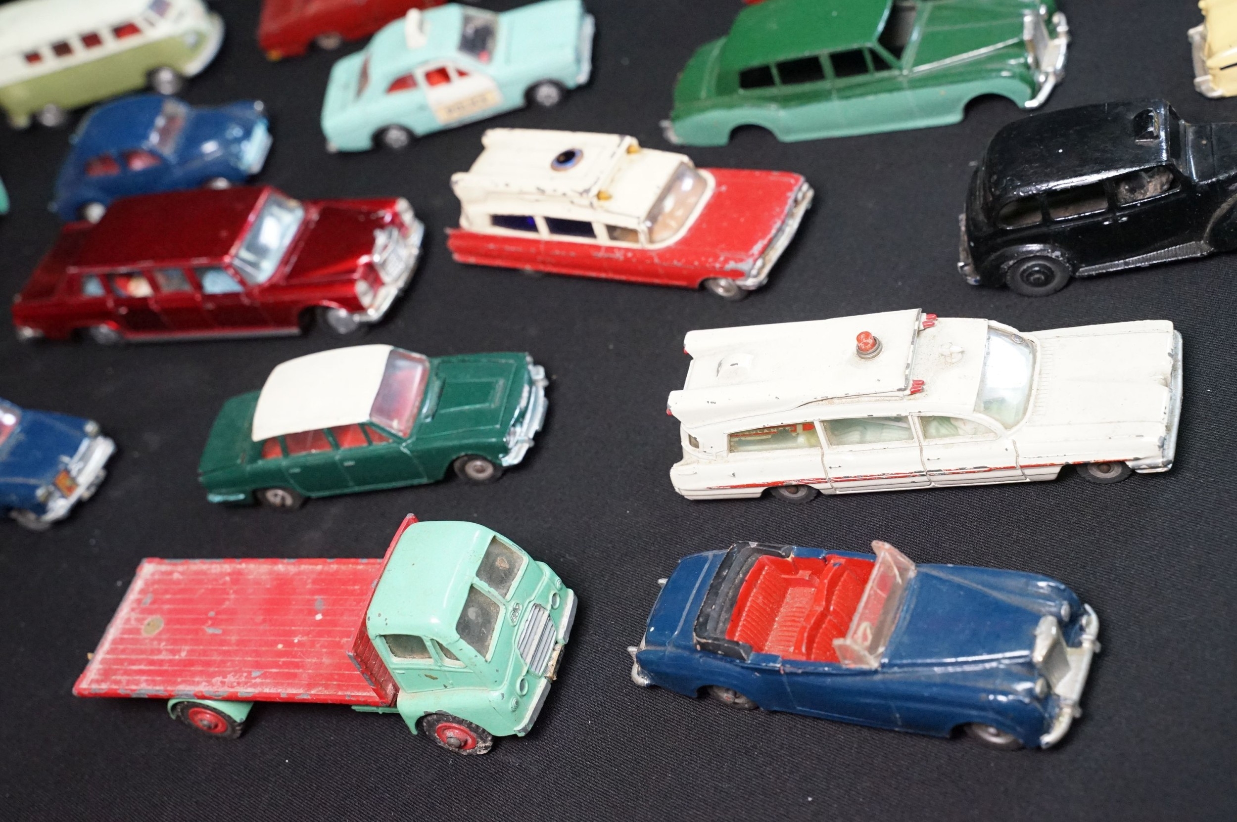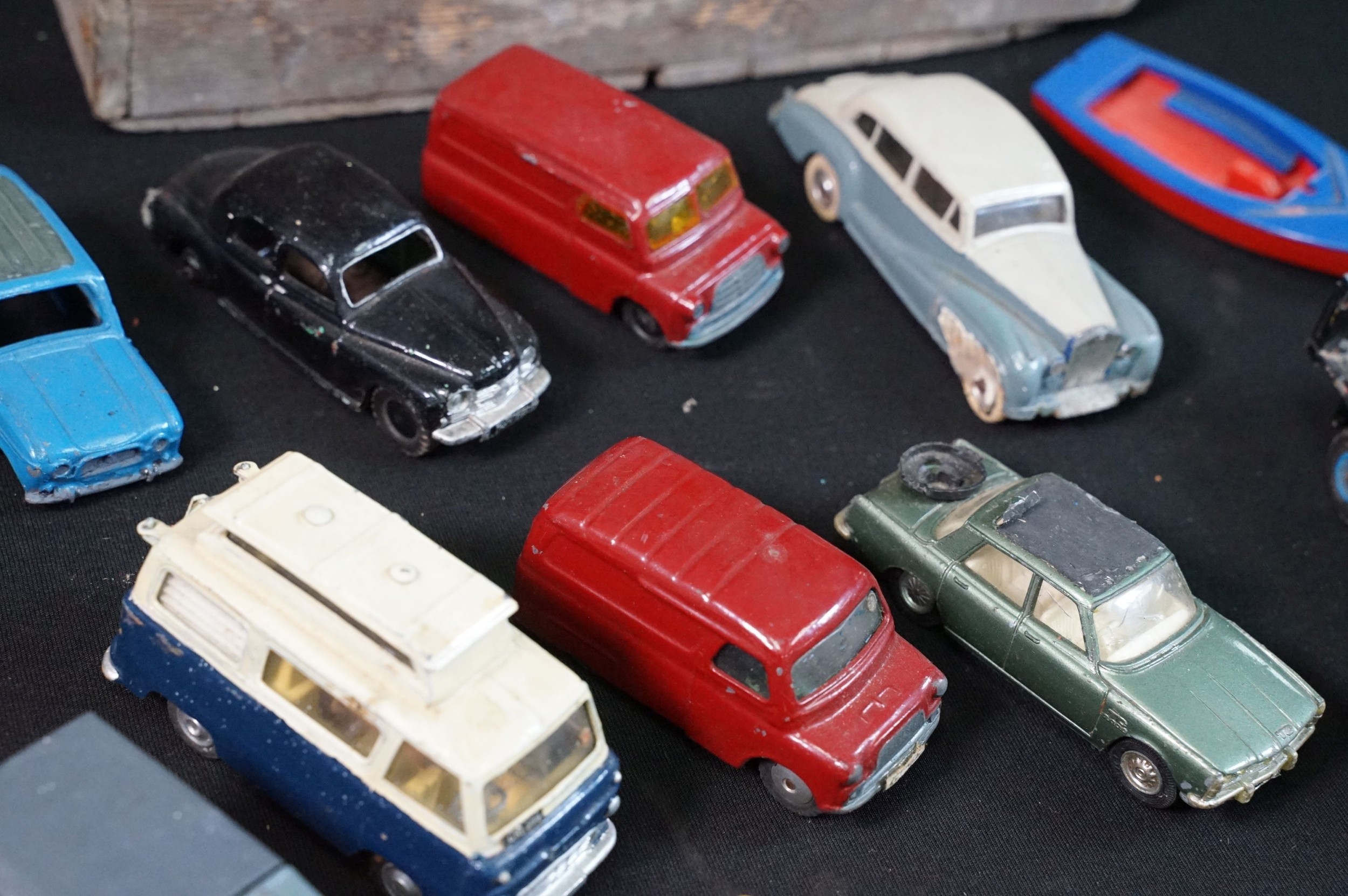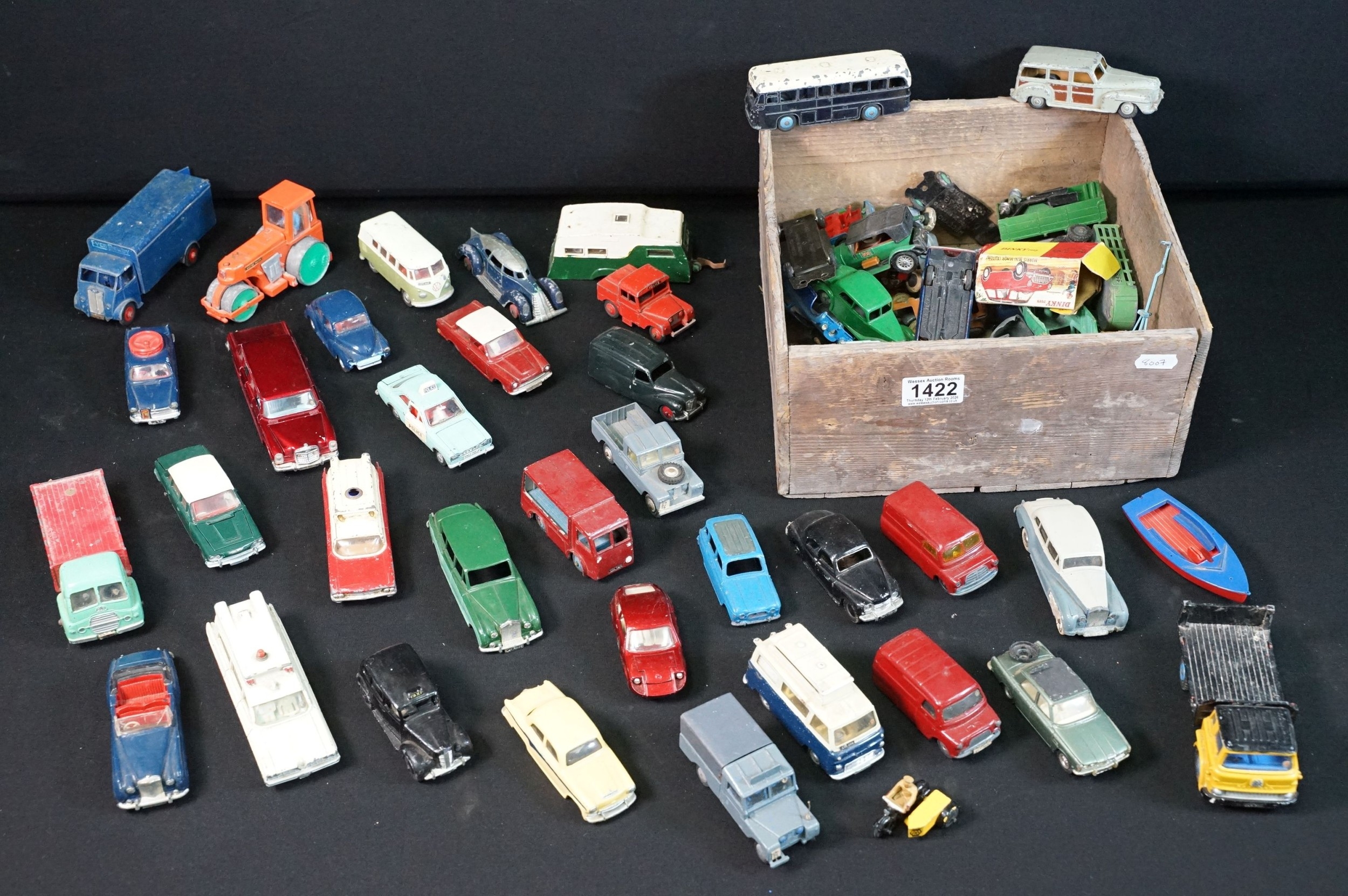 40 Mid 20th C play worn diecast models to include Corgi & Dinky featuring Dinky Police Ford Escort, Corgi Austin A60, Dinky Mercedes Benz 600 etc plus a large quantity of spare chassis, bodies and parts