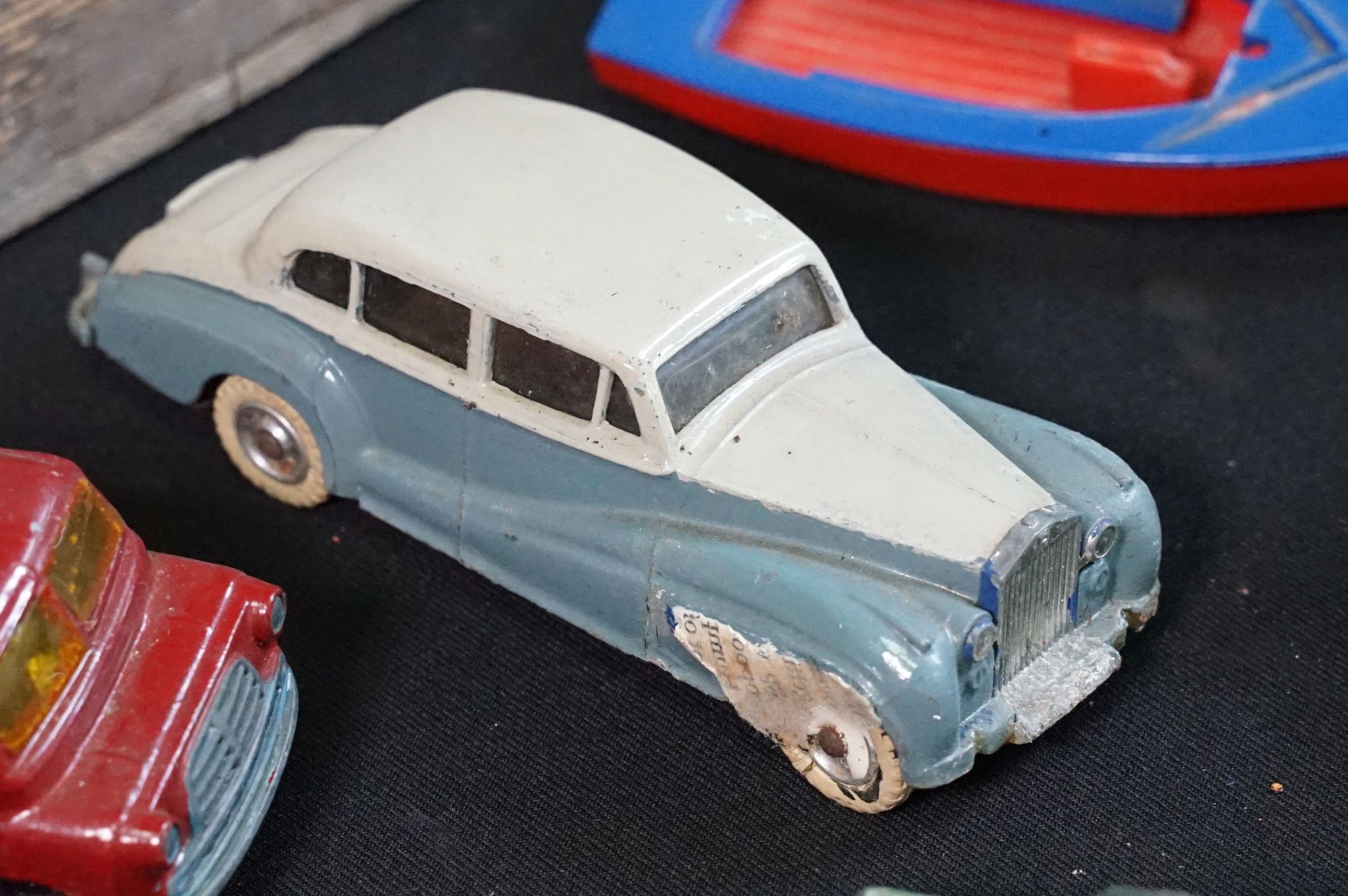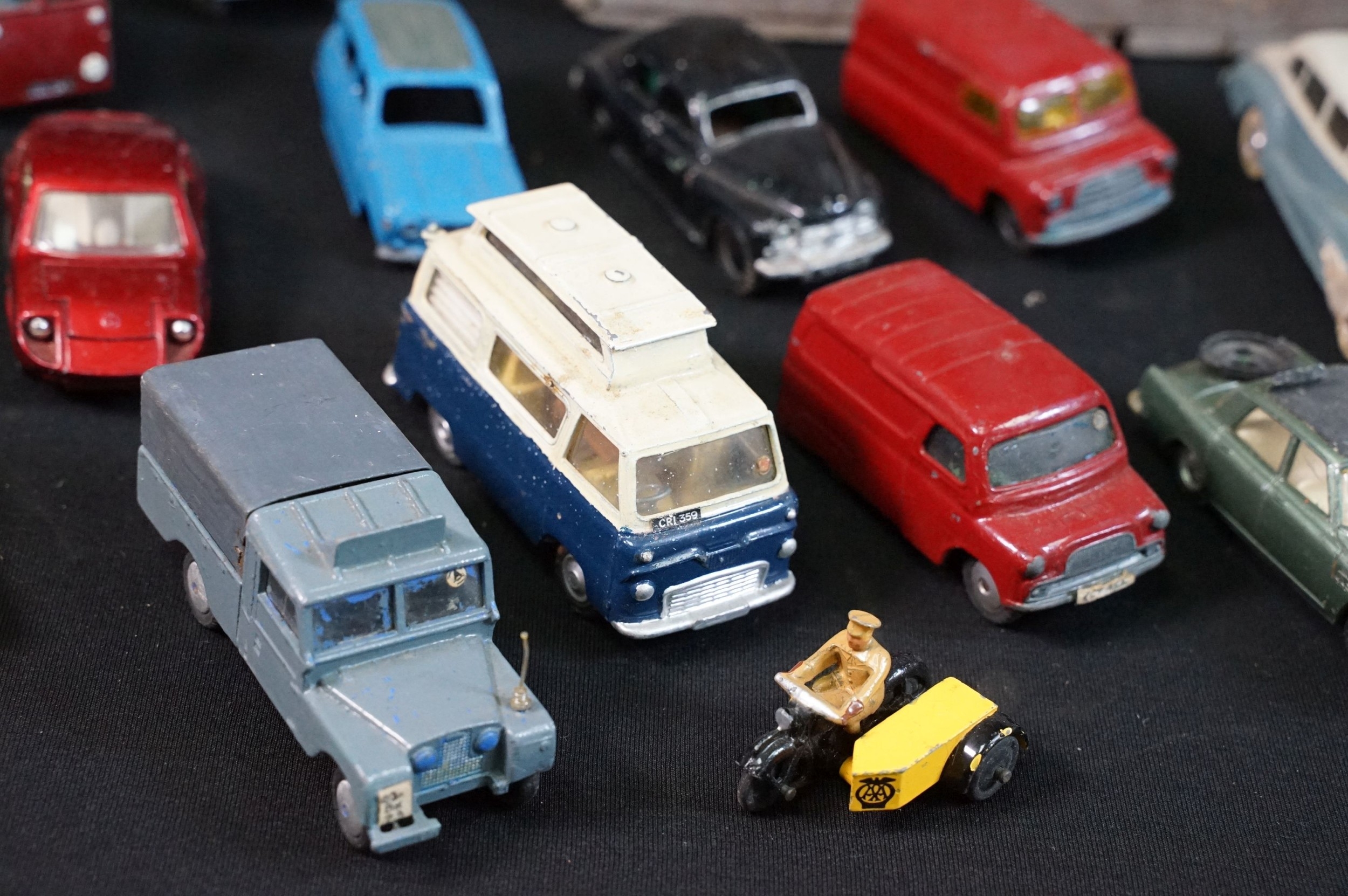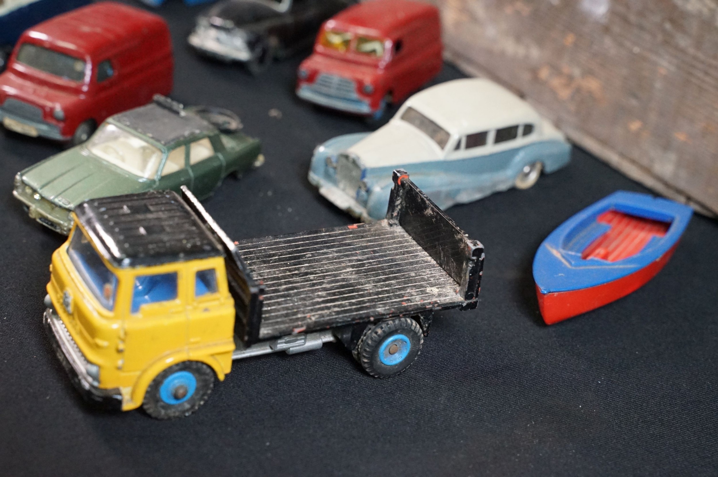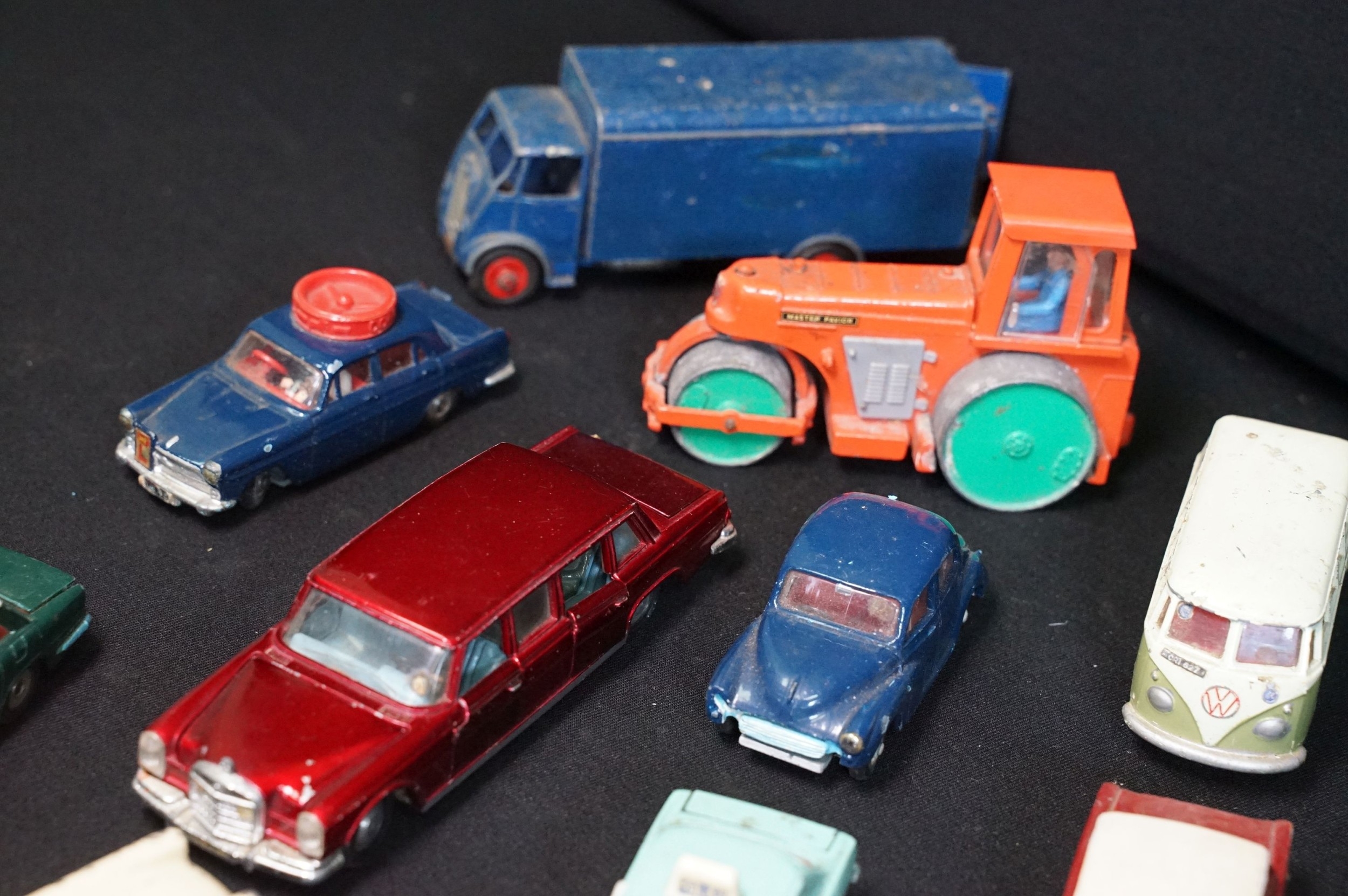 40 Mid 20th C play worn diecast models to include Corgi & Dinky featuring Dinky Police Ford Escort, Corgi Austin A60, Dinky Mercedes Benz 600 etc plus a large quantity of spare chassis, bodies and parts