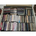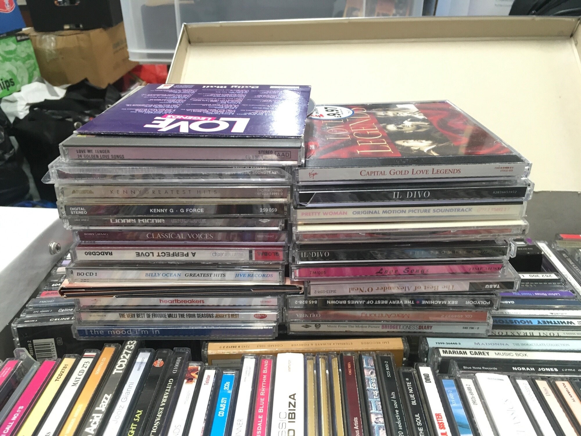 A box of CDs by various artists including Amy Winehouse, Madonna, George Michael and many more.