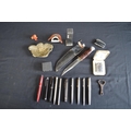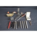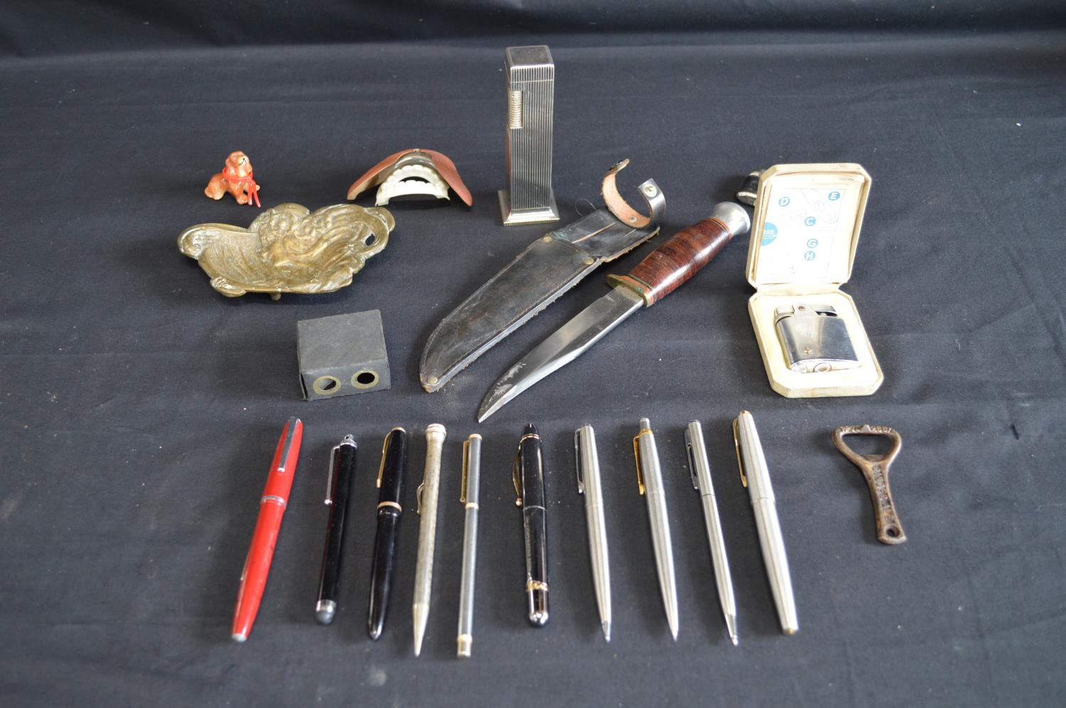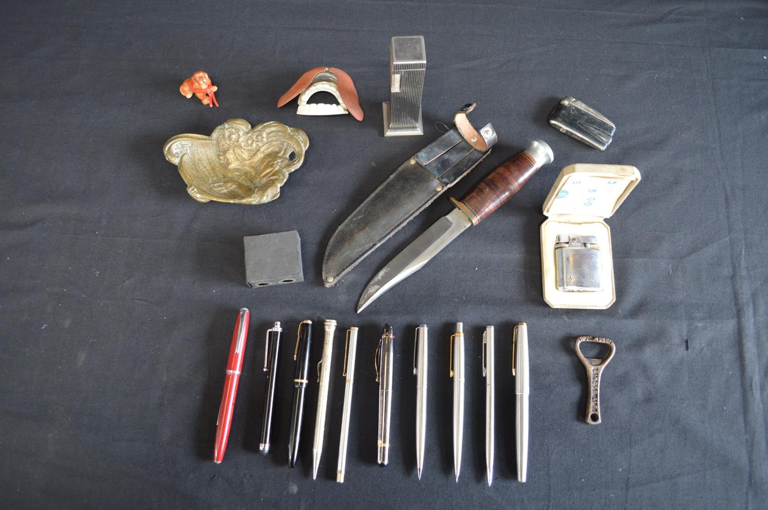 Group of sundry items to include: J Nowill & Sons knife & sheath, silver propelling pencil, Lord De Luxe table lighter and Art Nouveau brass dish etc