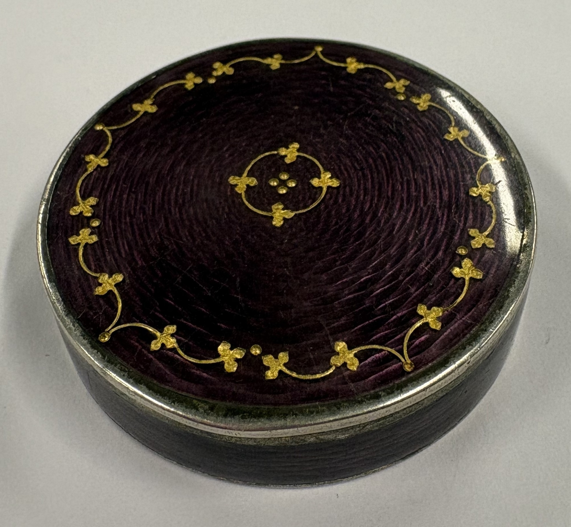 A Norwegian silver and purple enamelled snuff box inlaid with gold decoration. Marked 925 to base. Approx. 50 grams. Est. £300 - £400.