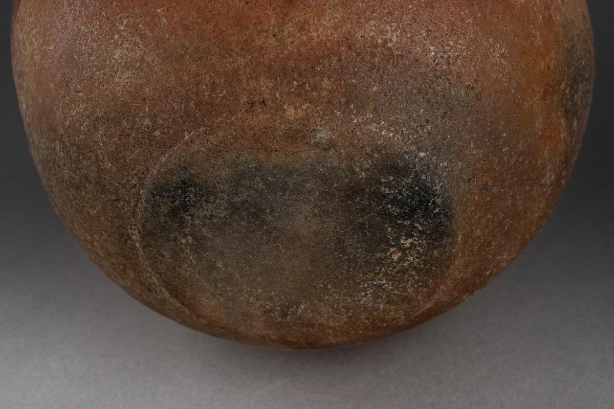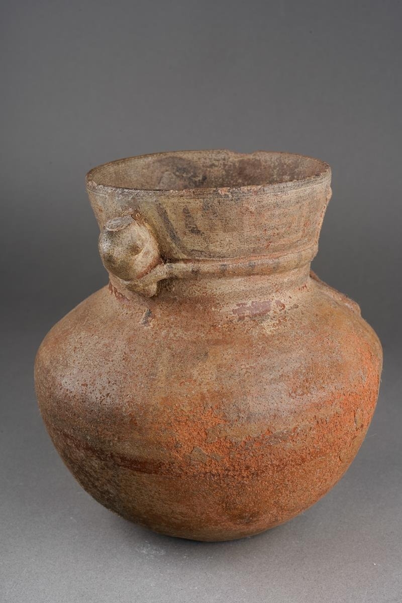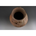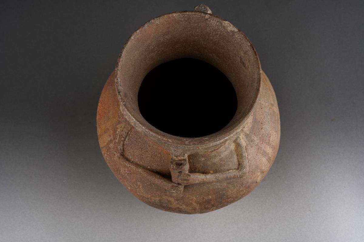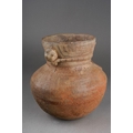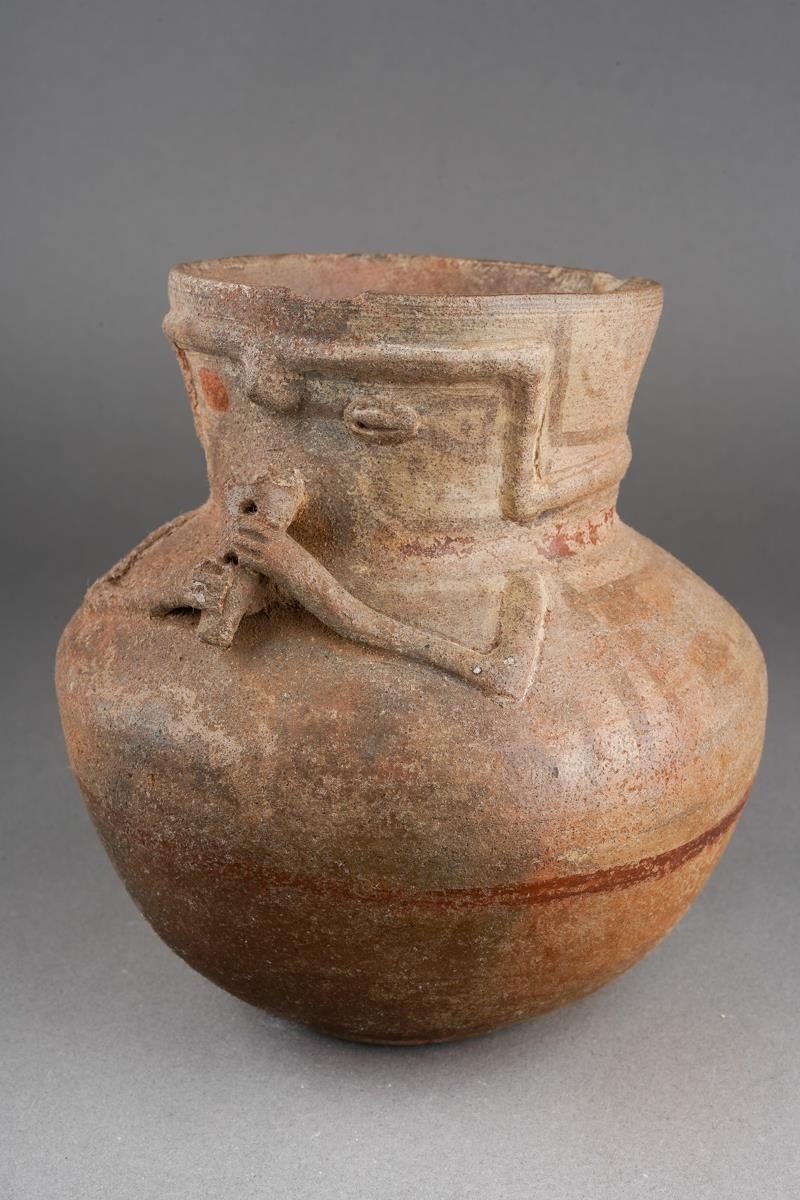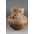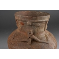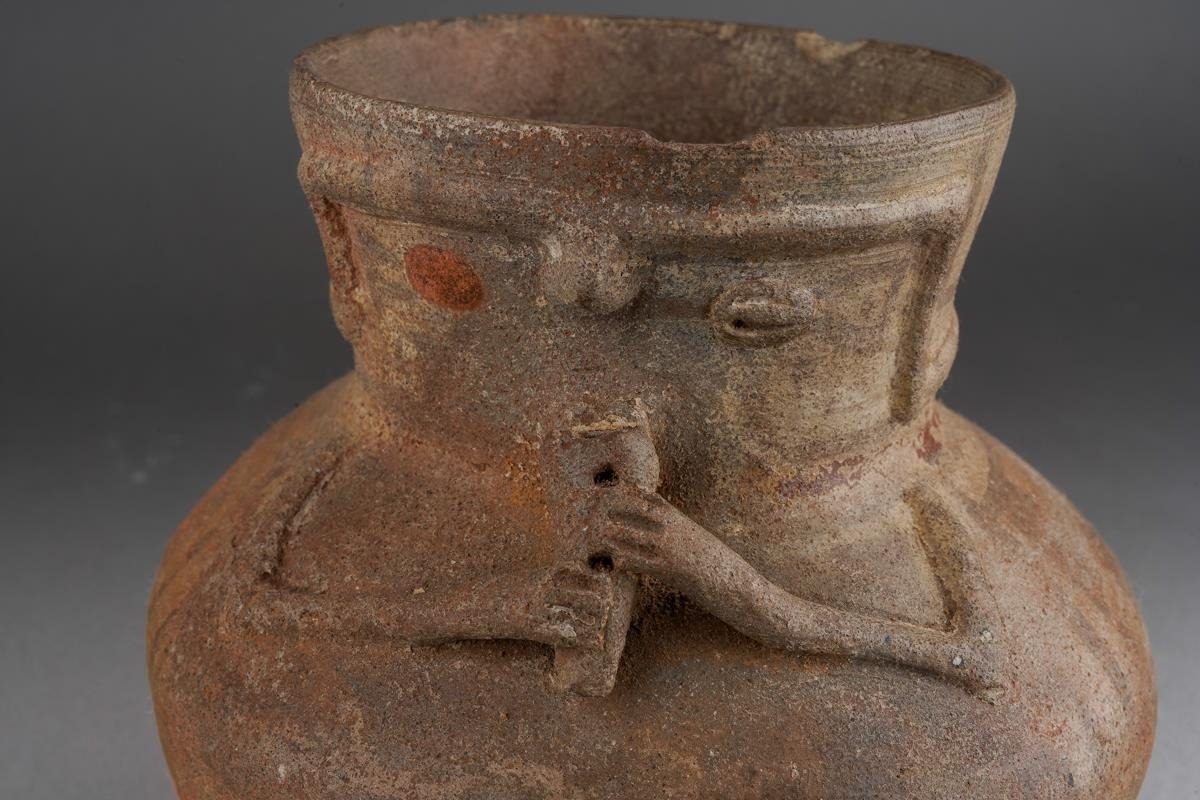 Pre Columbian Chancay pottery figural jar playing a flute , approx. 14 cm tall