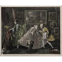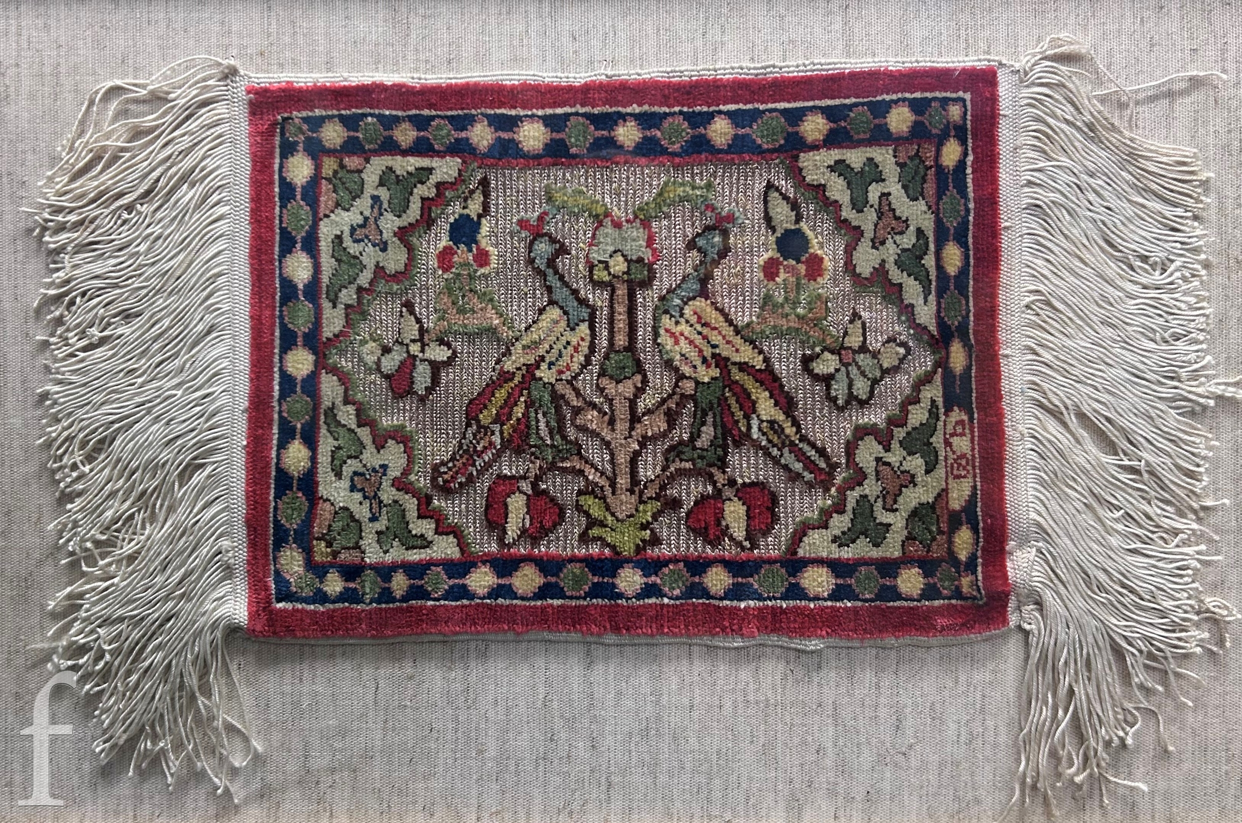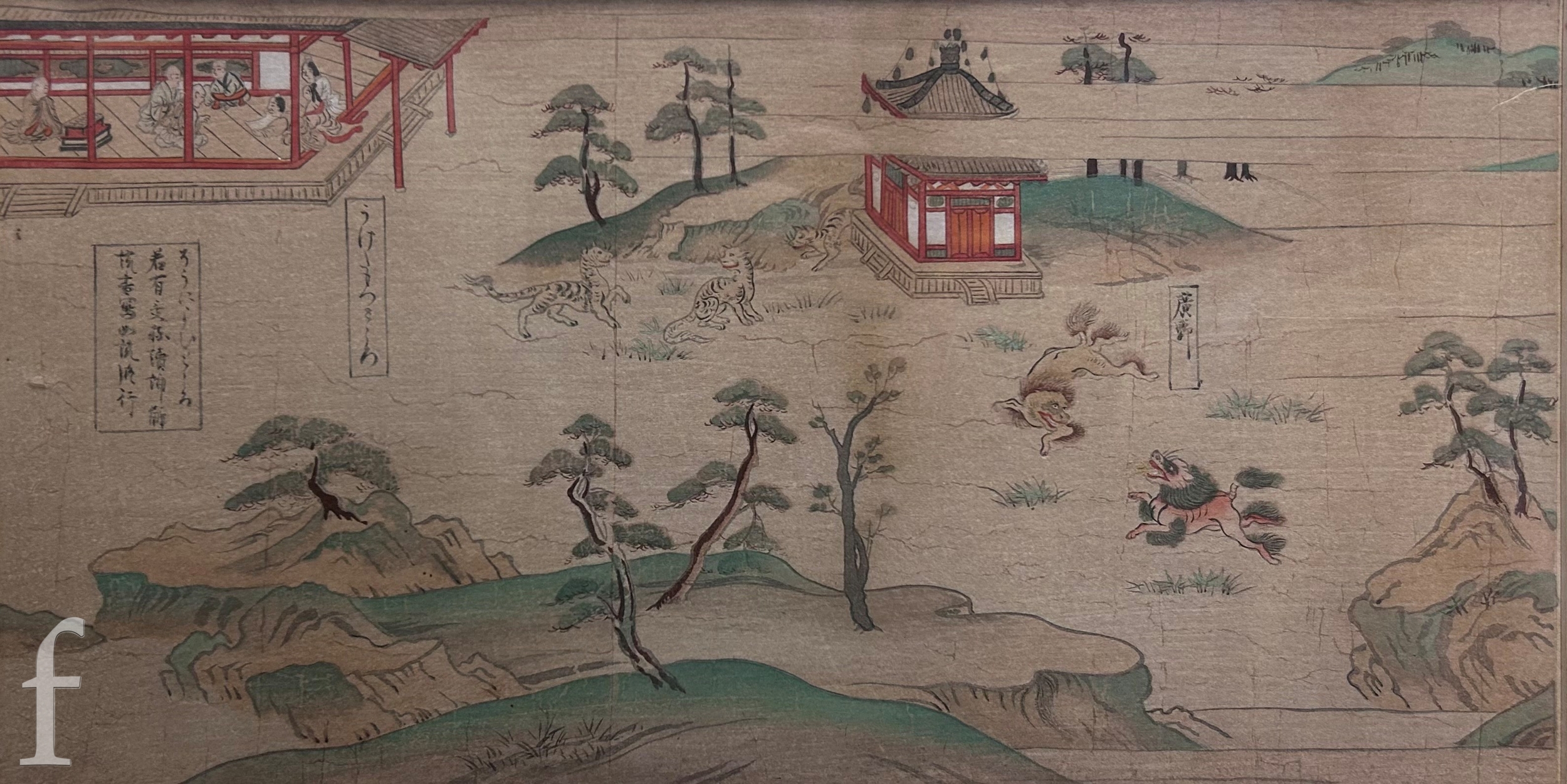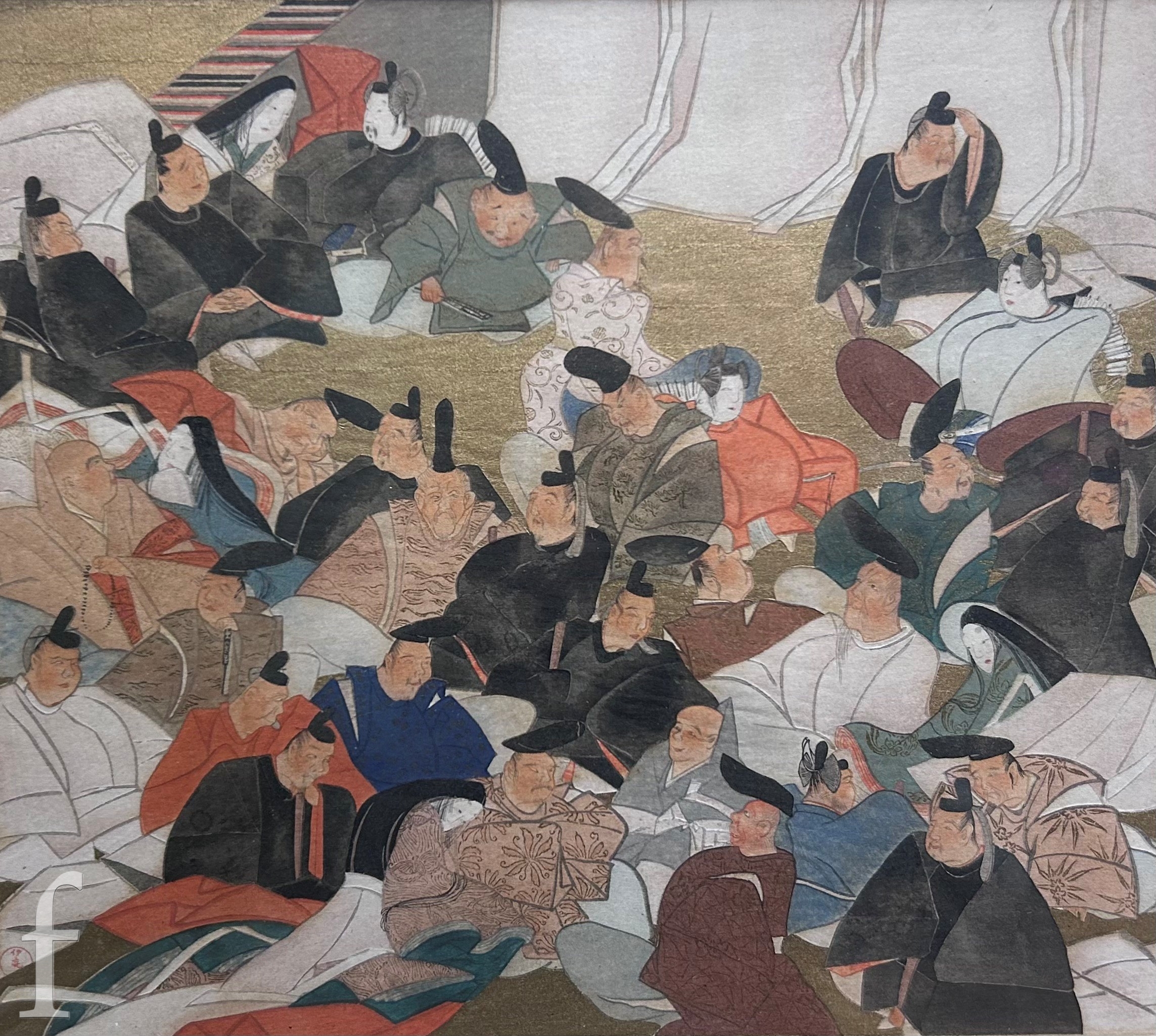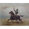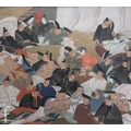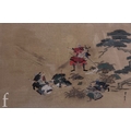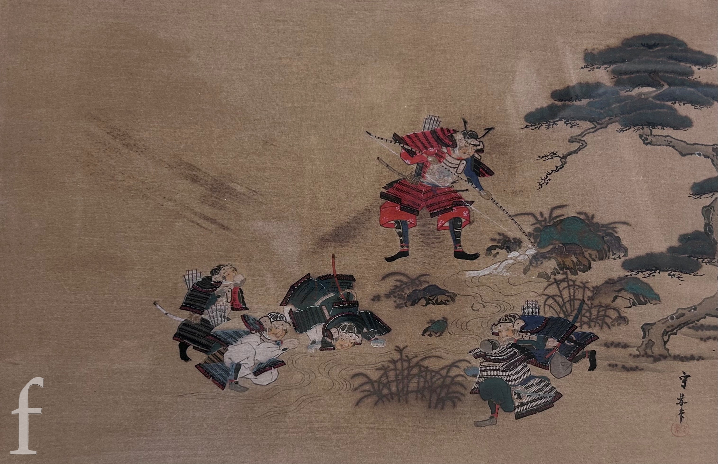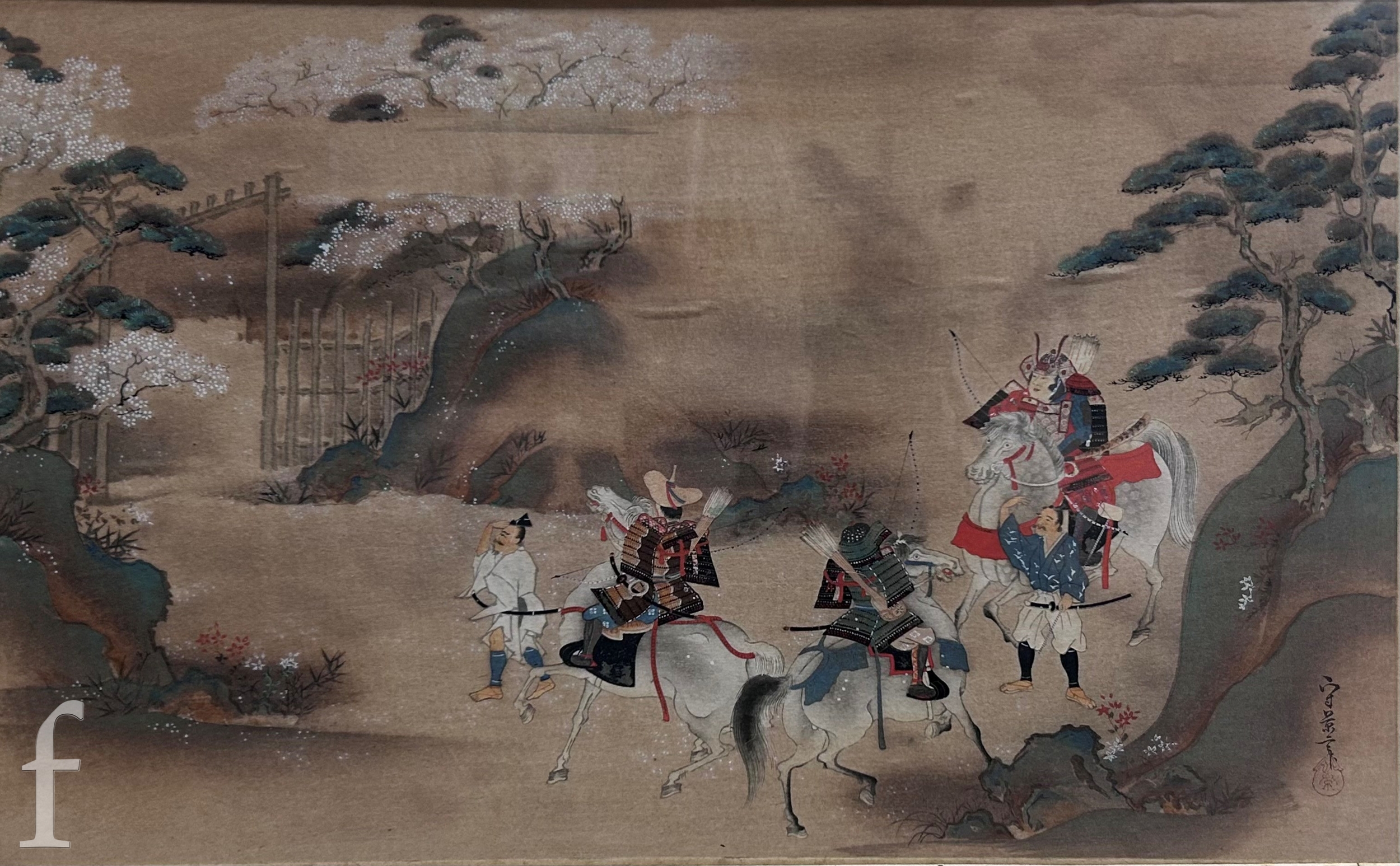 After Kusumi Morikage (Japanese, 1620-1690) - Three warriors on horses with attendants, woodblock print with hand painted embellishments, signed with seal, framed, 22cm x 36cm, frame size 41cm x 49cm, also five prints and oil and framed tapestry by various hands. (8)