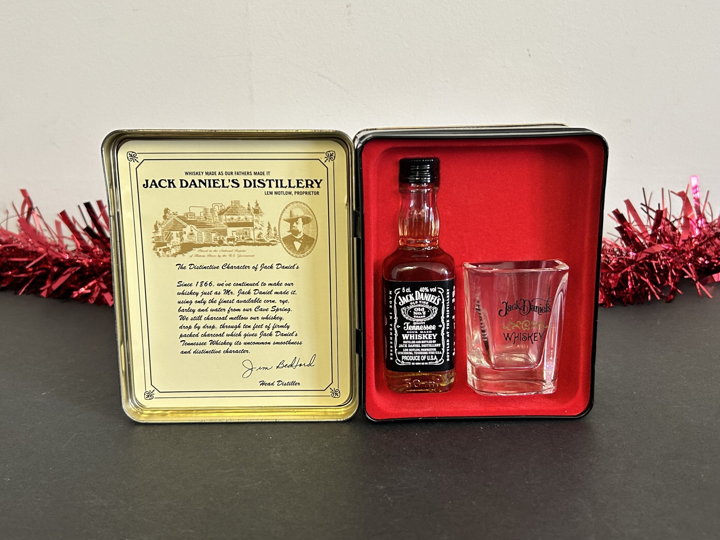 A boxed Jack Daniels Old No.7 Brand Whisky set of a miniature 5cl bottle together with a shot glass