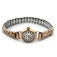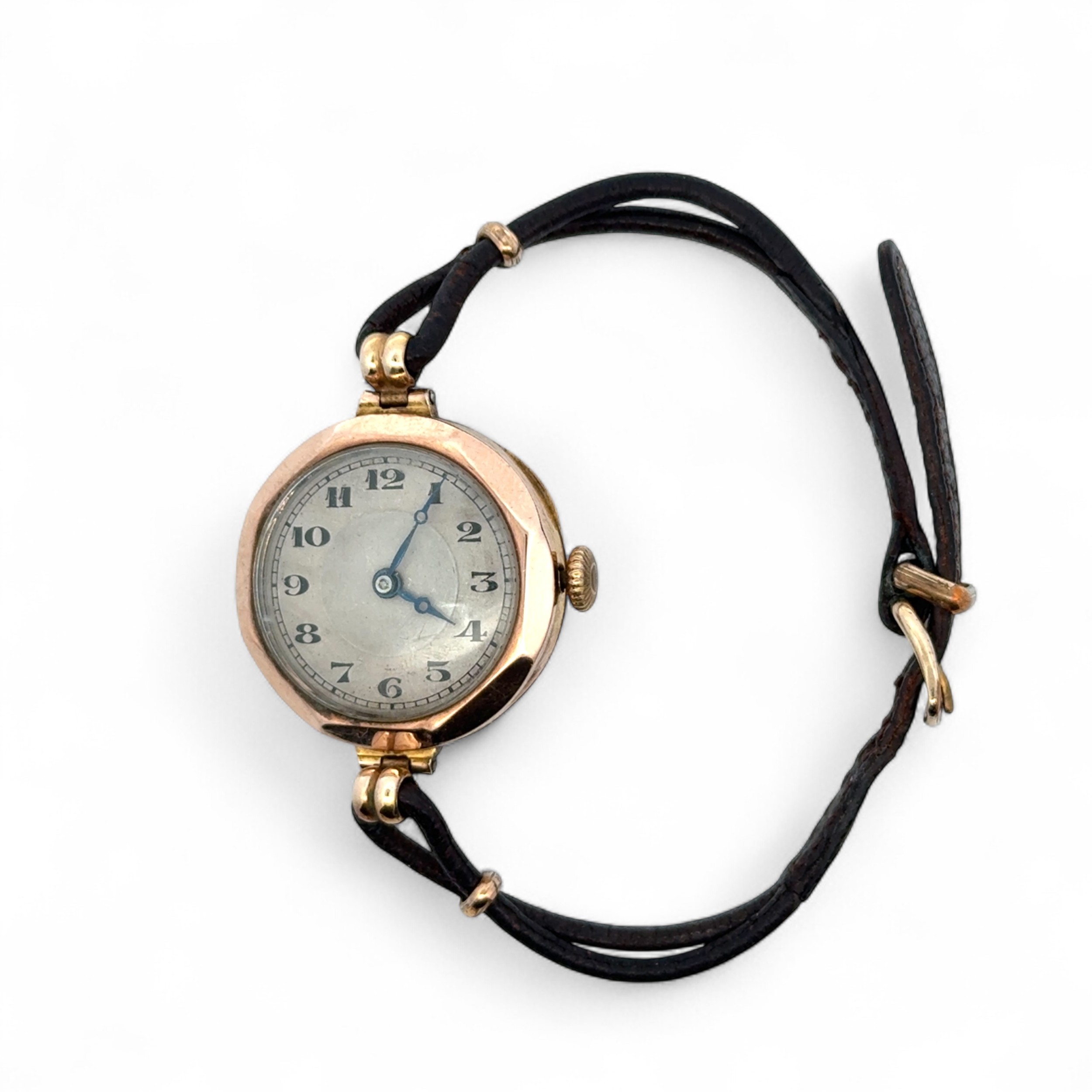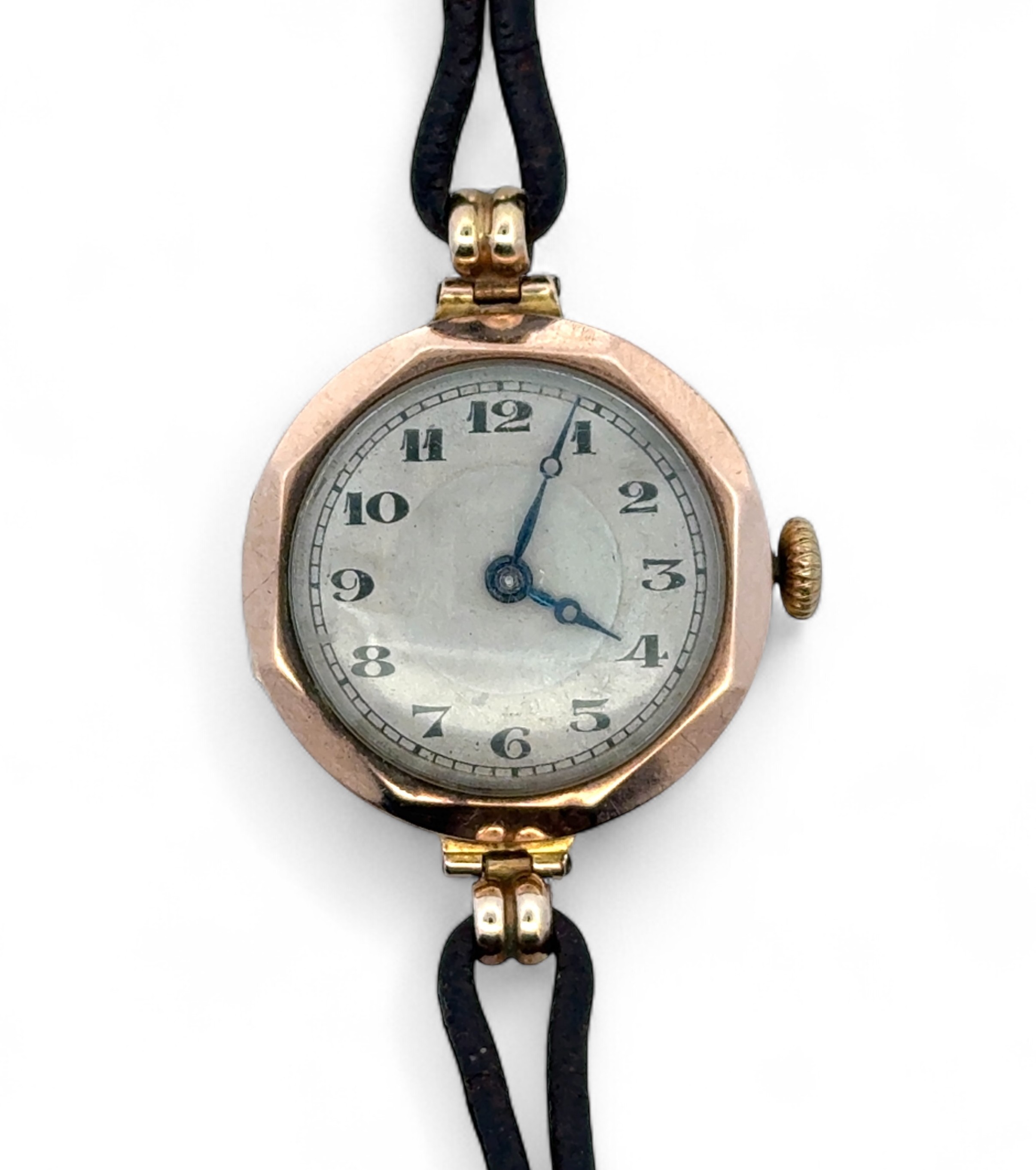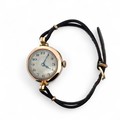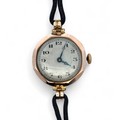 A vintage 1920s 9ct gold watch on a leather cord strap. 1927 hallmarks to inner case, numbered 399131. Watch is winding and ticking.