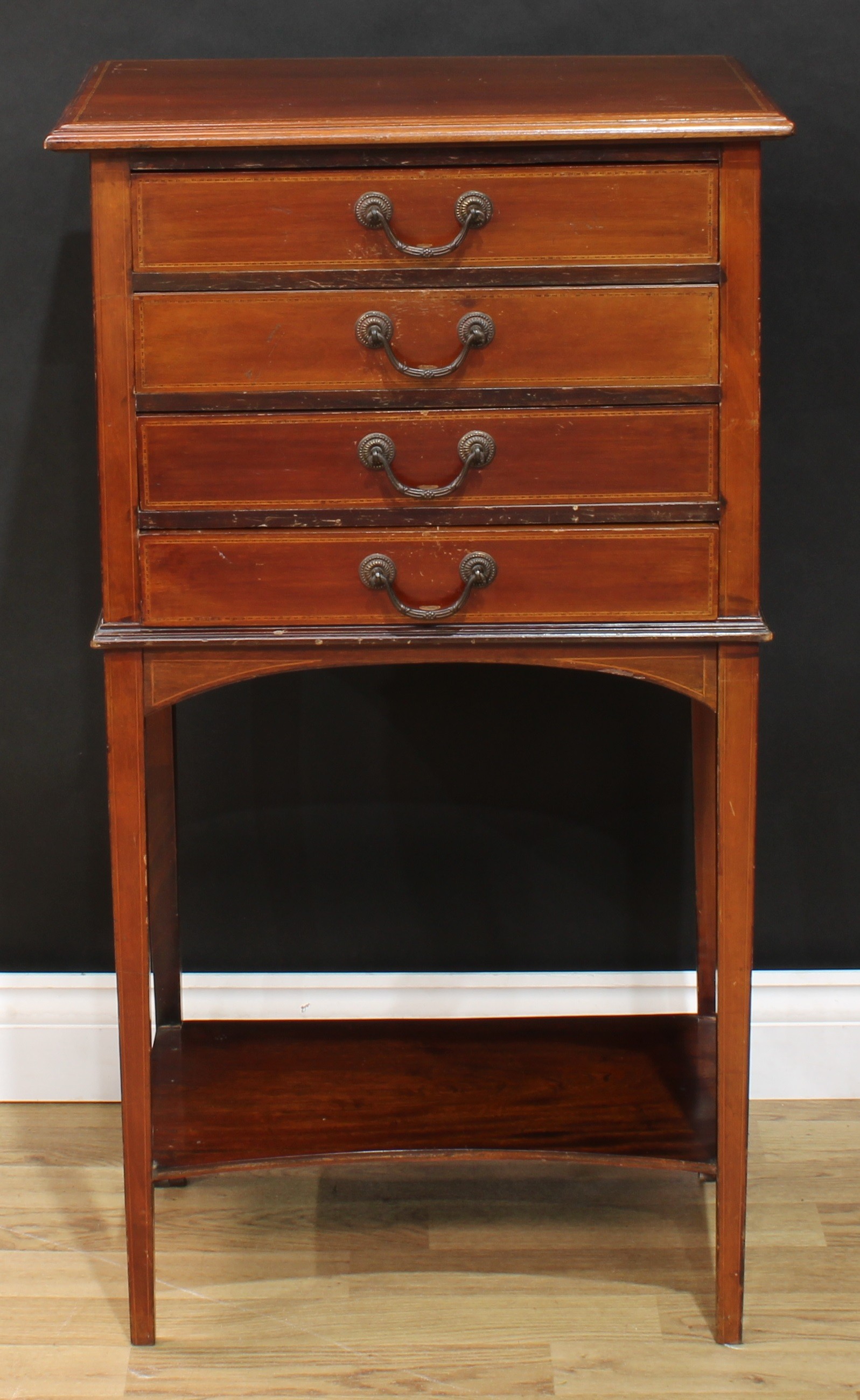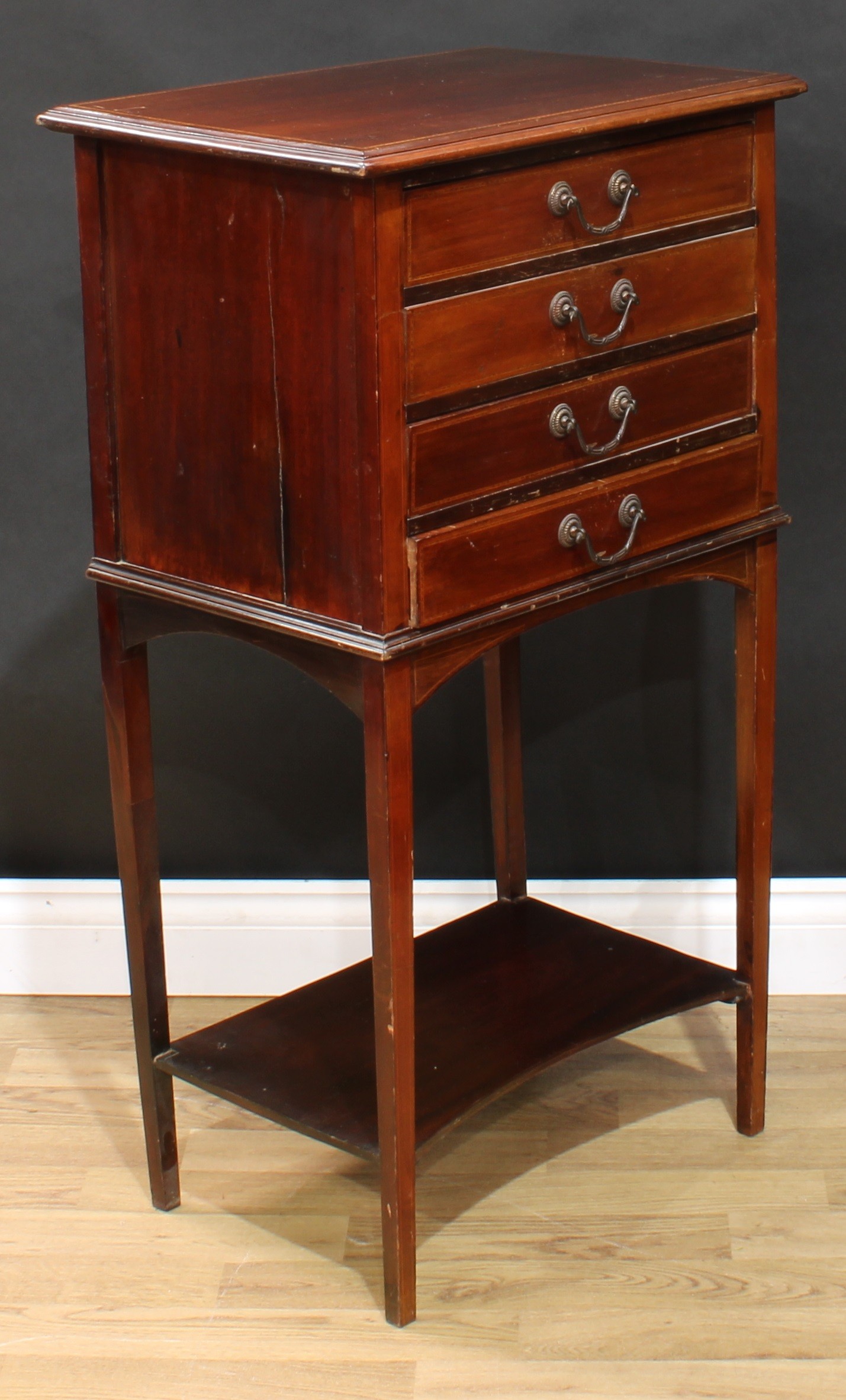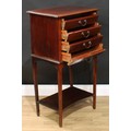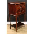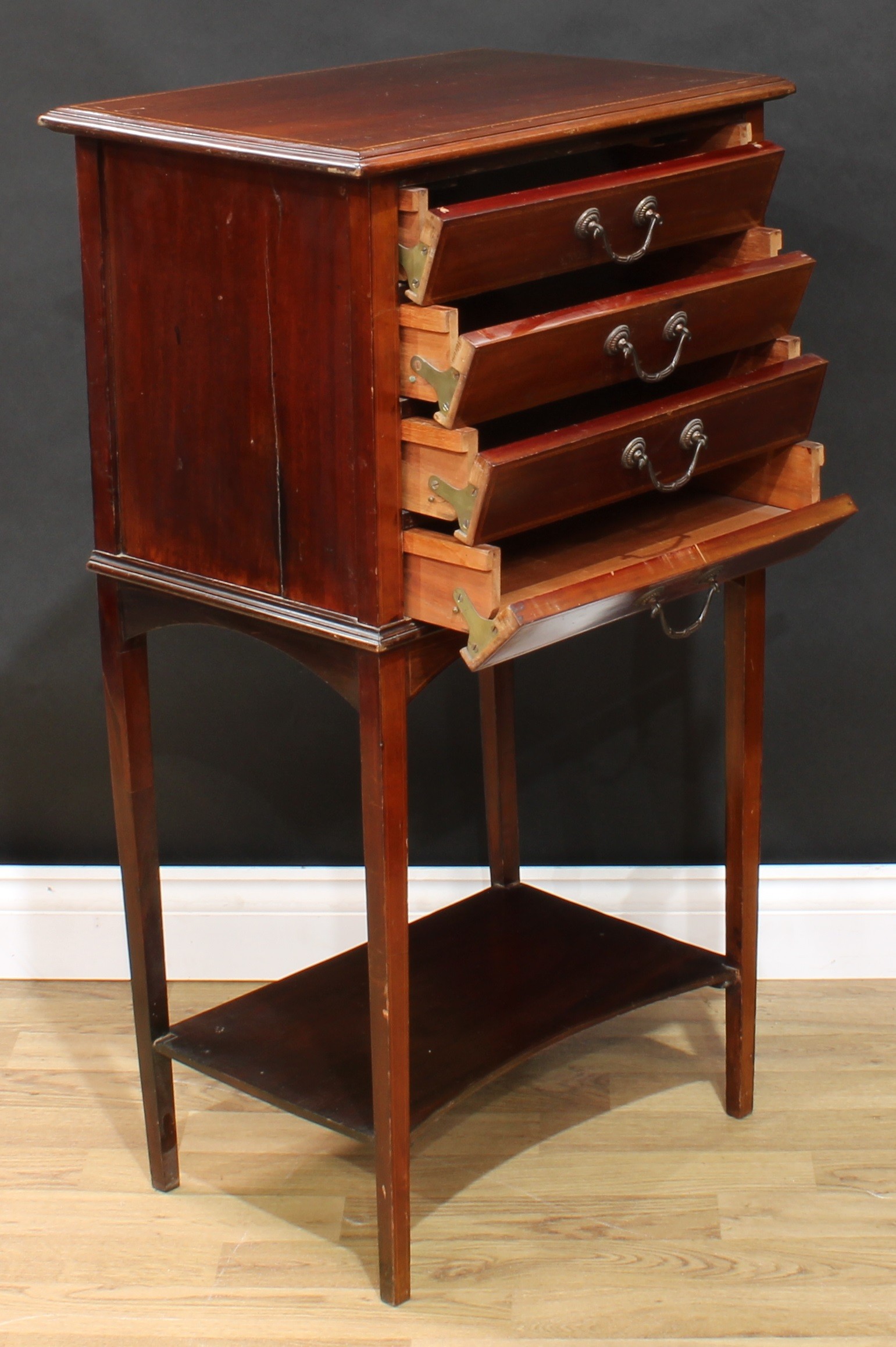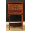 An Edwardian mahogany sheet music room filing chest, rectangular top above four fall front drawers, open incurve undertier, tapered legs, 98cm high, 54.5cm wide, 37.5cm deep