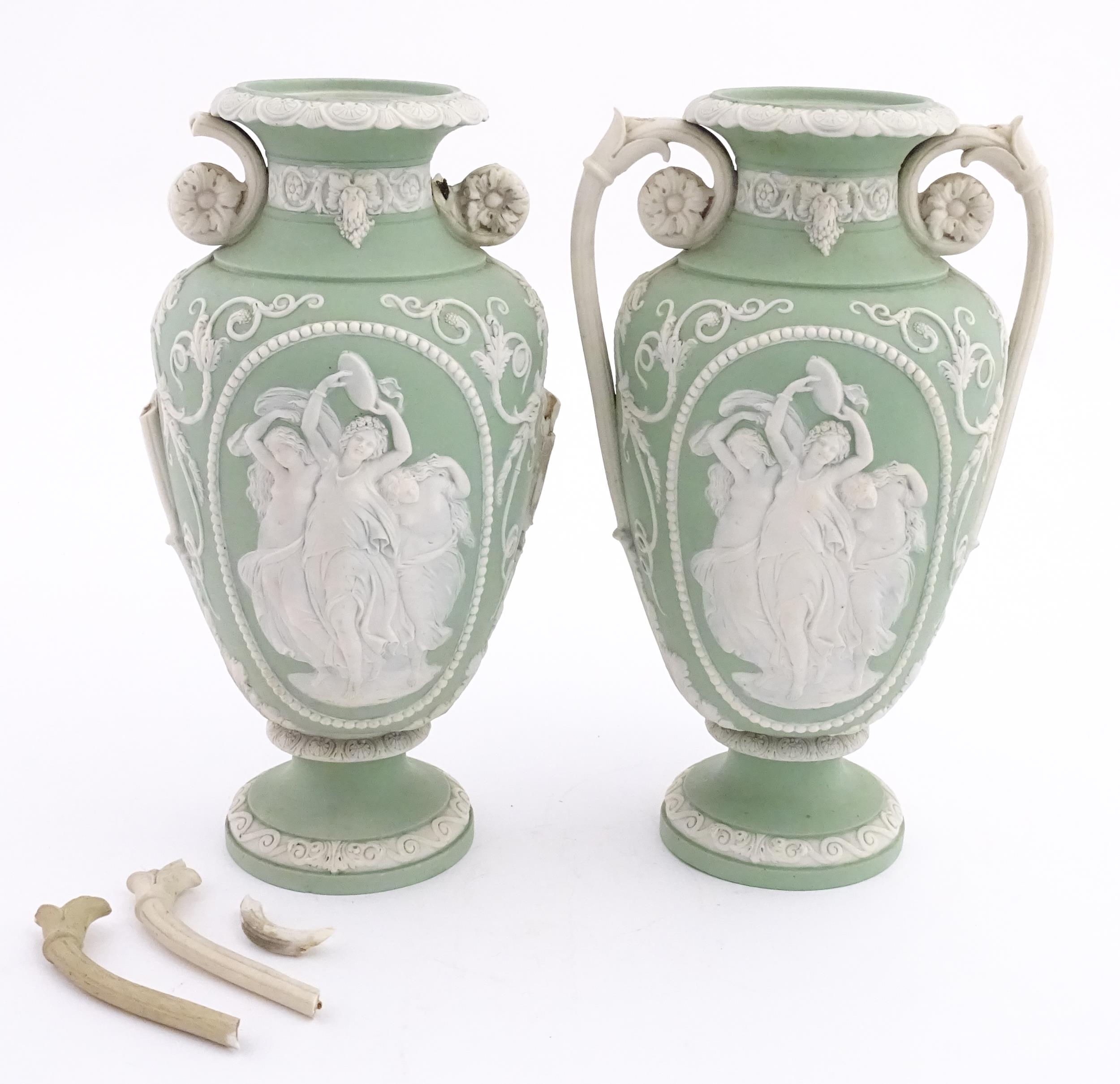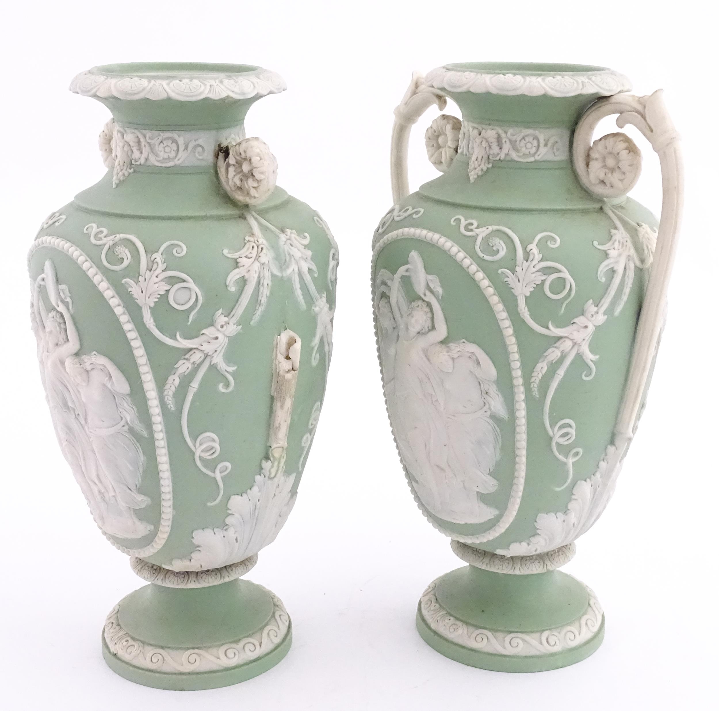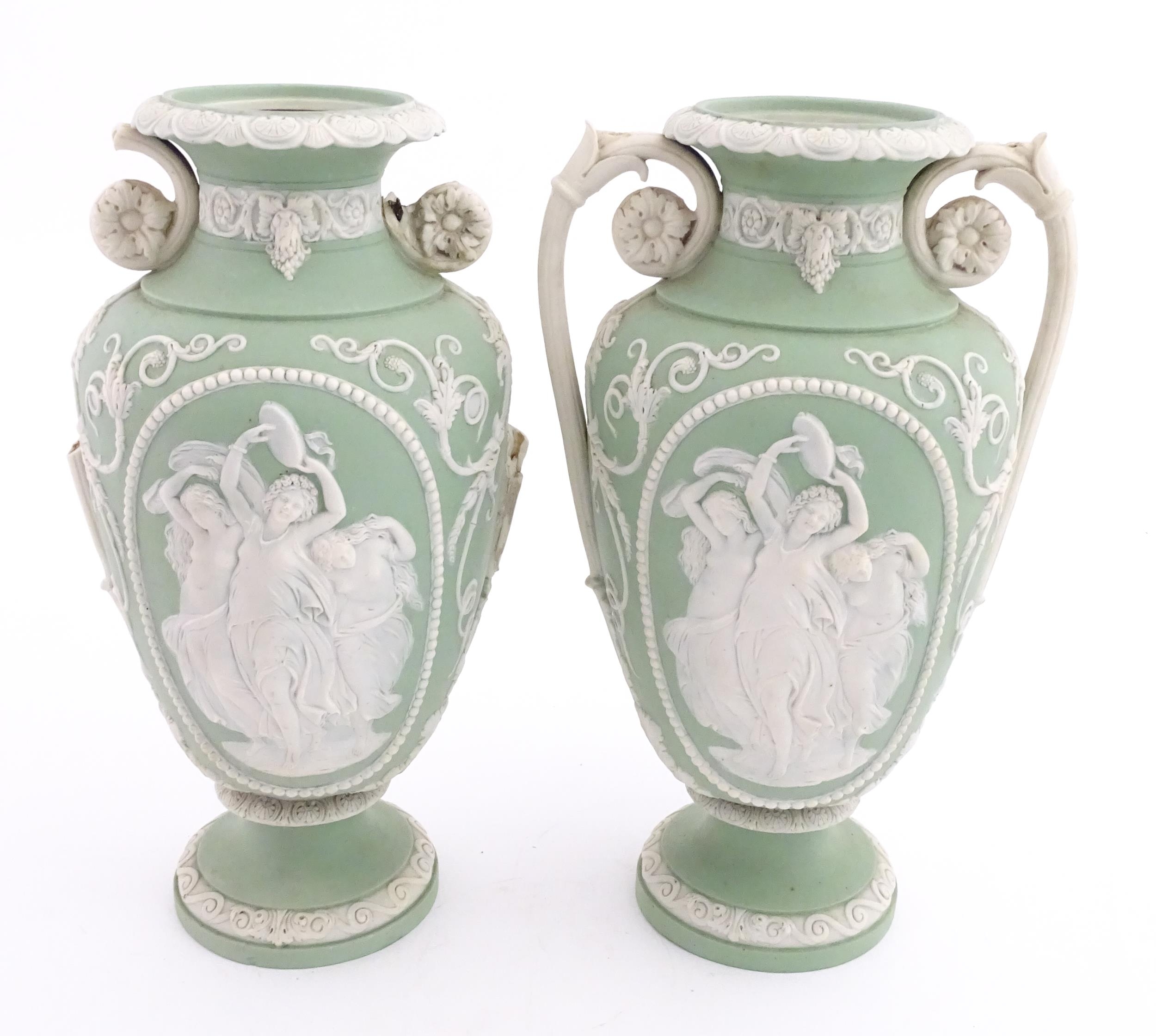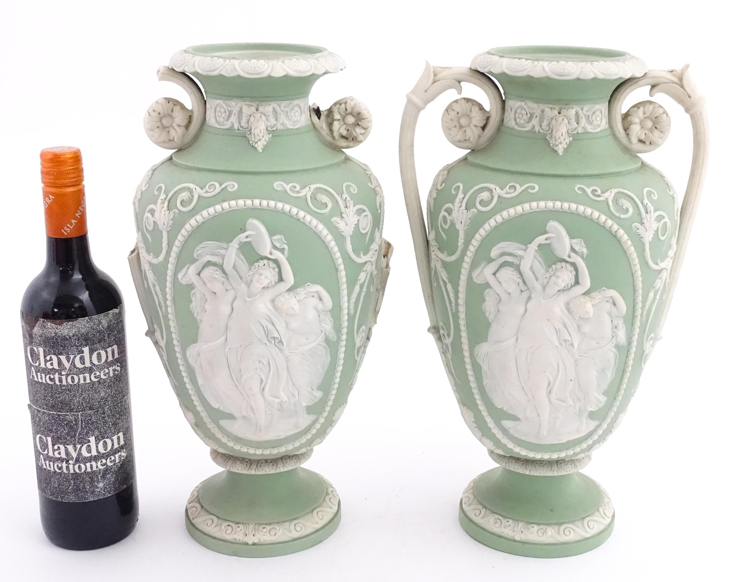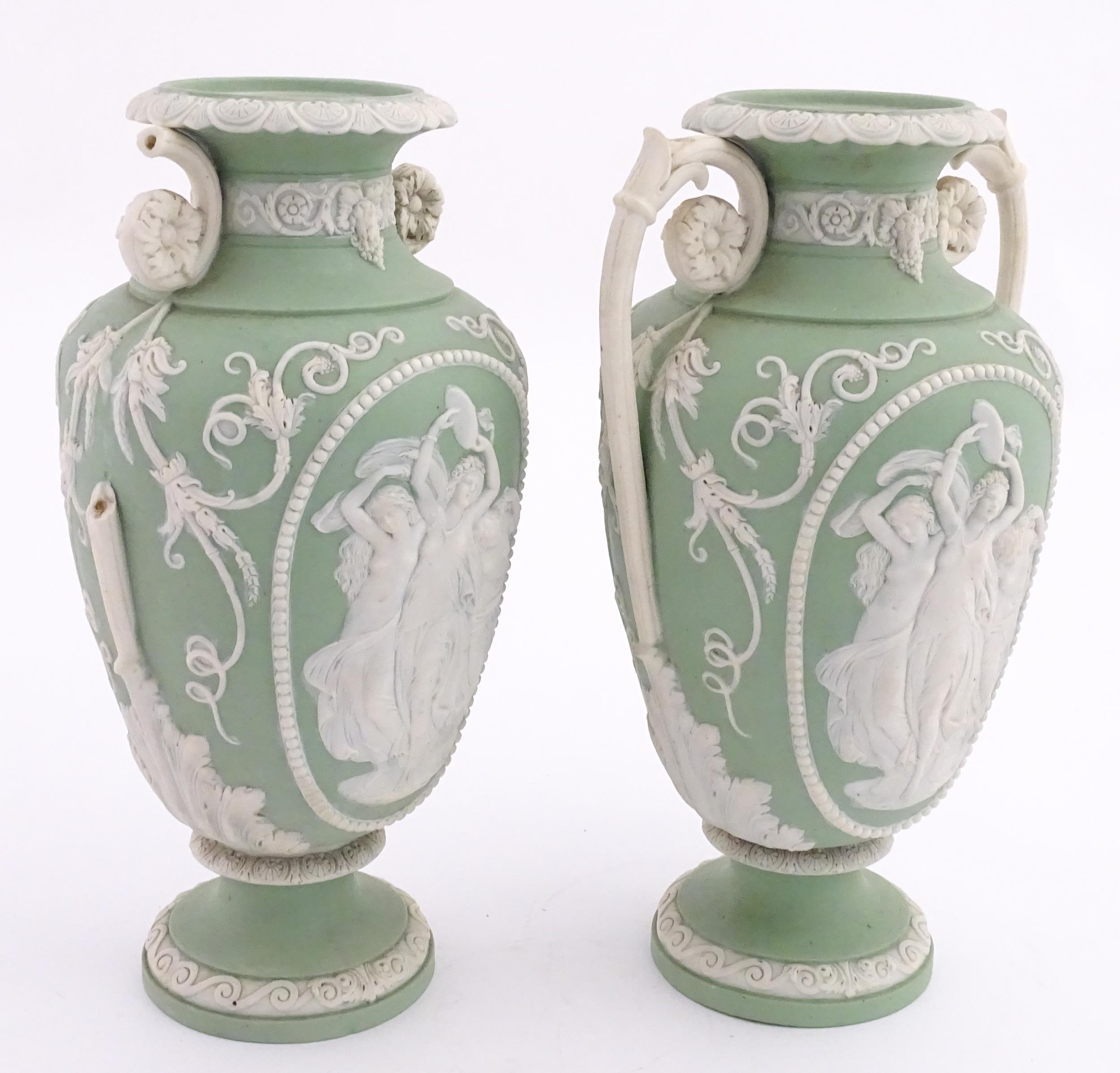 A pair of parian vases in the manner of Wedgwood Jasperware depicting the Three Graces to one side, and a bust in profile to the other. Approx. 14 1/2" high (2)