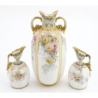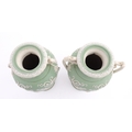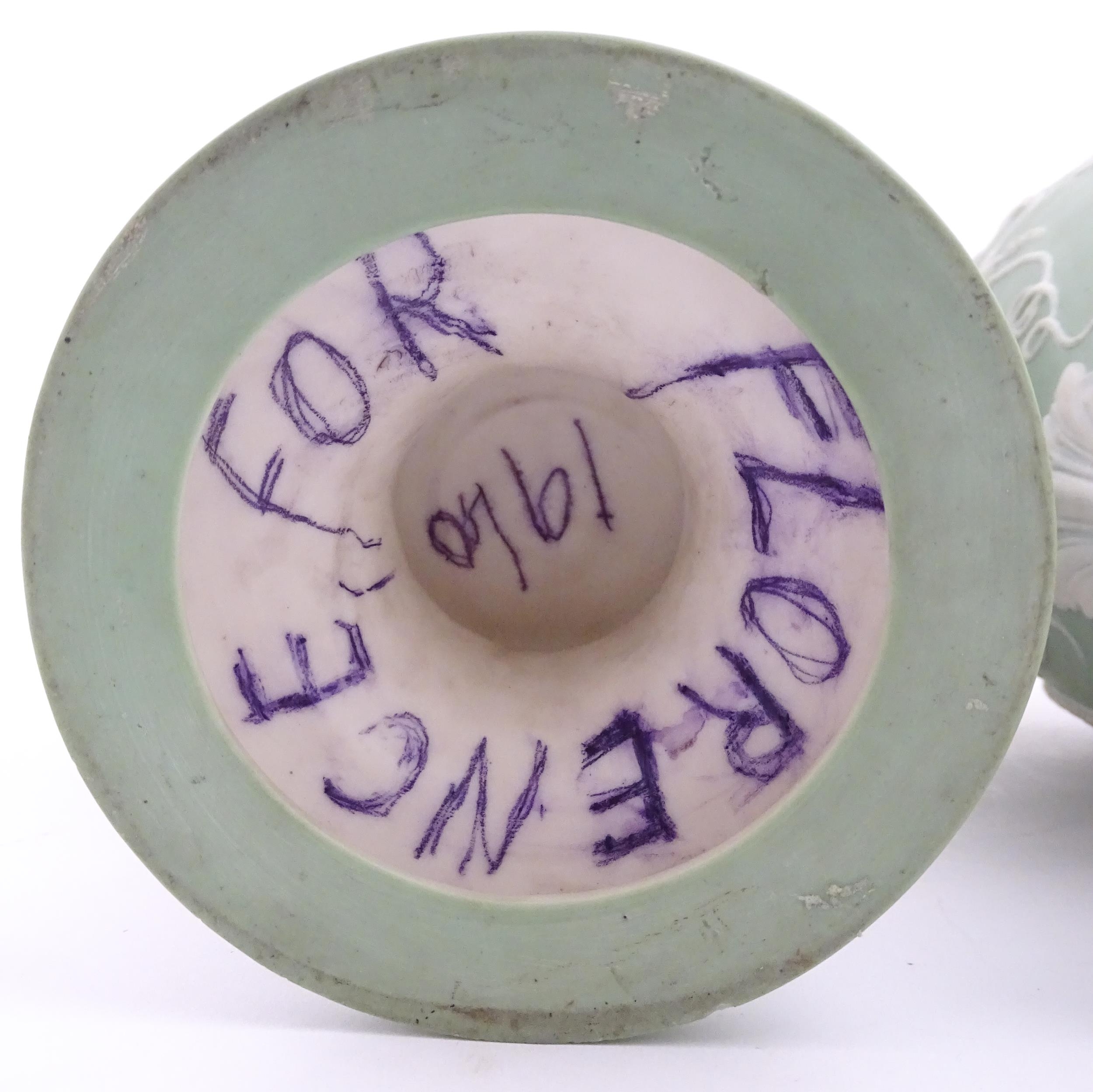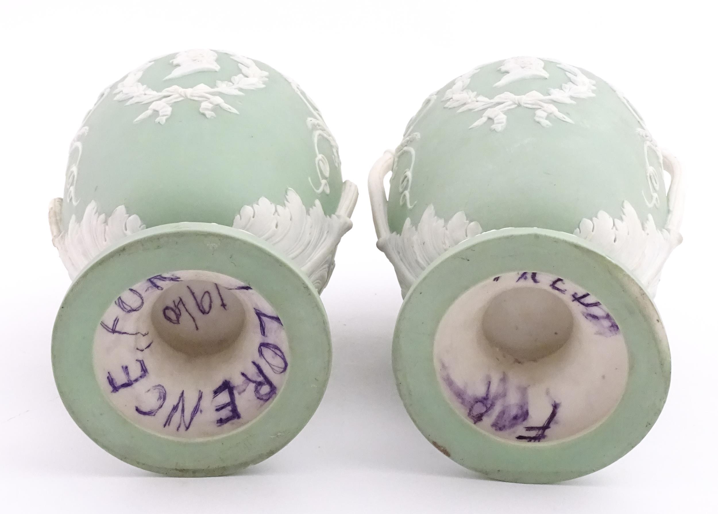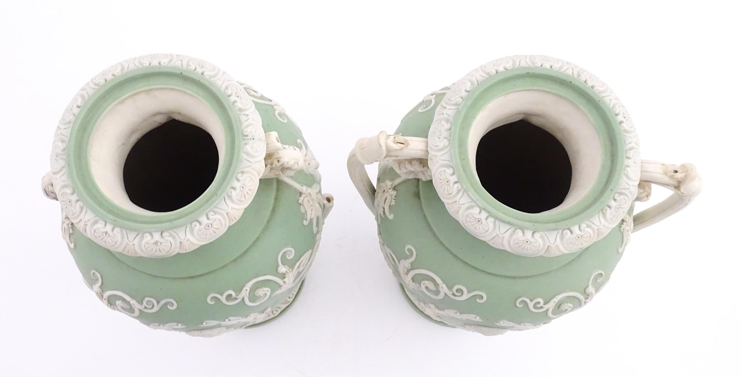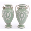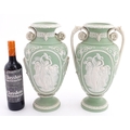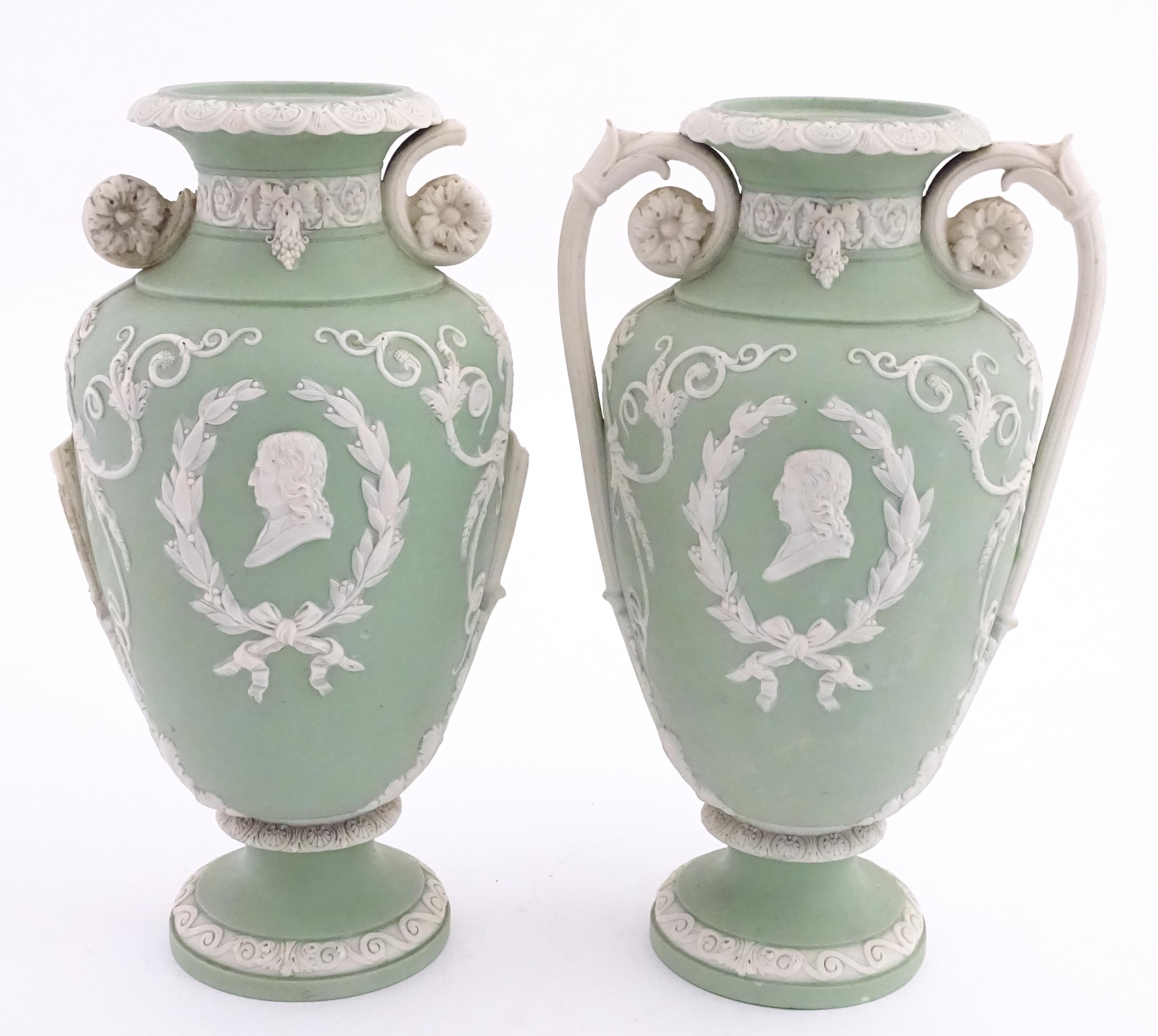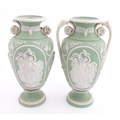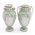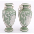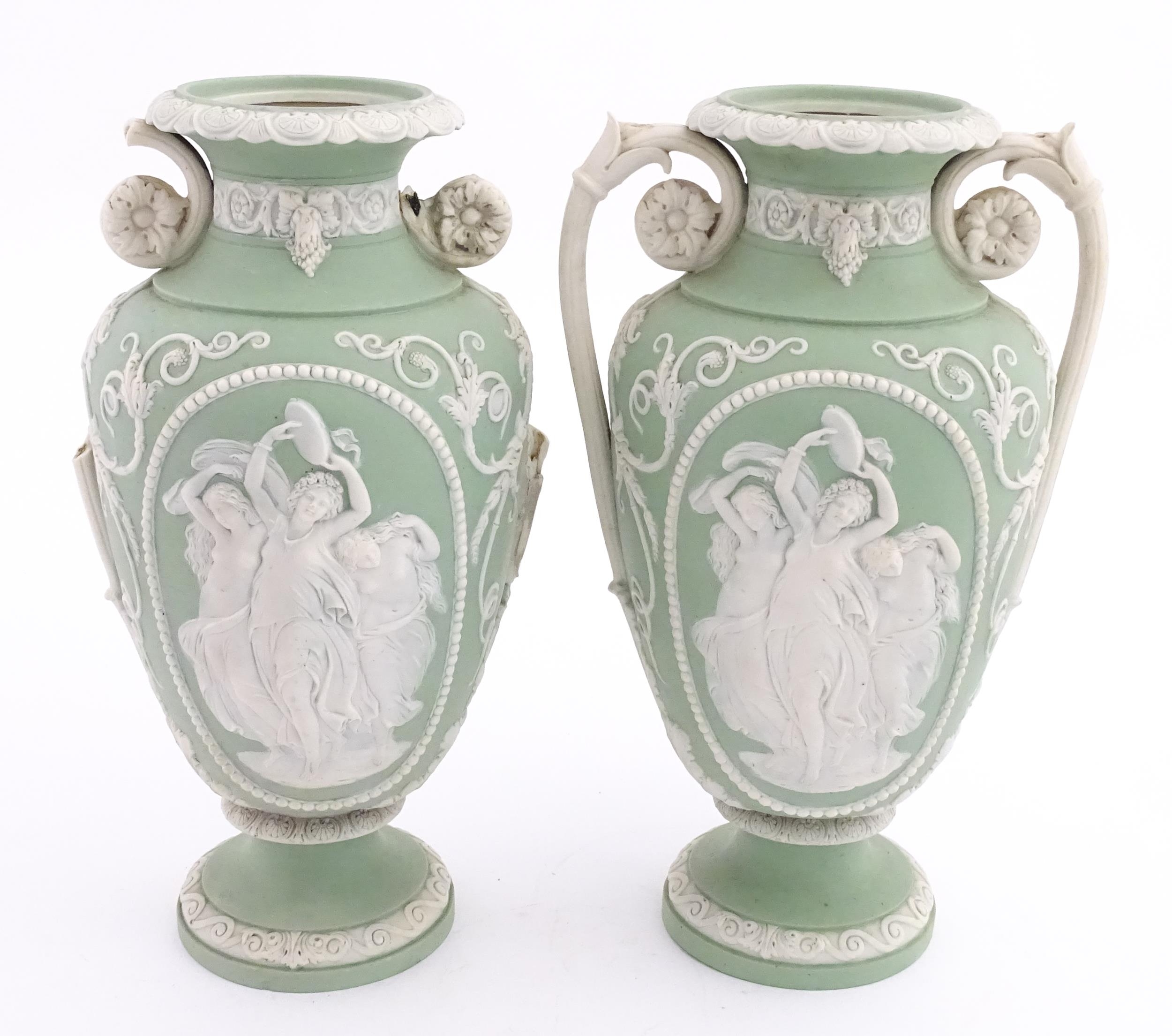 A pair of parian vases in the manner of Wedgwood Jasperware depicting the Three Graces to one side, and a bust in profile to the other. Approx. 14 1/2" high (2)