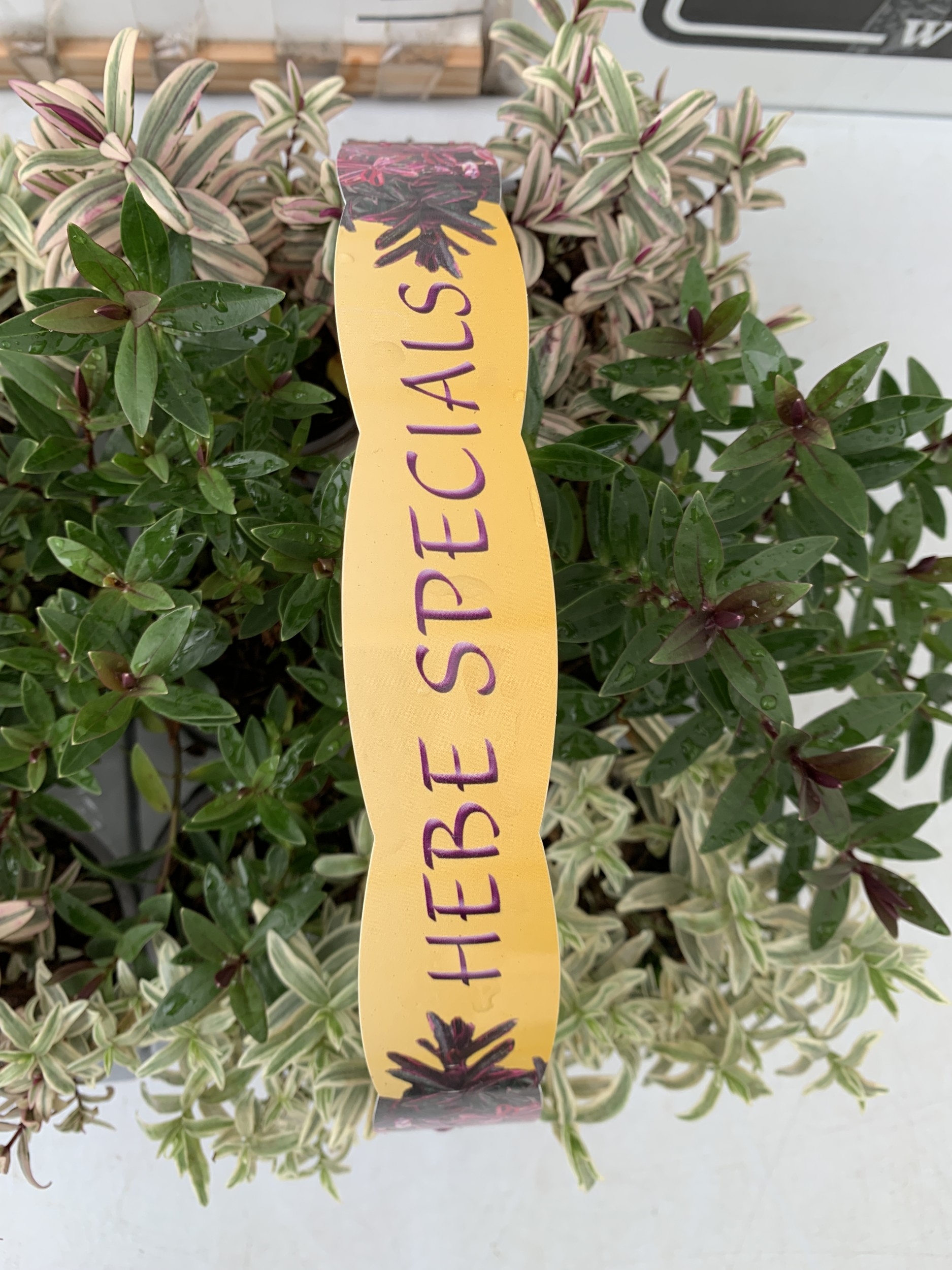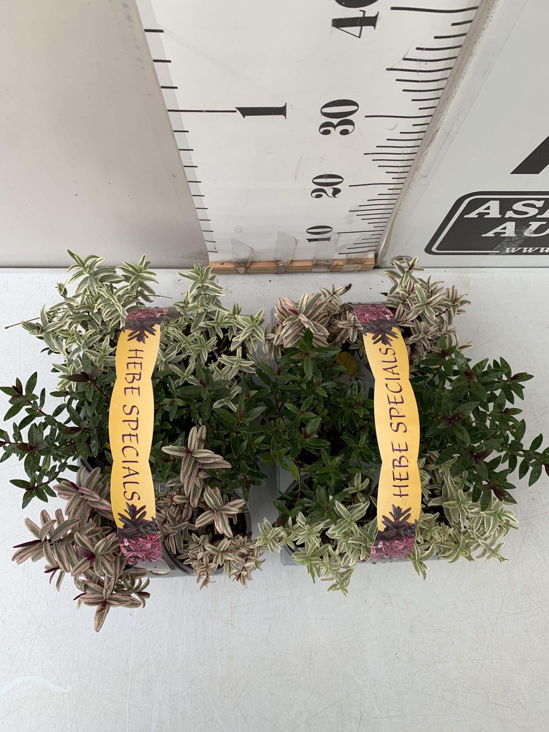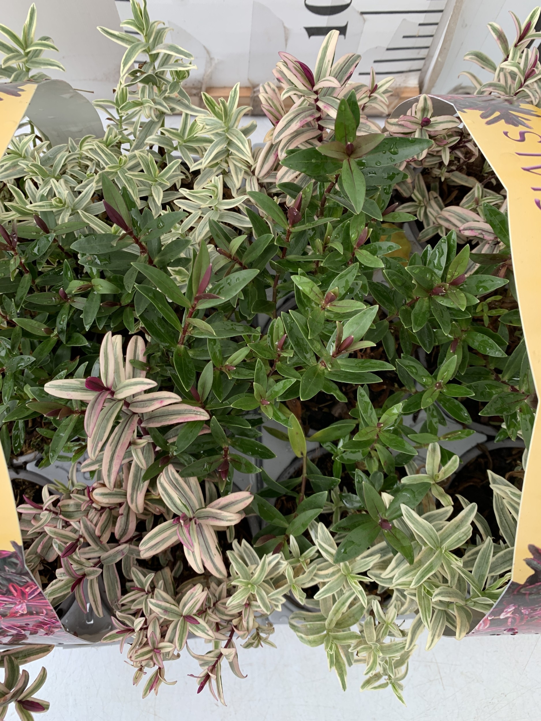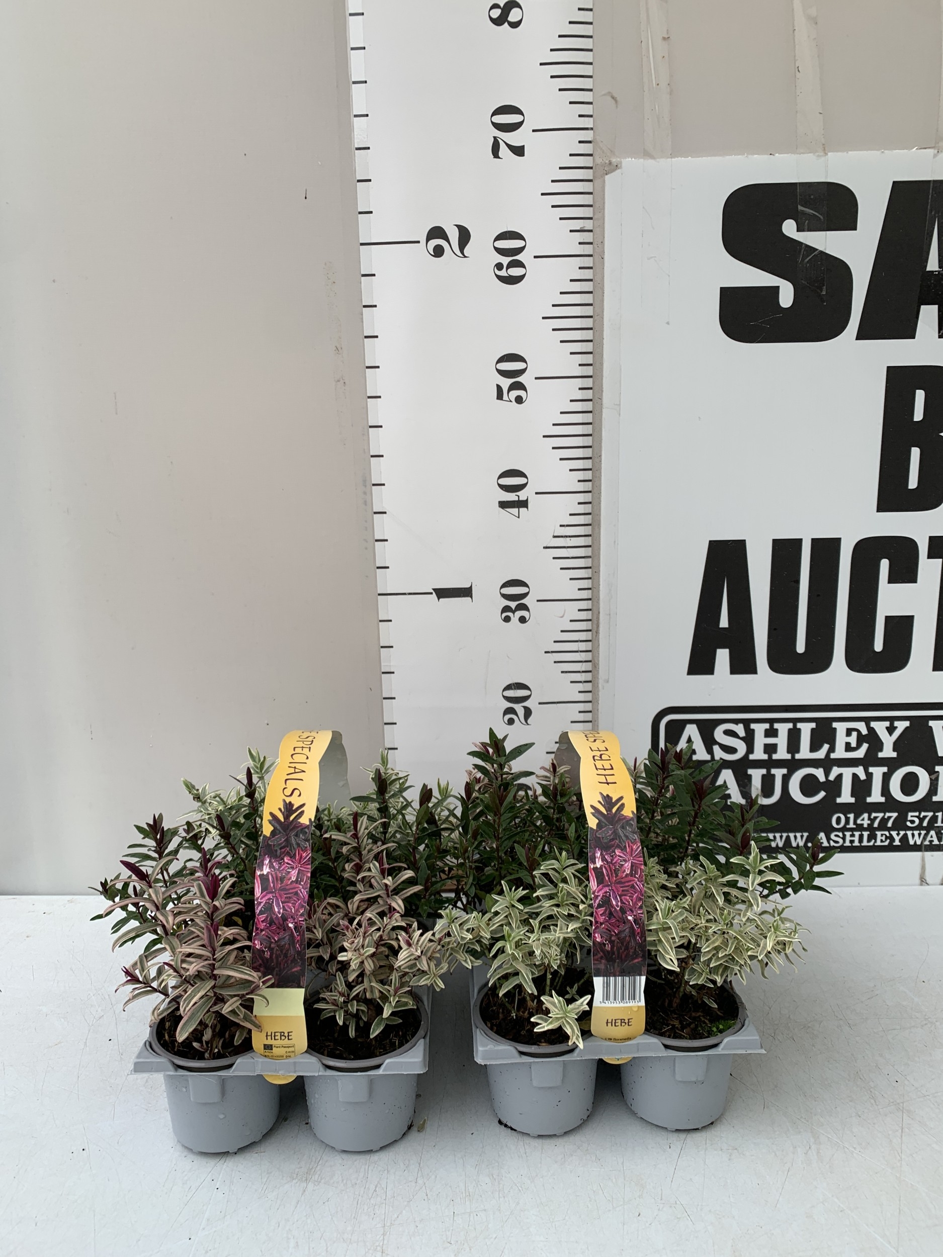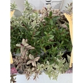 TWELVE SPECIAL MIXED VARIETIES OF HEBES IN TWO CARRY PACKS. BETWEEN 10-20CM TALL. TO BE SOLD FOR THE TWELVE