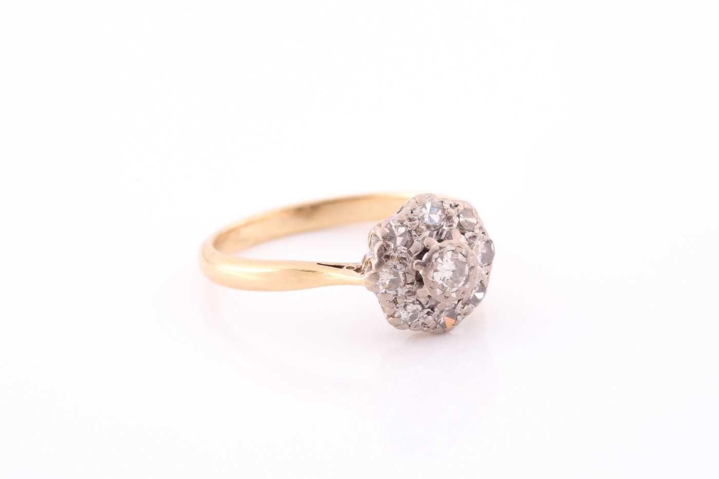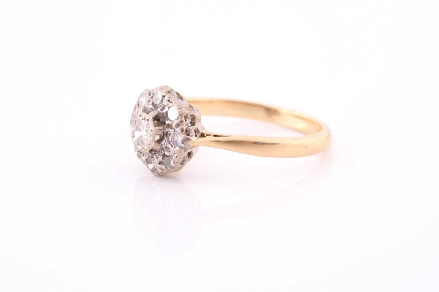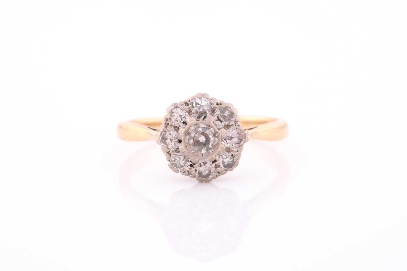 An 18ct yellow gold and diamond cluster ring, set with round eight-cut diamonds, the central stone approximately 0.10 carats, cluster diameter 1cm, size Q, 4.2 grams.