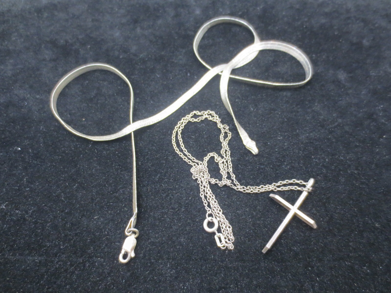 A sterling silver ribbon necklace and a white metal crucifix on a sterling silver chain, total weight 11.54g