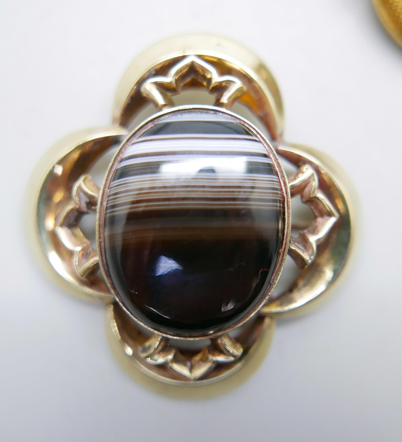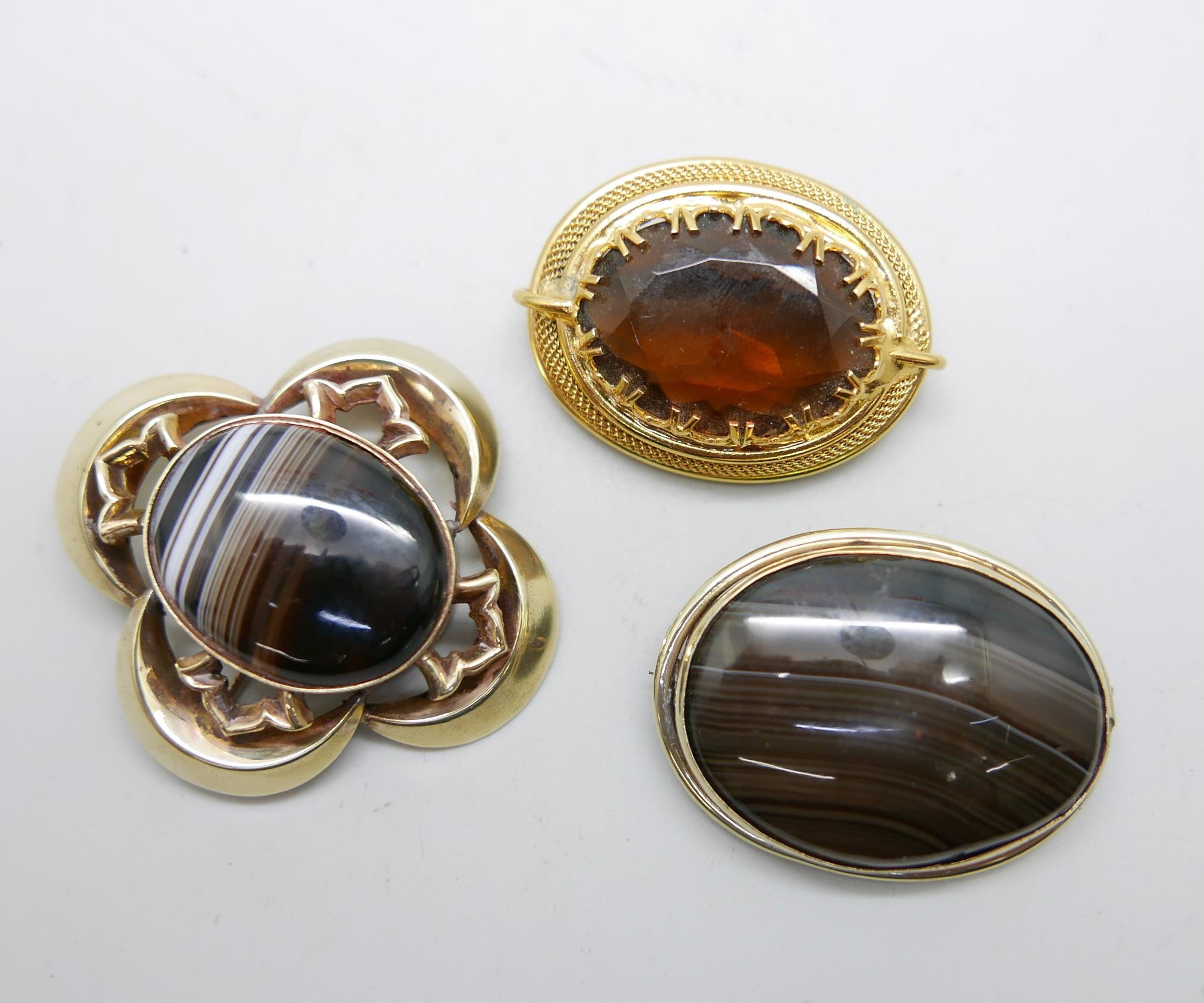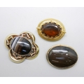 Two Victorian agate brooches and a yellow stone set brooch, largest 5cm