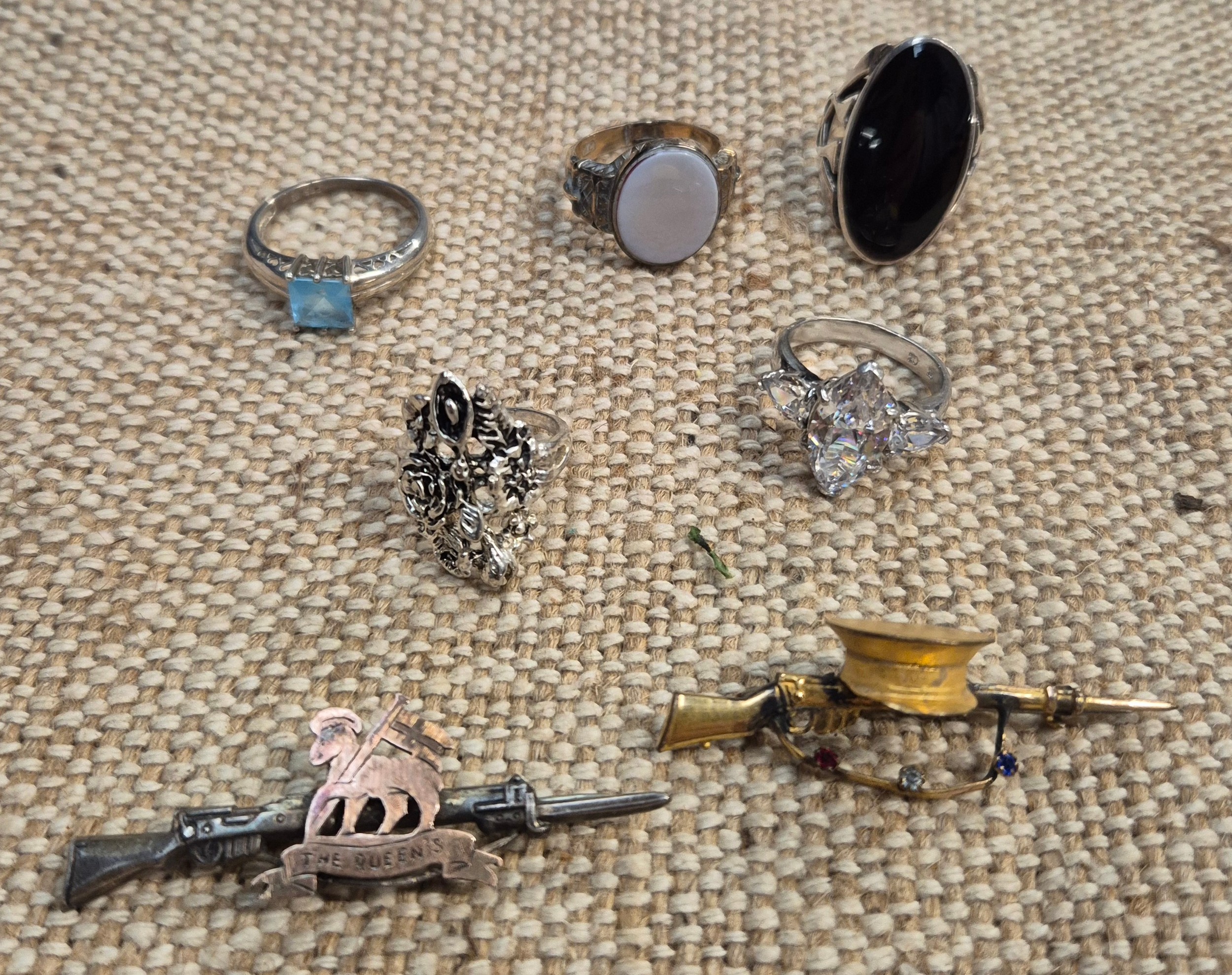 A group of various rings & 2 military brooches.