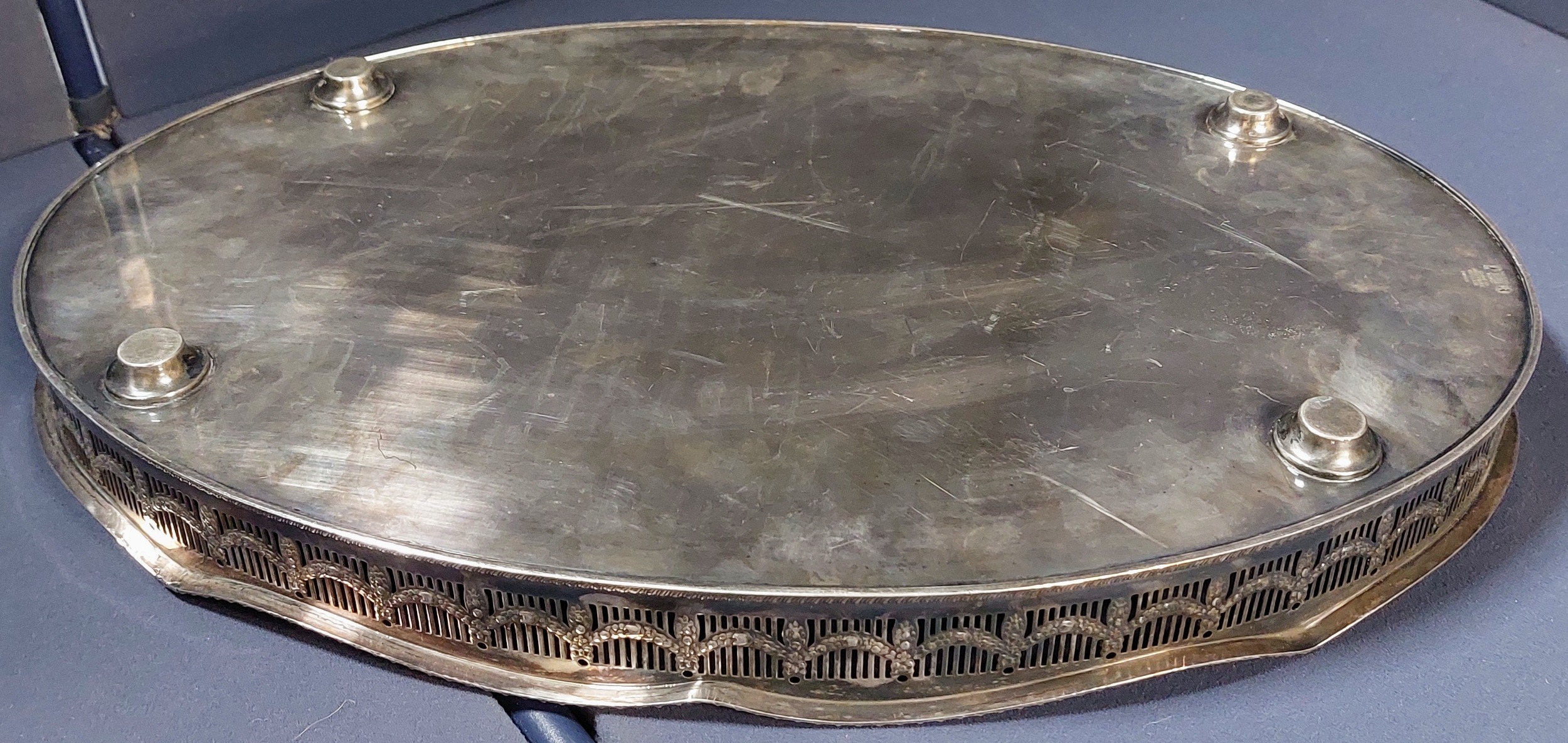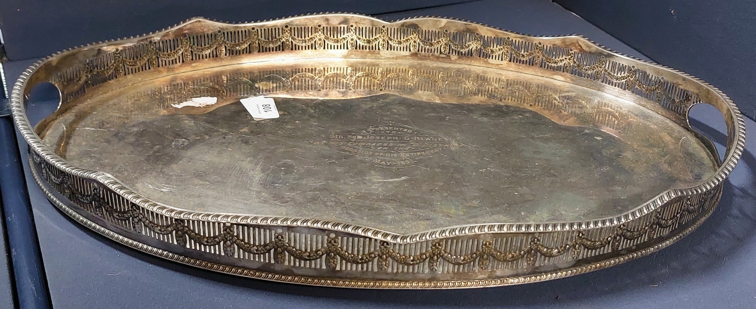 Large Pierced Gallery Silver Plate Tray with Inscription - C. 56cm W x 37cm D