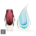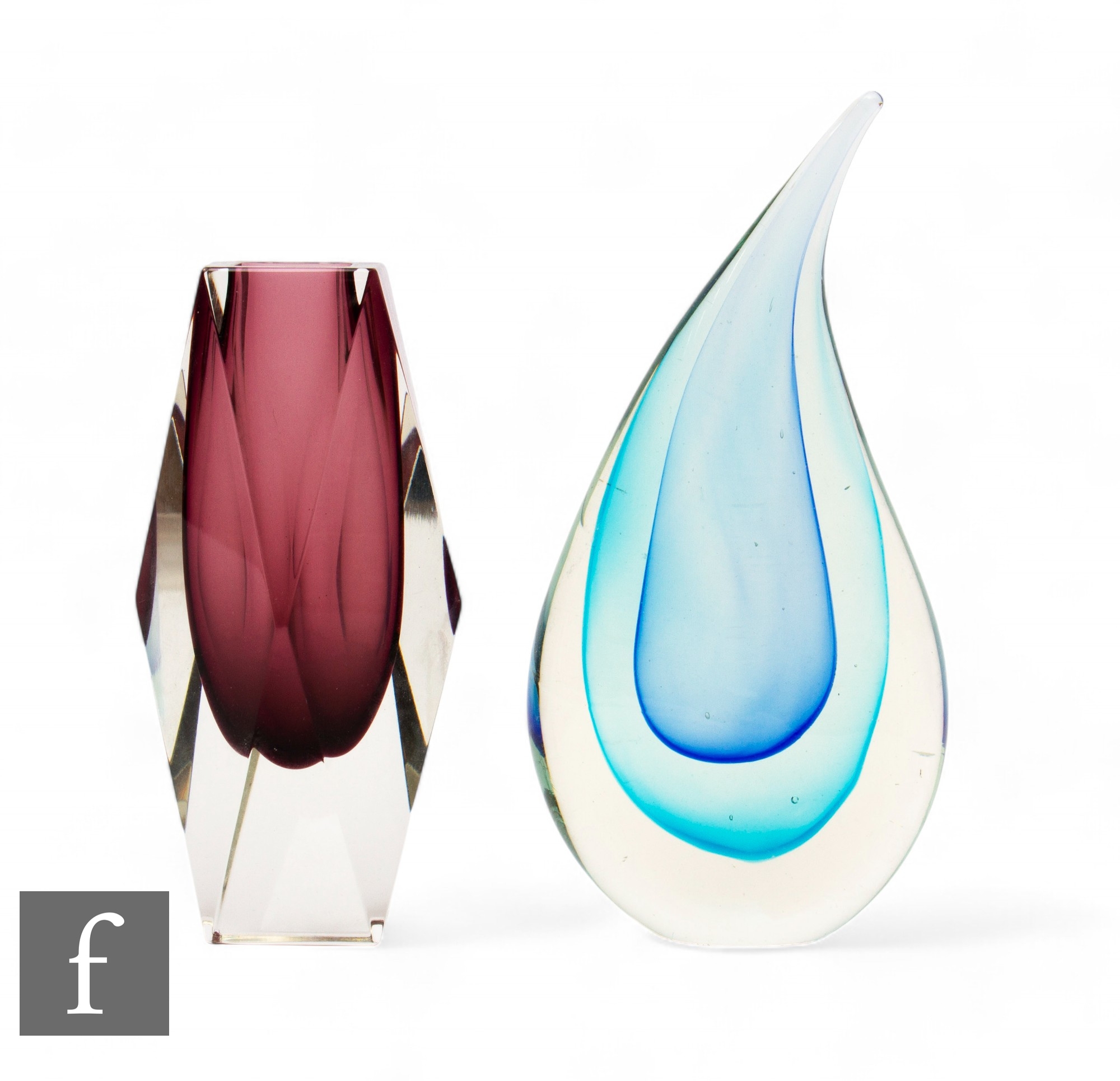 Unattributed maker - A post war Murano glass sculpture of tear drop form, the sommerso body with a deep blue core cased in aqua and clear, height 20.5cm, together with a vase of diamond faceted form with amethyst core. (2)