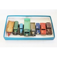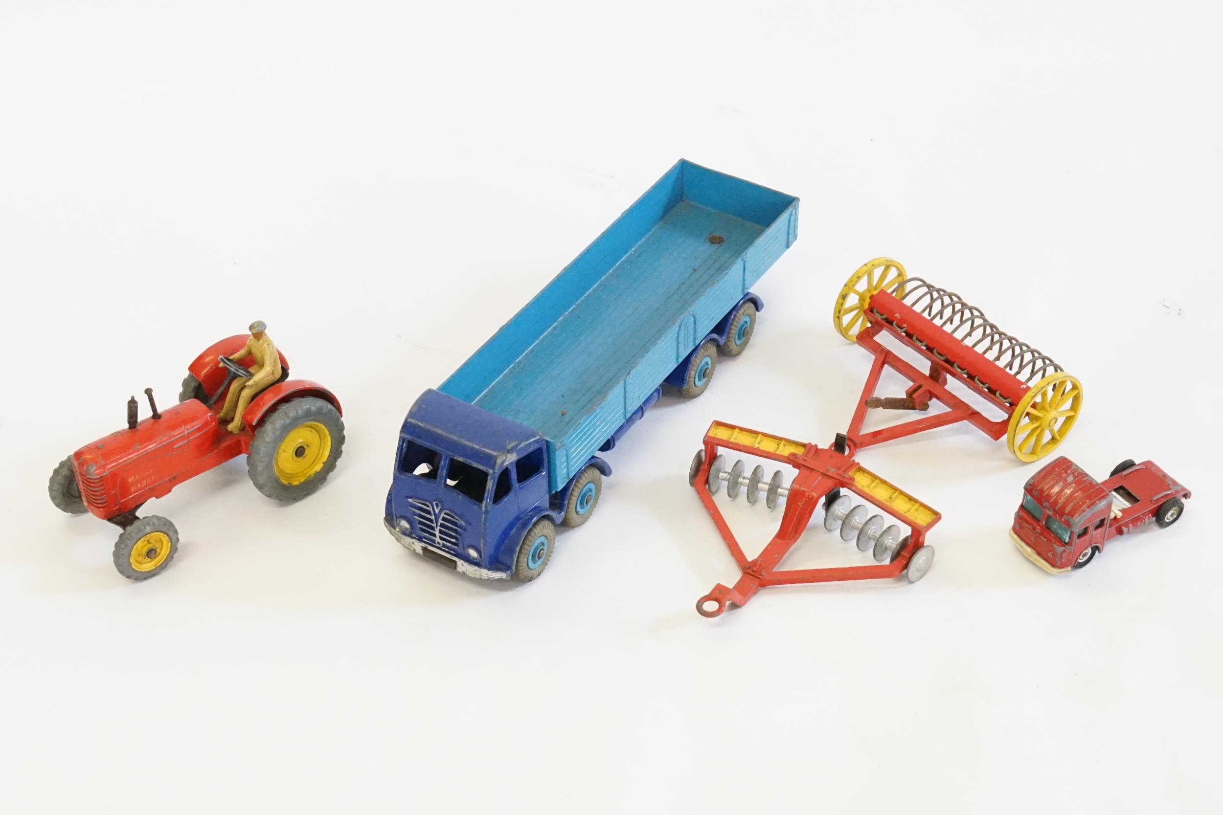 A Dinky No: 901 "Foden Wagon" (2nd Type) finished in Dark Blue & Light Blue in Good Original Condition along with a Tractor, Hay Rake & a Disc Harrow.
