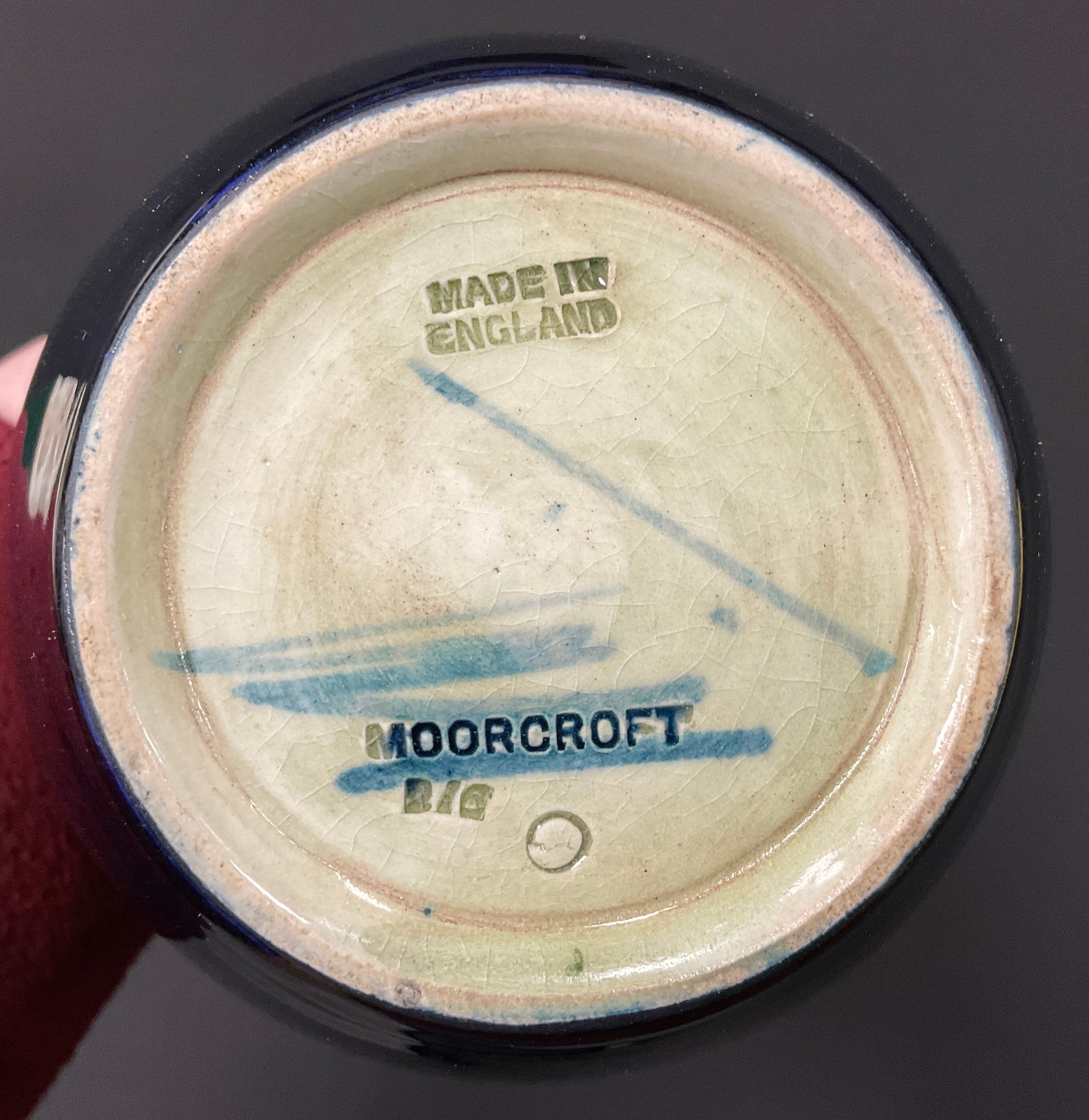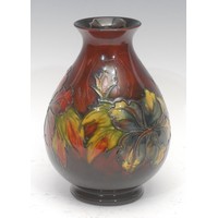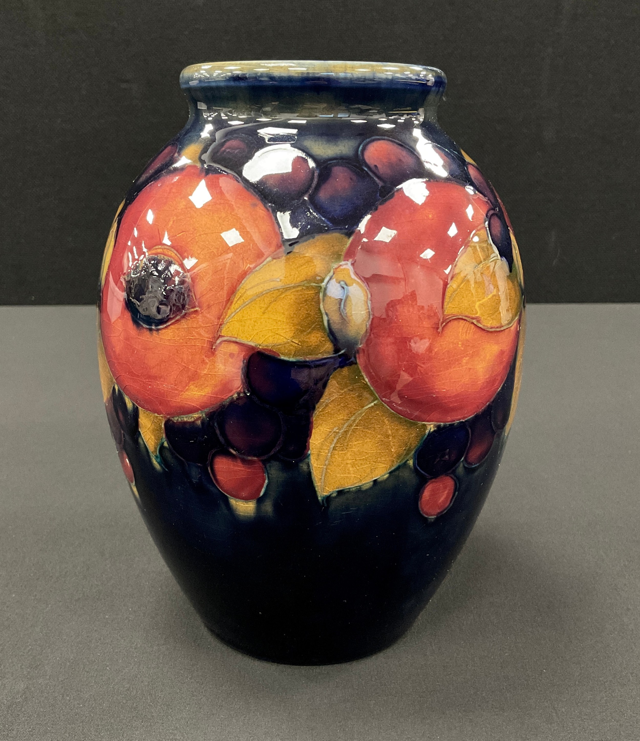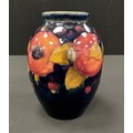 A Moorcroft Pottery Pomegranate pattern ovoid vase, tube lined with Pomegranates, Berries and Leaves on a deep blue ground, impressed marks, painted signature, 16.3cm high