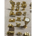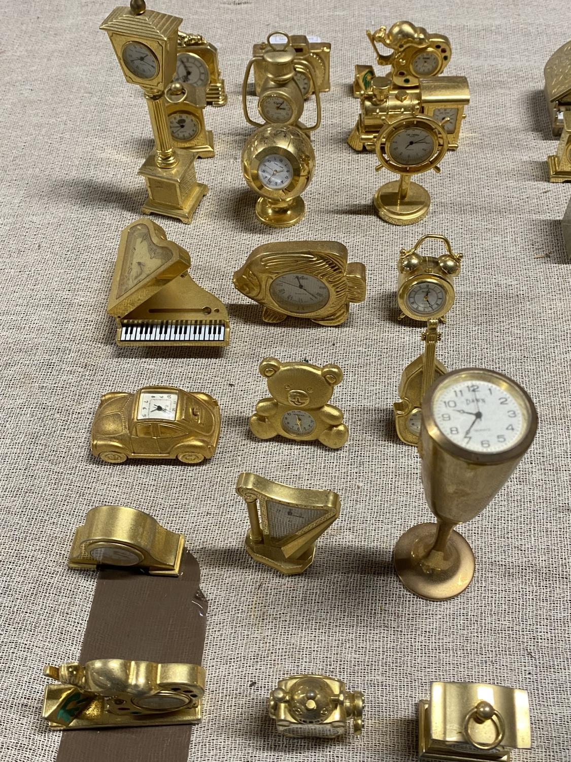 A large selection of novelty miniature brass time pieces, shipping unavailable