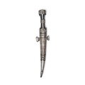 A Caucasian kindjal, also known as a kama, featuring a straight, double-edged steel blade that tapers to a needle point. The blade exhibits a surface pattern consistent with pattern-welded construction. The waisted I-shaped hilt is constructed with a dark wood grip and silver mounts. The silver bolster and pommel are decorated with filigree work, granulated borders, and raised hemispherical studs. A central silver band on the hilt features a repeating geometric pattern. The accompanying scabbard is fully encased in silver and decorated with alternating bands of filigree, granulation, and engraved geometric motifs. The lower portion of the scabbard displays two panels of niello inlay depicting stylized scrolling foliate designs. The scabbard is fitted with two swivel suspension rings and terminates in a ribbed, conical chape finial.