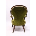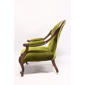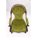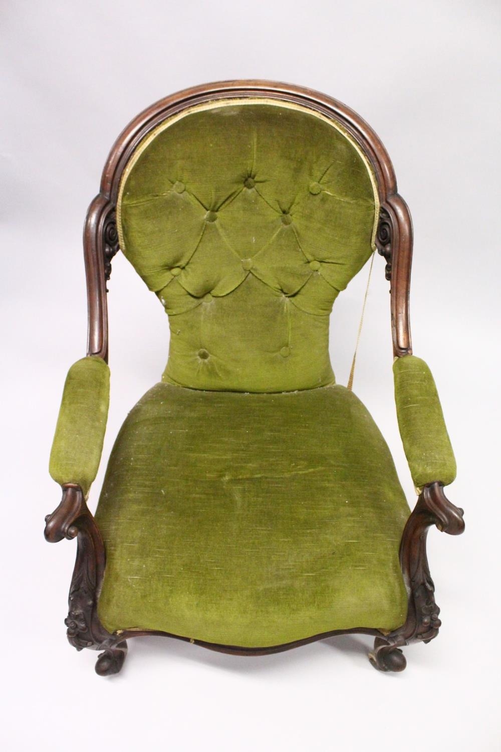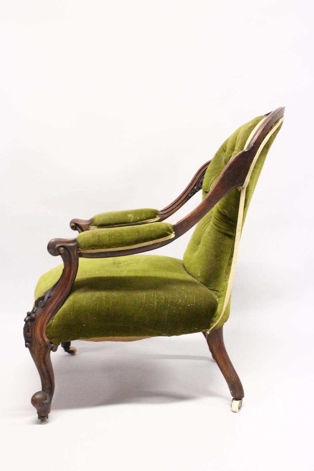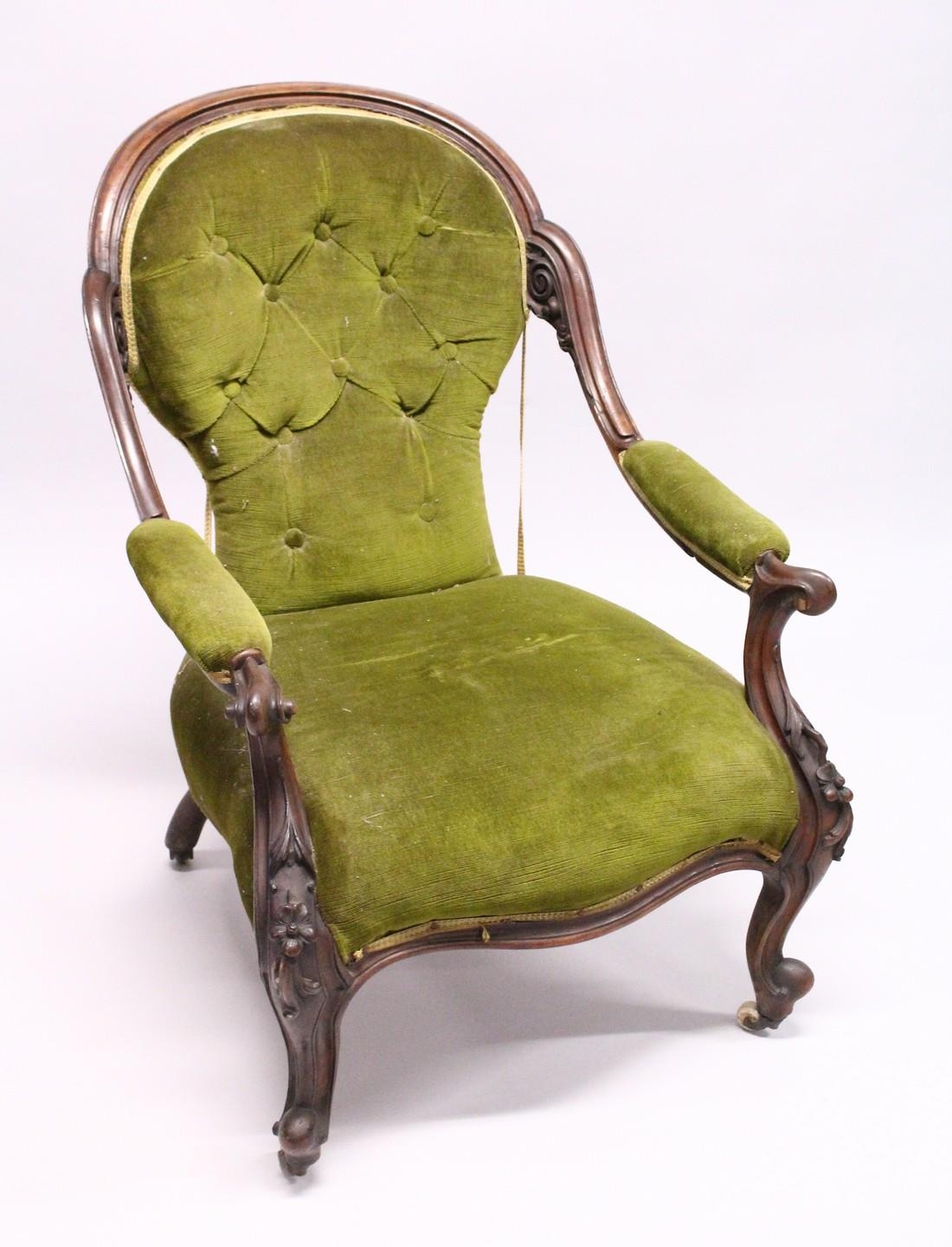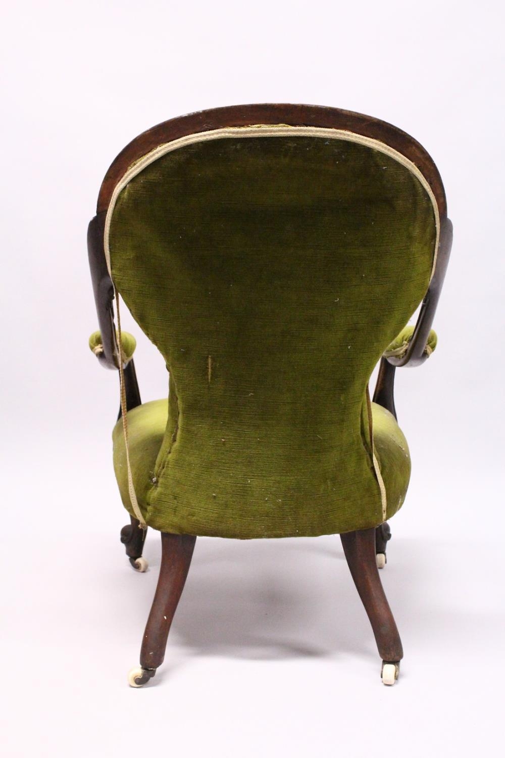 A VICTORIAN MAHOGANY SHAPED BACK ARMCHAIR, open arms, serpentine fronted seat on cabriole legs with white porcelain casters.