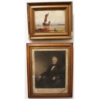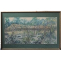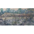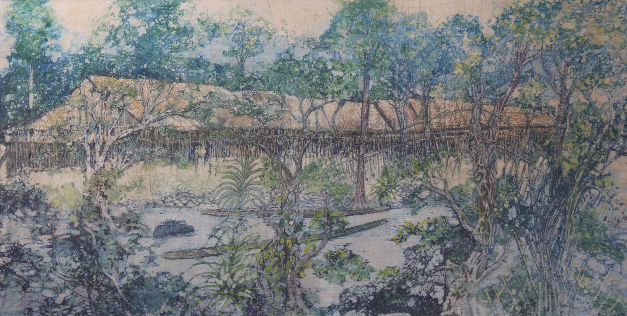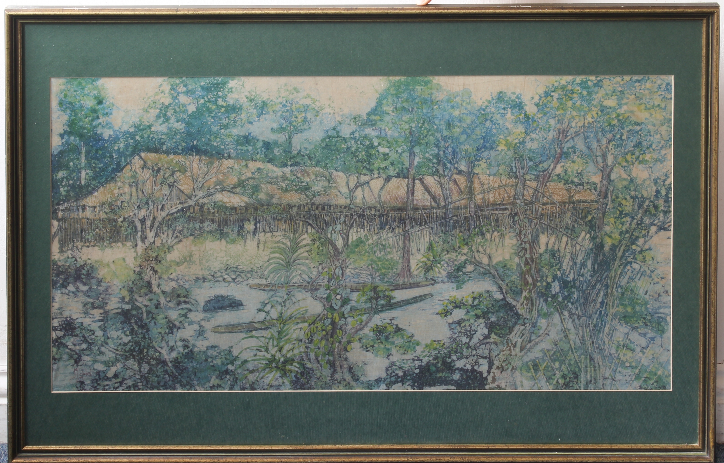 MICHAEL LIM - a large coloured Singaporean batik depicting long narrow boat upon a river before large roofed building, wooden fences and various trees, the work signed lower left ( 50cm x 92.5cm). Framed and glazed.