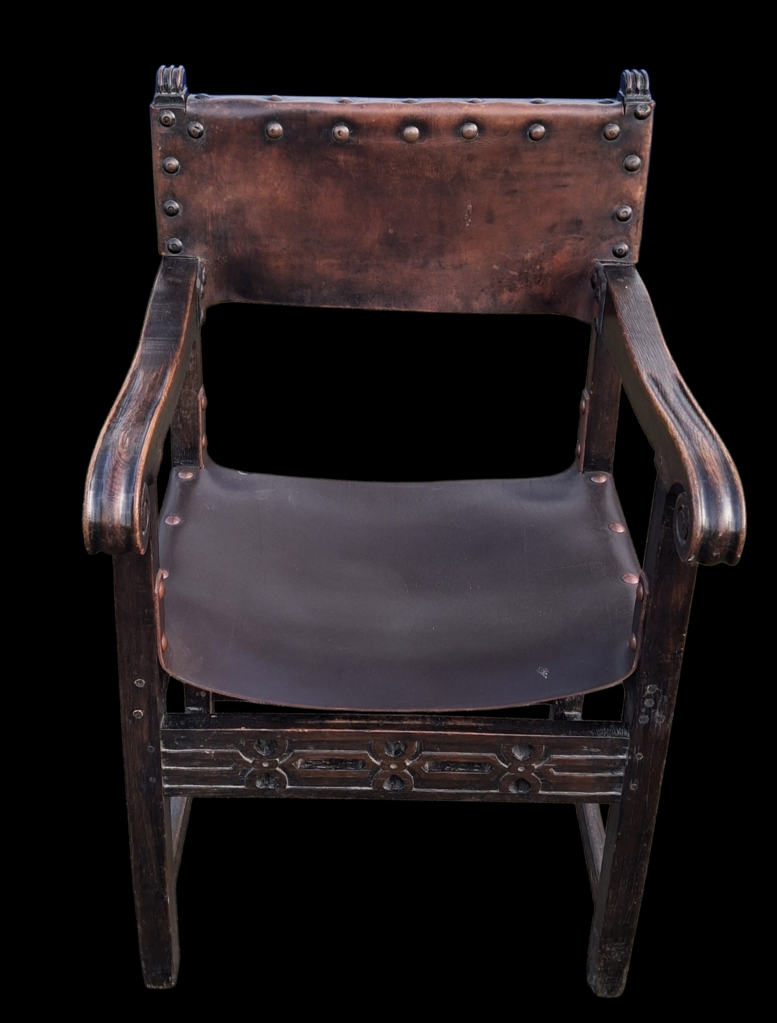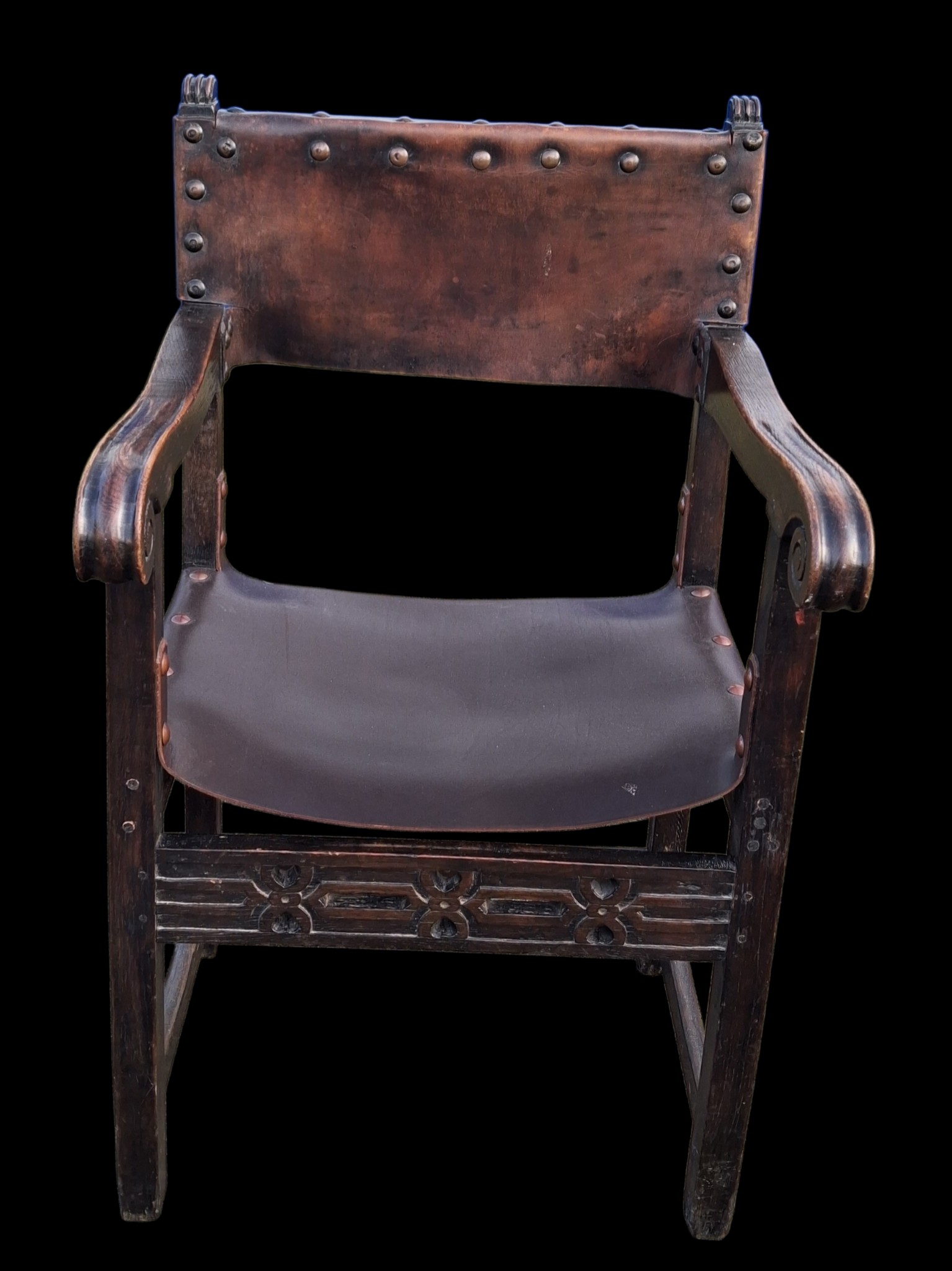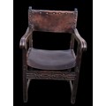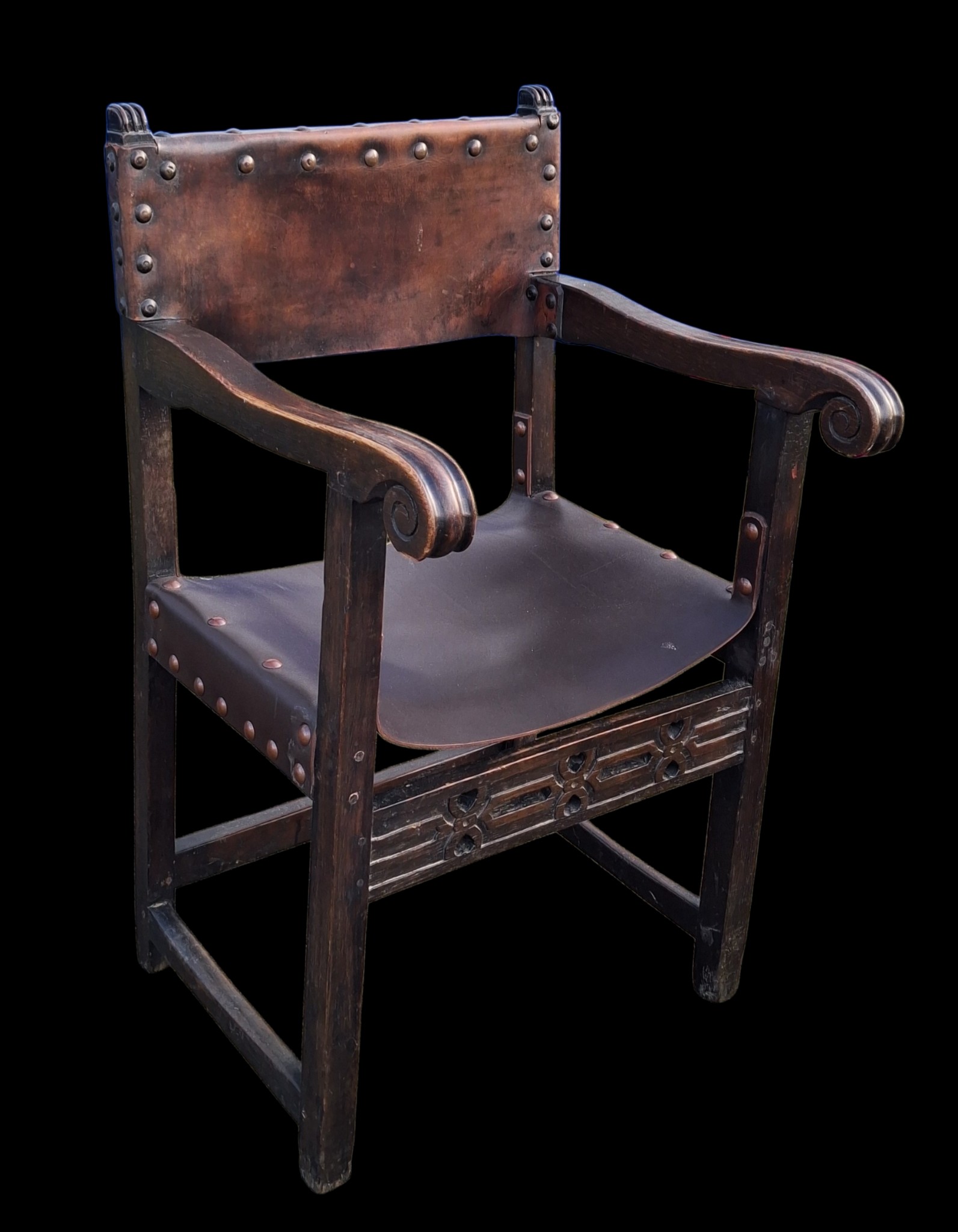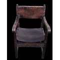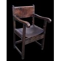 AN ANTIQUE CARVED OAK CHAIR IN THE ANTIQUE STUDDED LEATHER FINISH