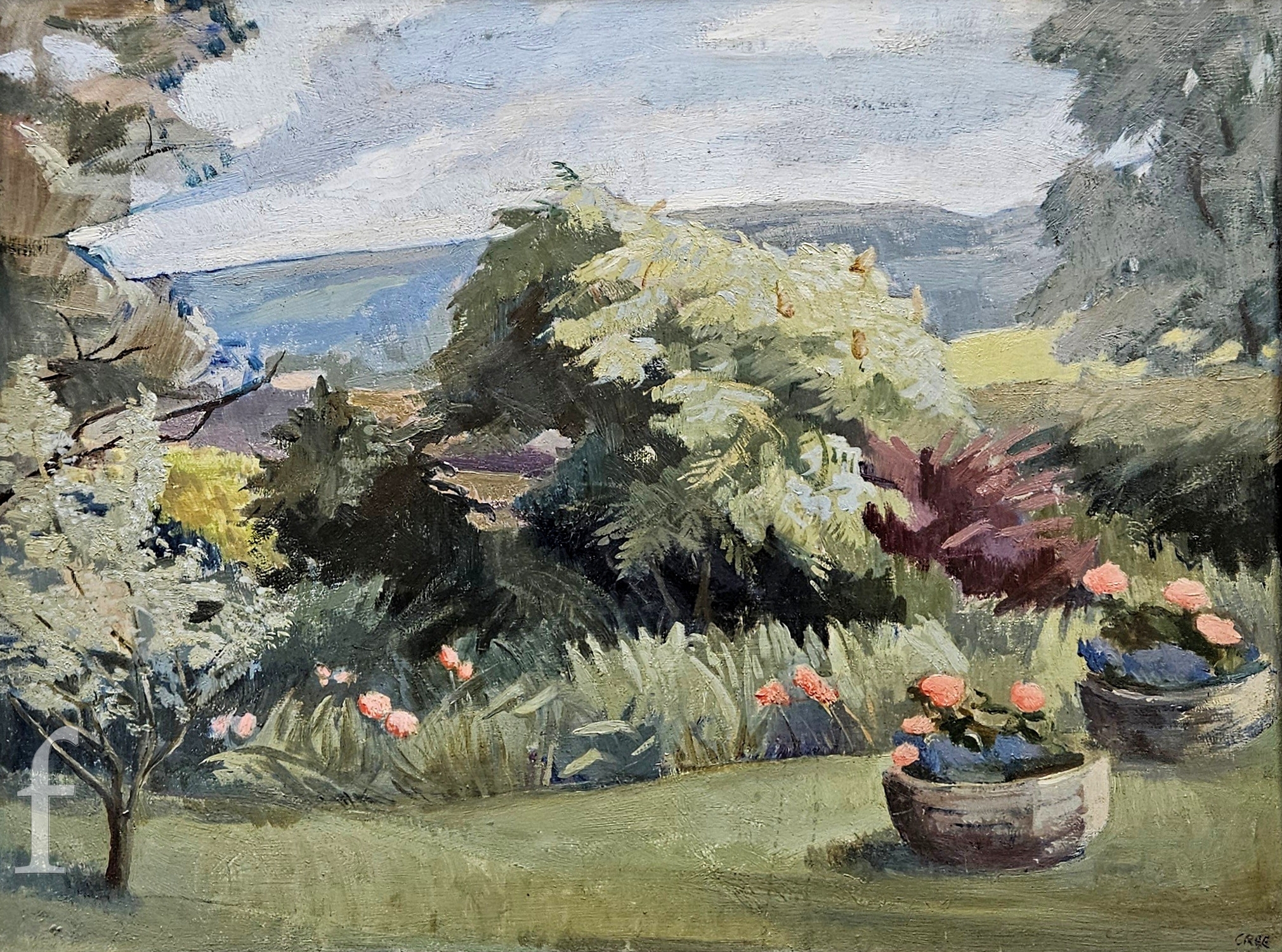 Janet Cree (1910-1992) - An extensive landscape with pink roses, oil on board, signed, framed 45cm x 60cm, frame size 59cm x 74cm.