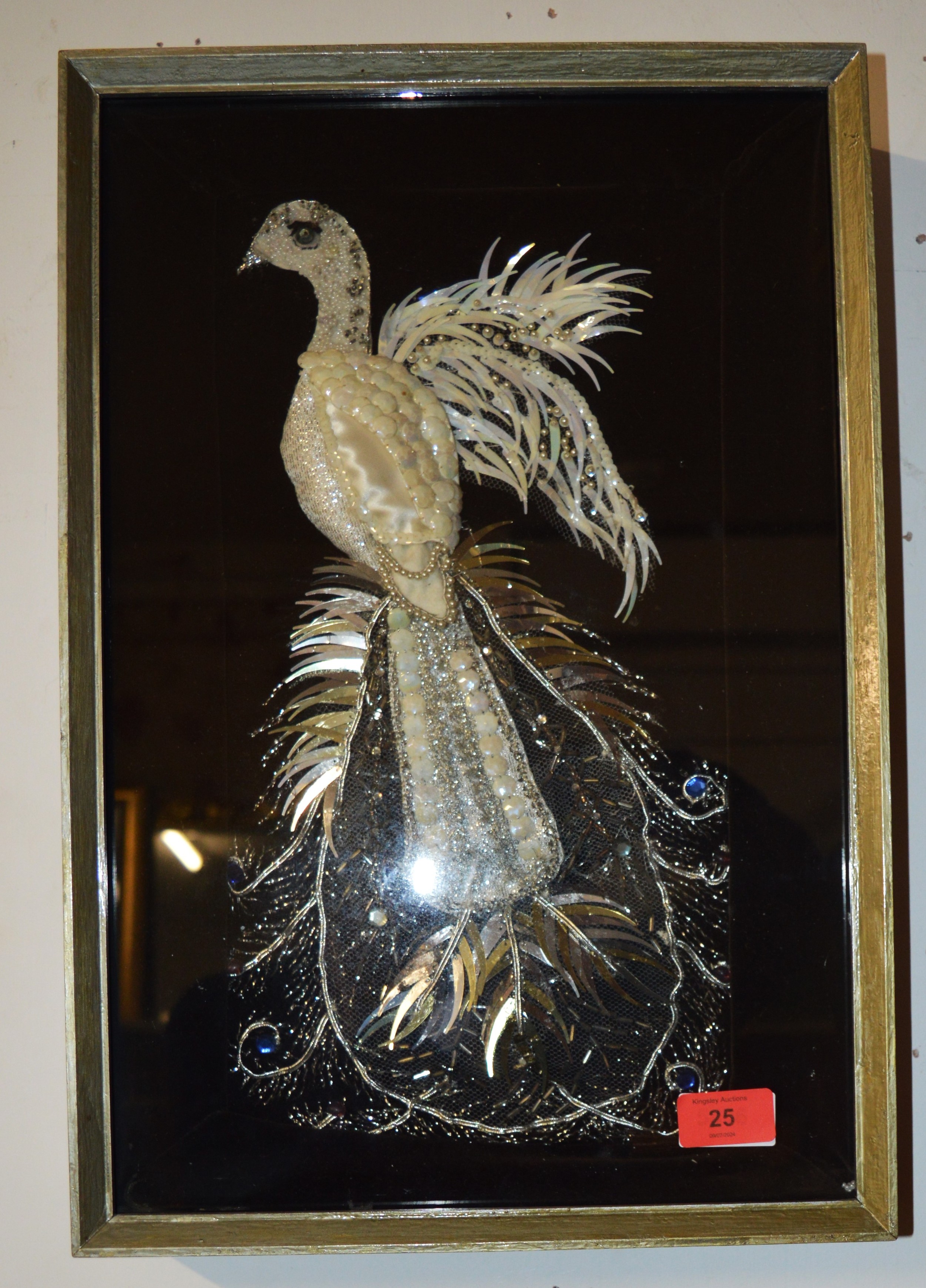 Box-Framed Textile Art Collage of an Exotic Bird (Sequins, Beads, Netting, etc)