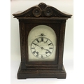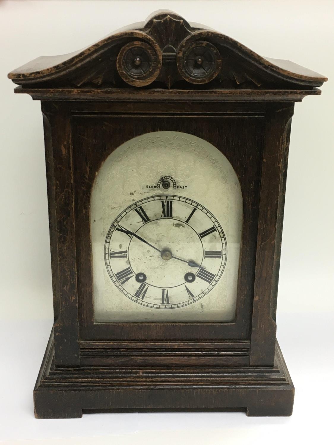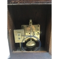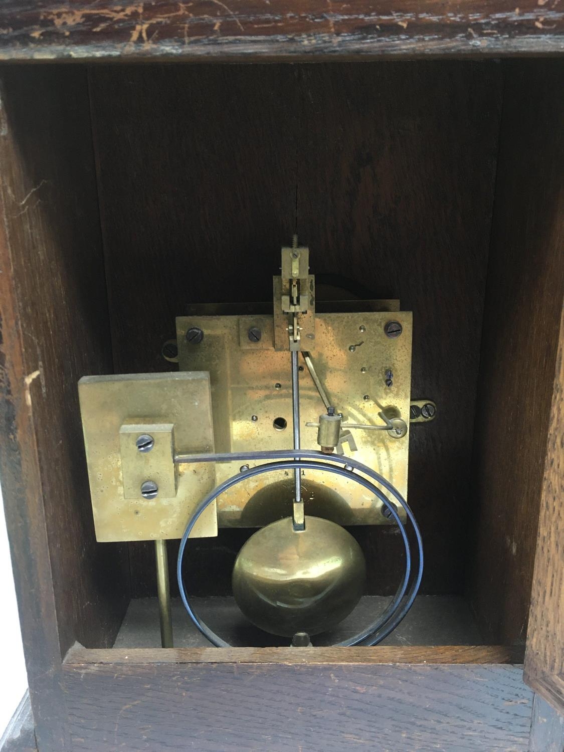 An oak mantle clock with a silvered dial, approx height 35cm. Comes with key and pendulum.