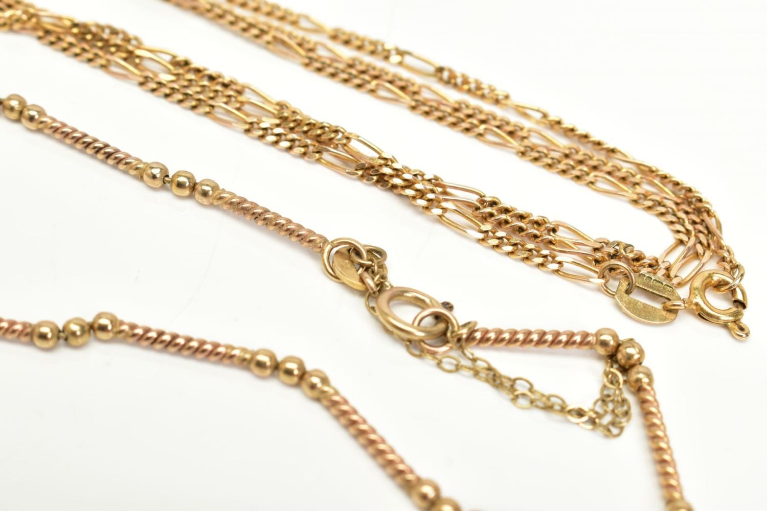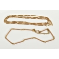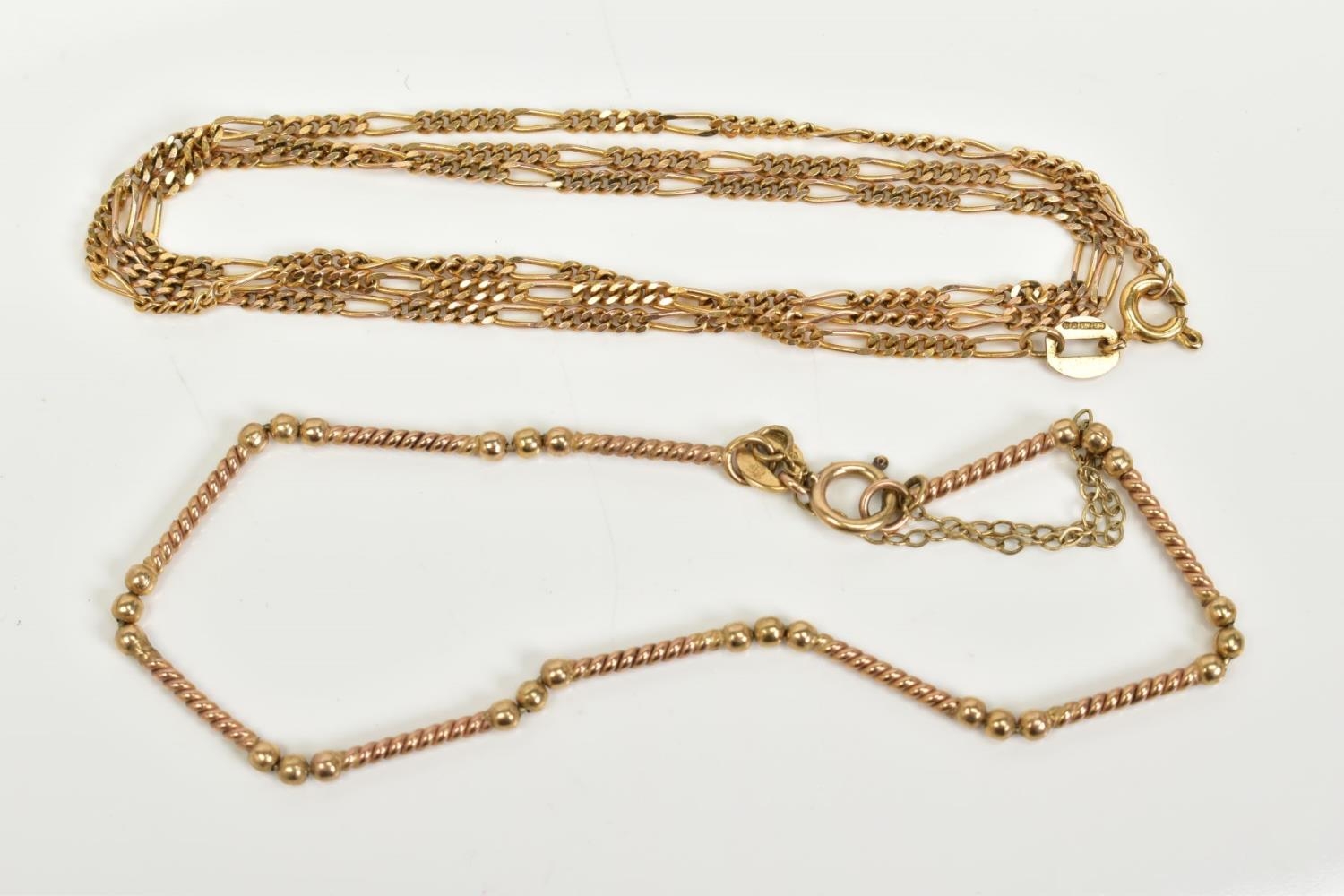 A 9CT GOLD NECKLACE AND BRACELET, the figaro chain, spring clasp, 9ct gold Birmingham import mark, length 460mm, together with a twist panel bracelet, spring clasp, 9ct gold, London import mark, length 80mm, with additional safety chain, approximate gross weight 6.4 grams