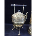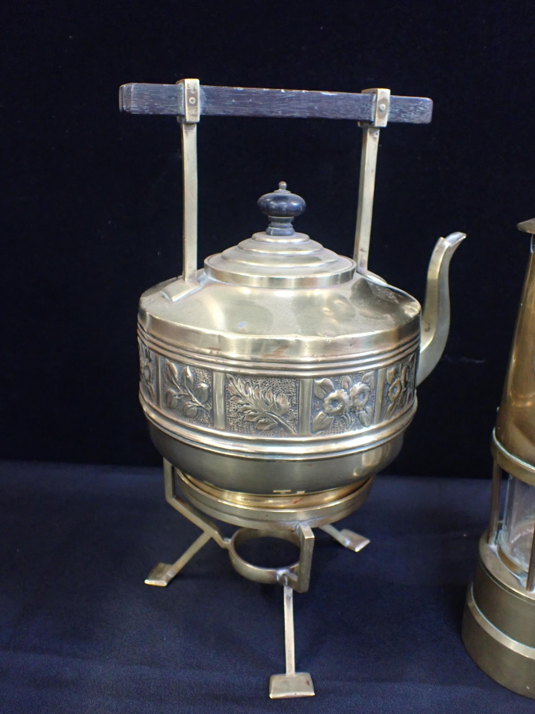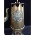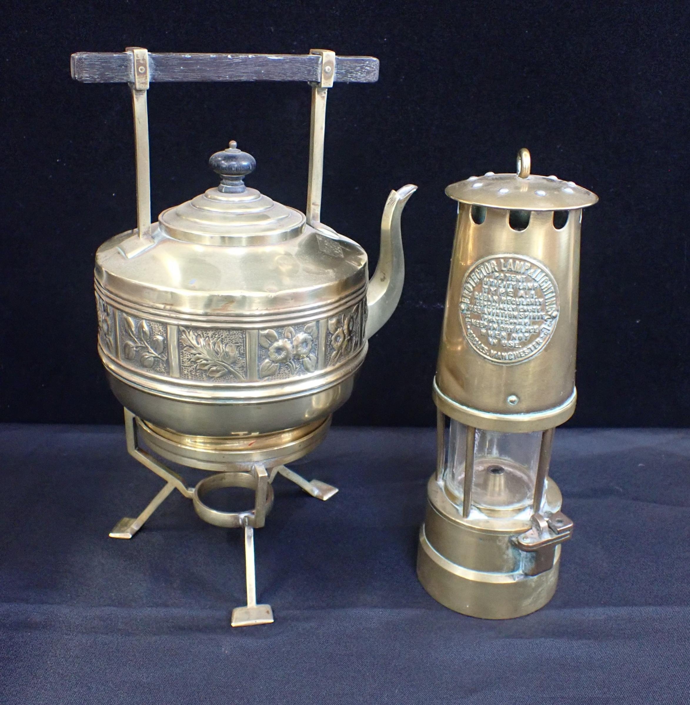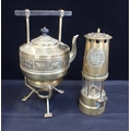 A BRASS MINER'S LAMP; PROTECTOR LAMP & LIGHTING Co LtdECCLES', 27cm high, and an Aesthetic style brass kettle on stand with a Dresser-esque bar handle (2)