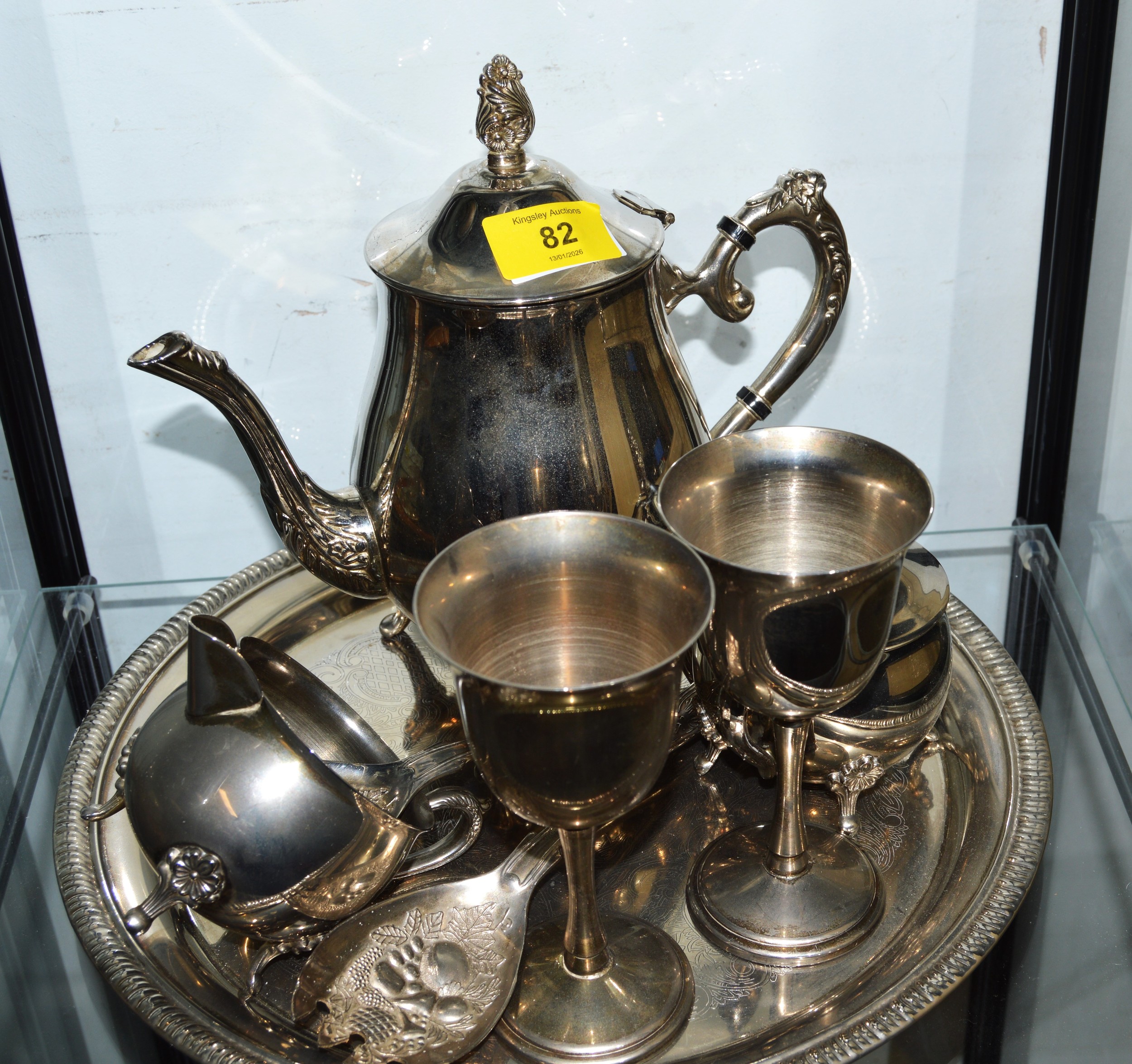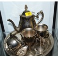 Silver-Plated Tea Service on a Tray, Two Plated Goblets, Plus Two Plated Embossed Serving Utensils