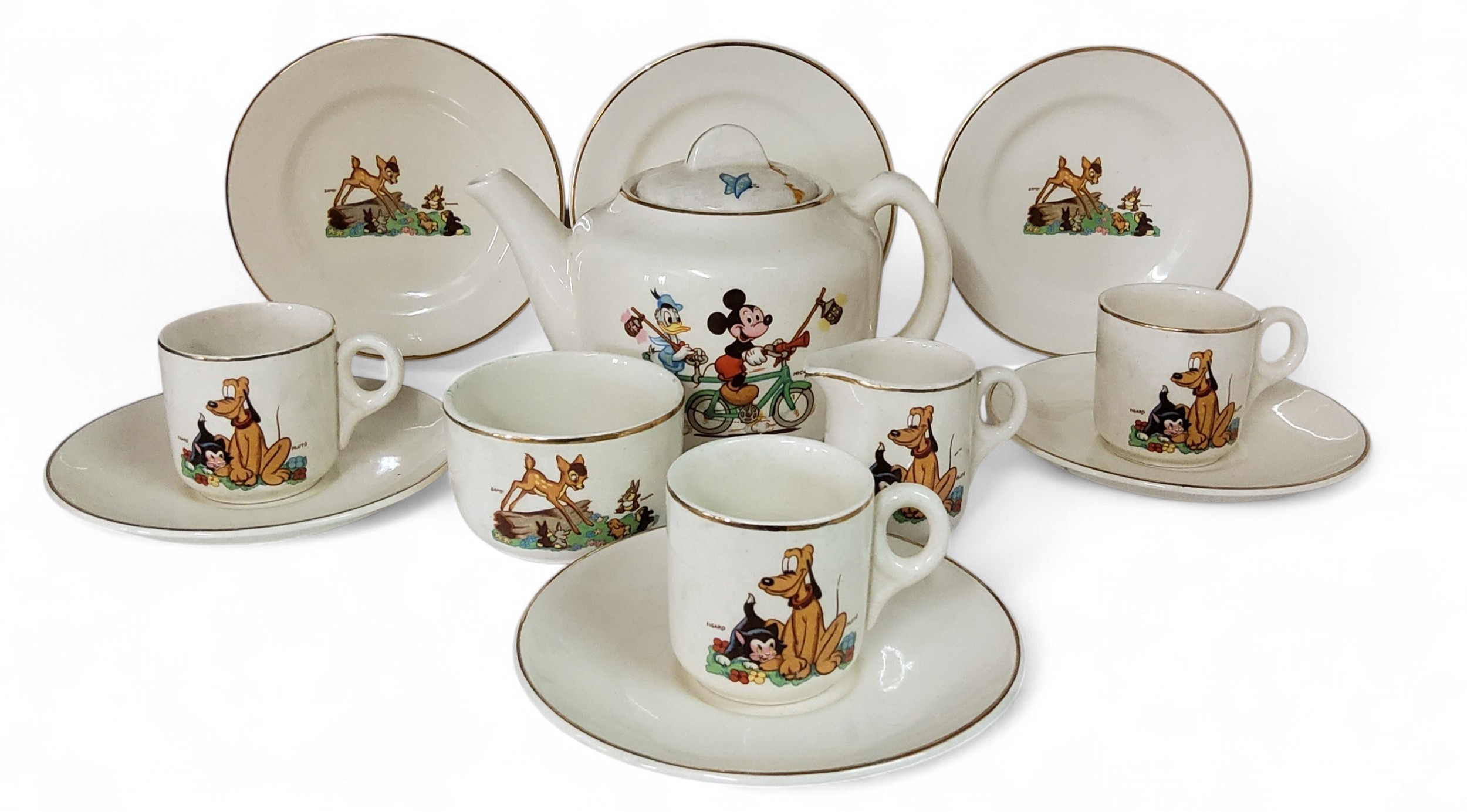 A Beswick Disney nursery tea service, comprising teapot, four cups and saucers, milk jug and sugar bow, each printed in colours with Bambi, Mickey Mouse, Donald Duck, Pluto, printed marks