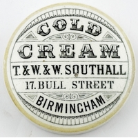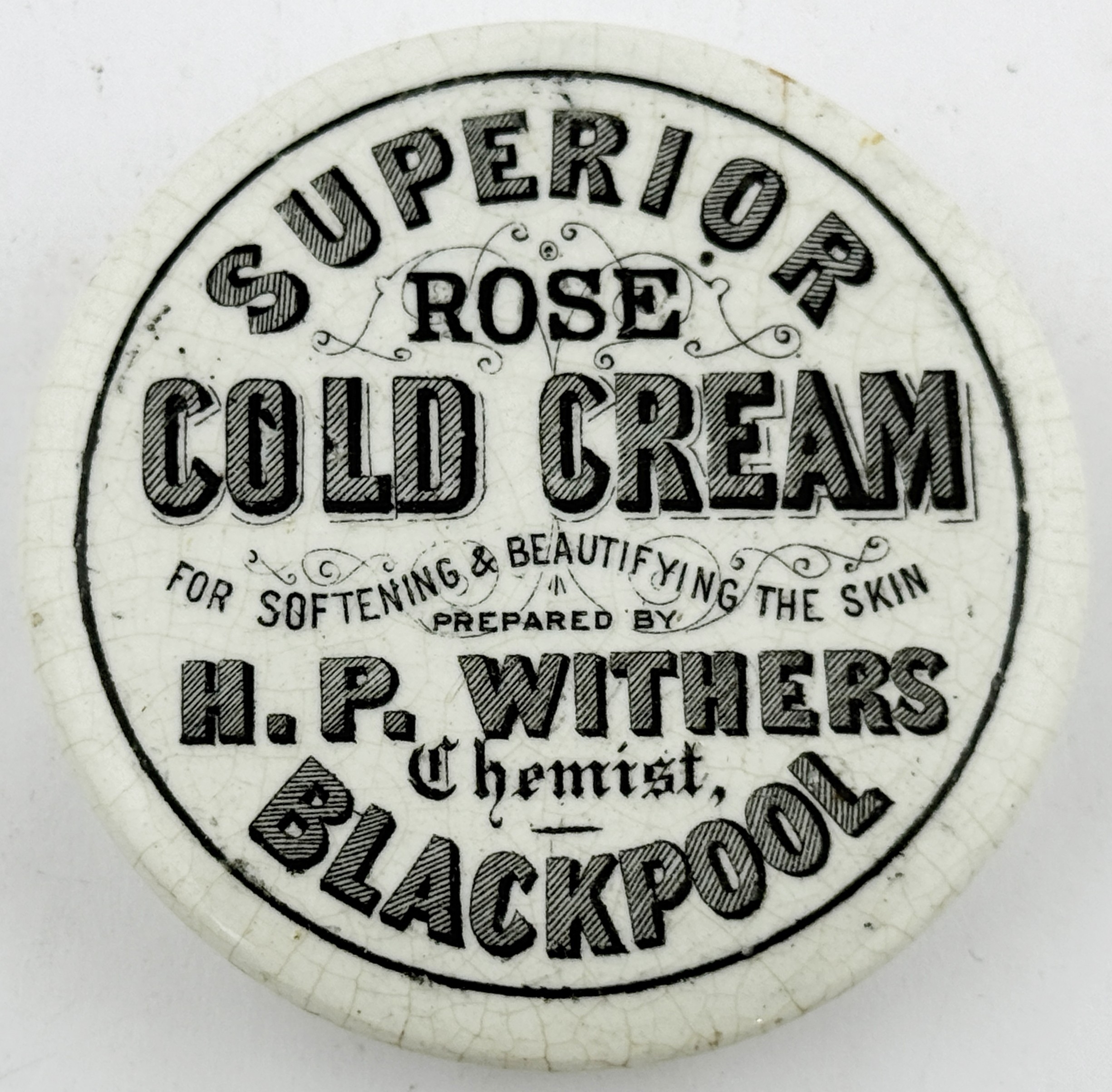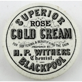 BLACKPOOL COLD CREAM LID. APL p218, 24. 2.5ins. Rare Lancashire lid ROSE/ COLD CREAM/ H P WITHERS/ BLACKPOOL. Single line border, Nice graphic lay out. Impact bruise to flange foot otherwise very good.