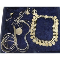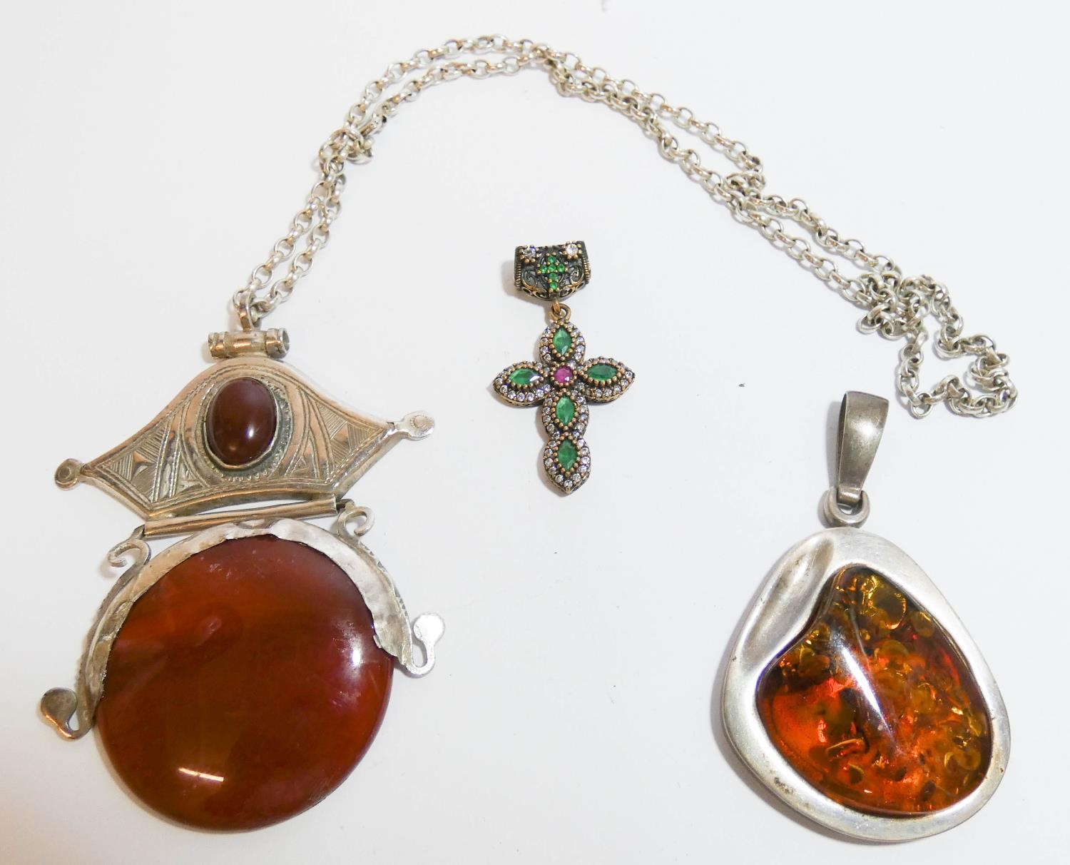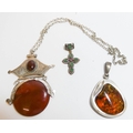 Chunky silver and amber pendant, agate pendant on silver chain and a silver gilt paste set cross pendant