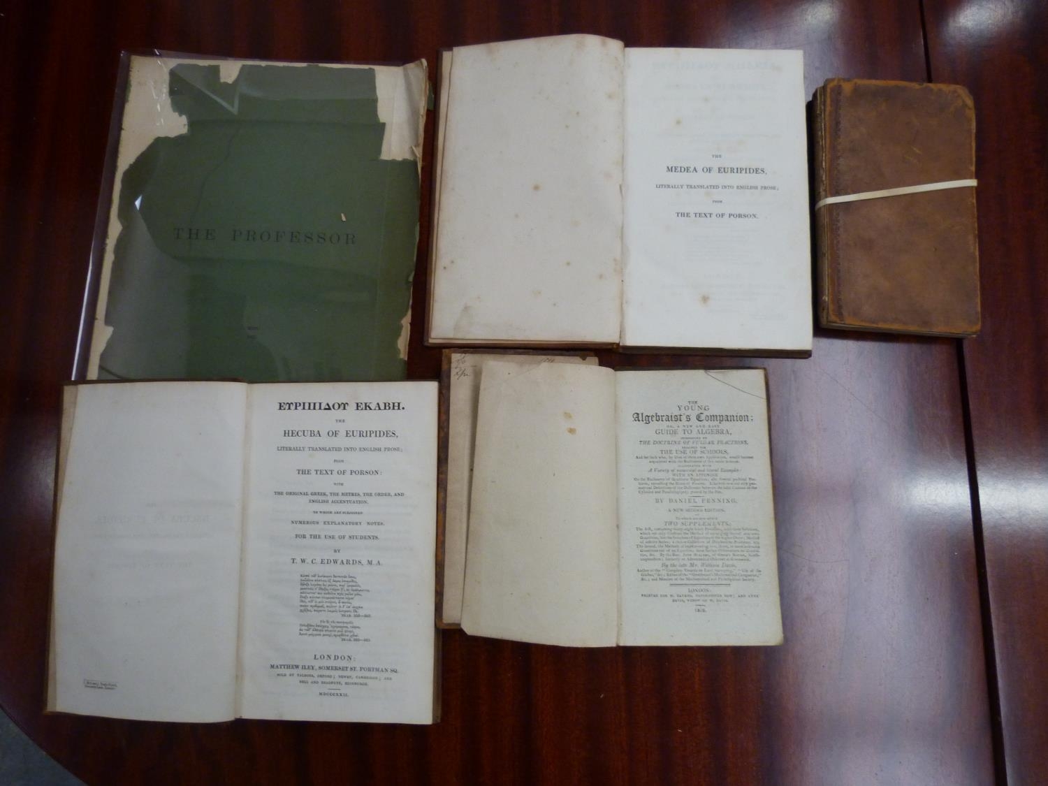 BENSON A. C. The Professor. Ltd. ed. no. 6 of only 100. 51pp. Quarto. Very torn orig. wrappers. Eton, 1895; also Fenning, The Young Algebraist's Companion, calf (brds. det. but present), 1808 & 3 other vols. (5).