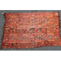 Soumak rug with an all-over stylised design in shades of red and blue with end skirt panels, 4ft 8ins x 3ft 10ins approximately
