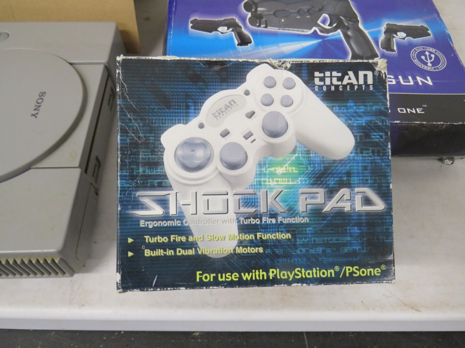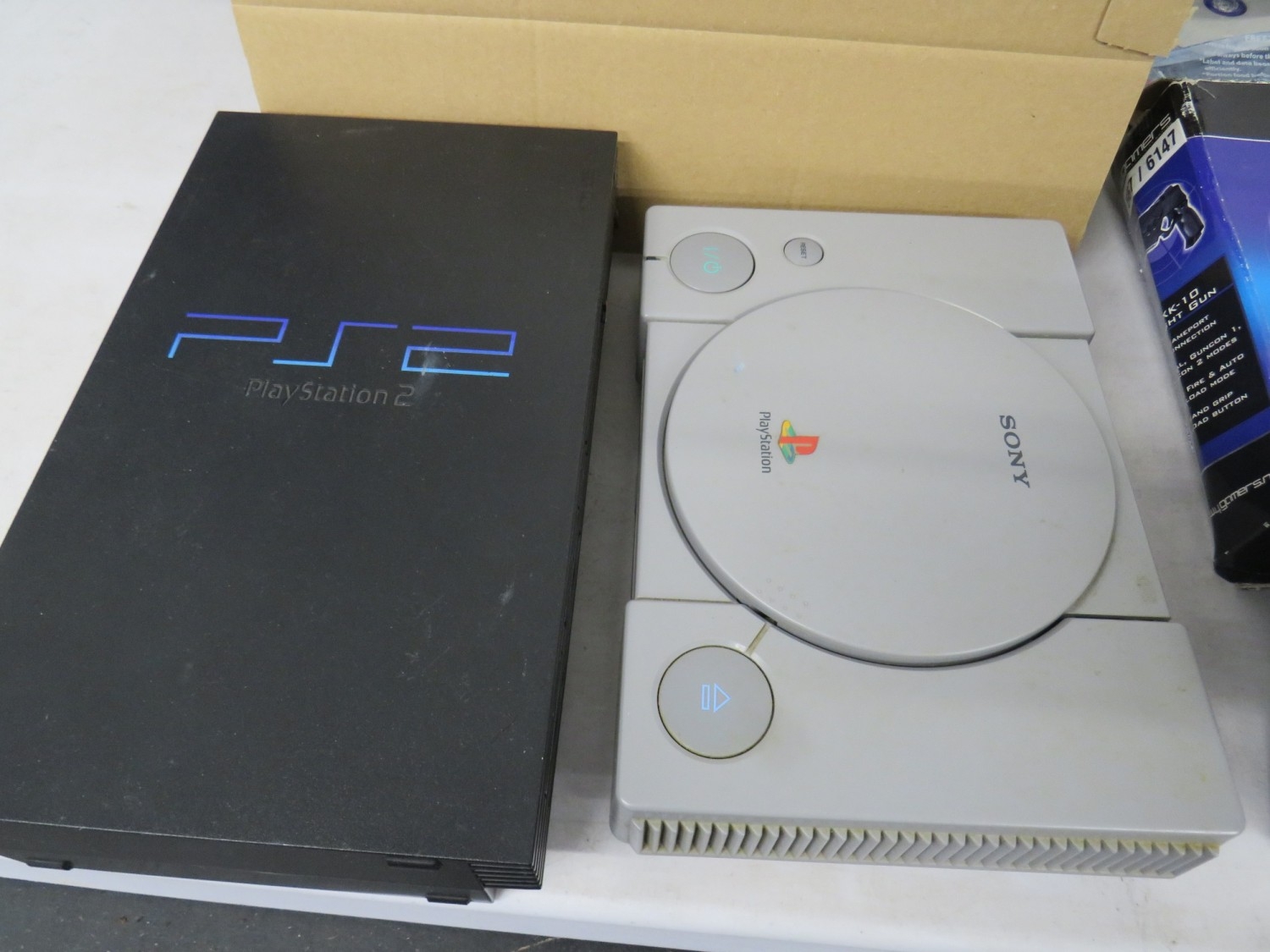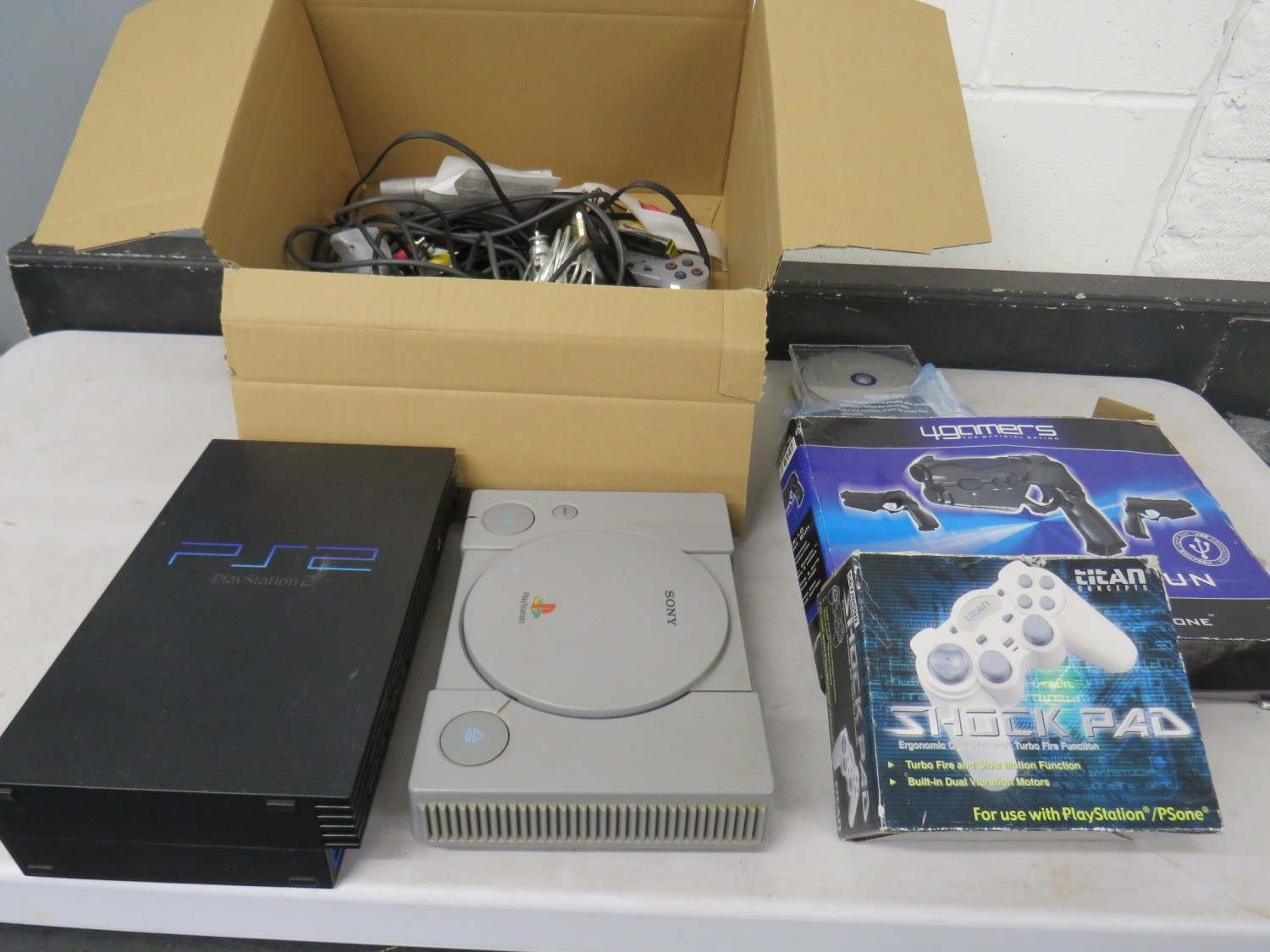 Lot of assorted gaming equiptment to include a PS1 and PS2 console