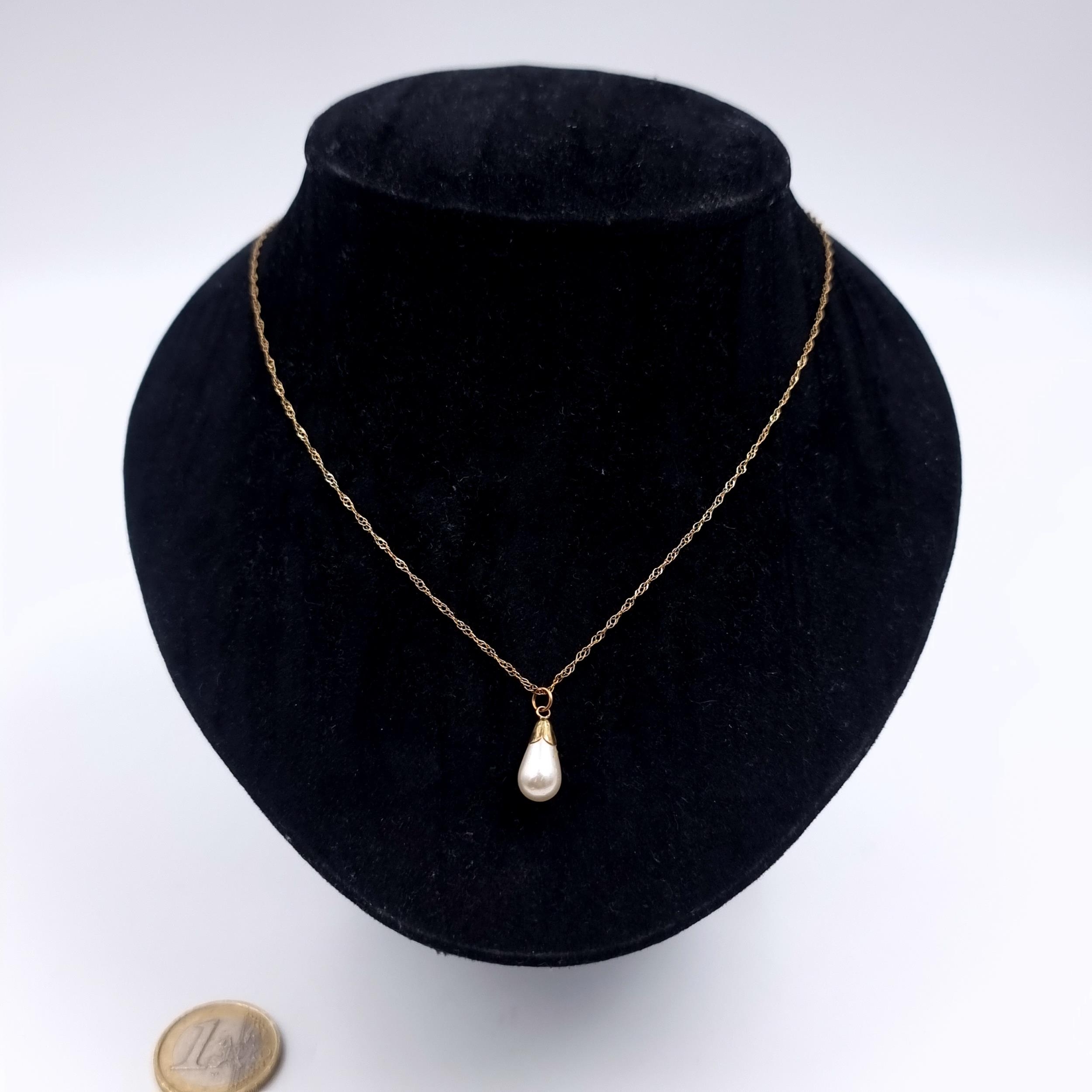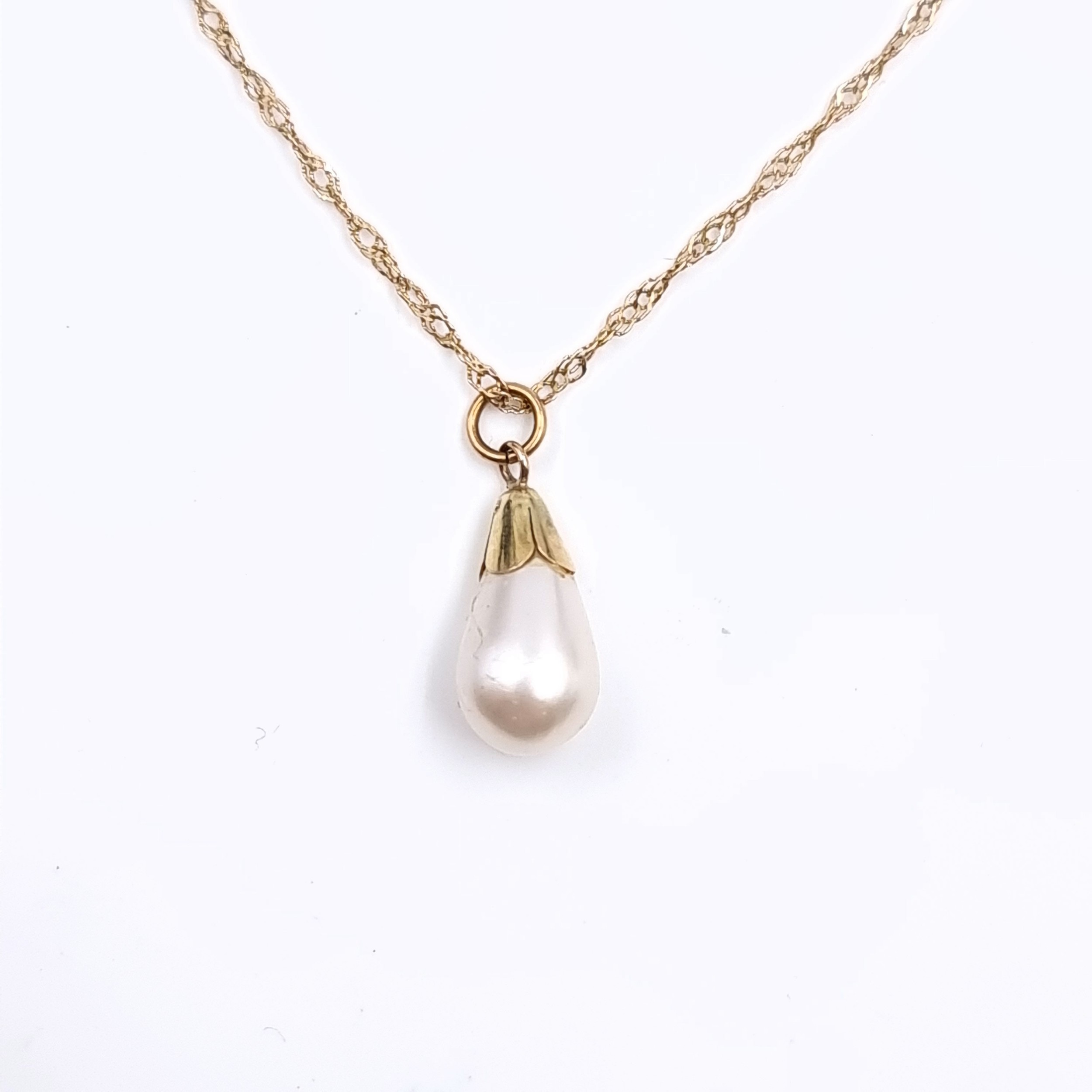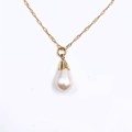 Star Lot: A nine carat gold (9K) pearl pendant necklace. Length 46cm. Weight 1.10 grams. Boxed.
