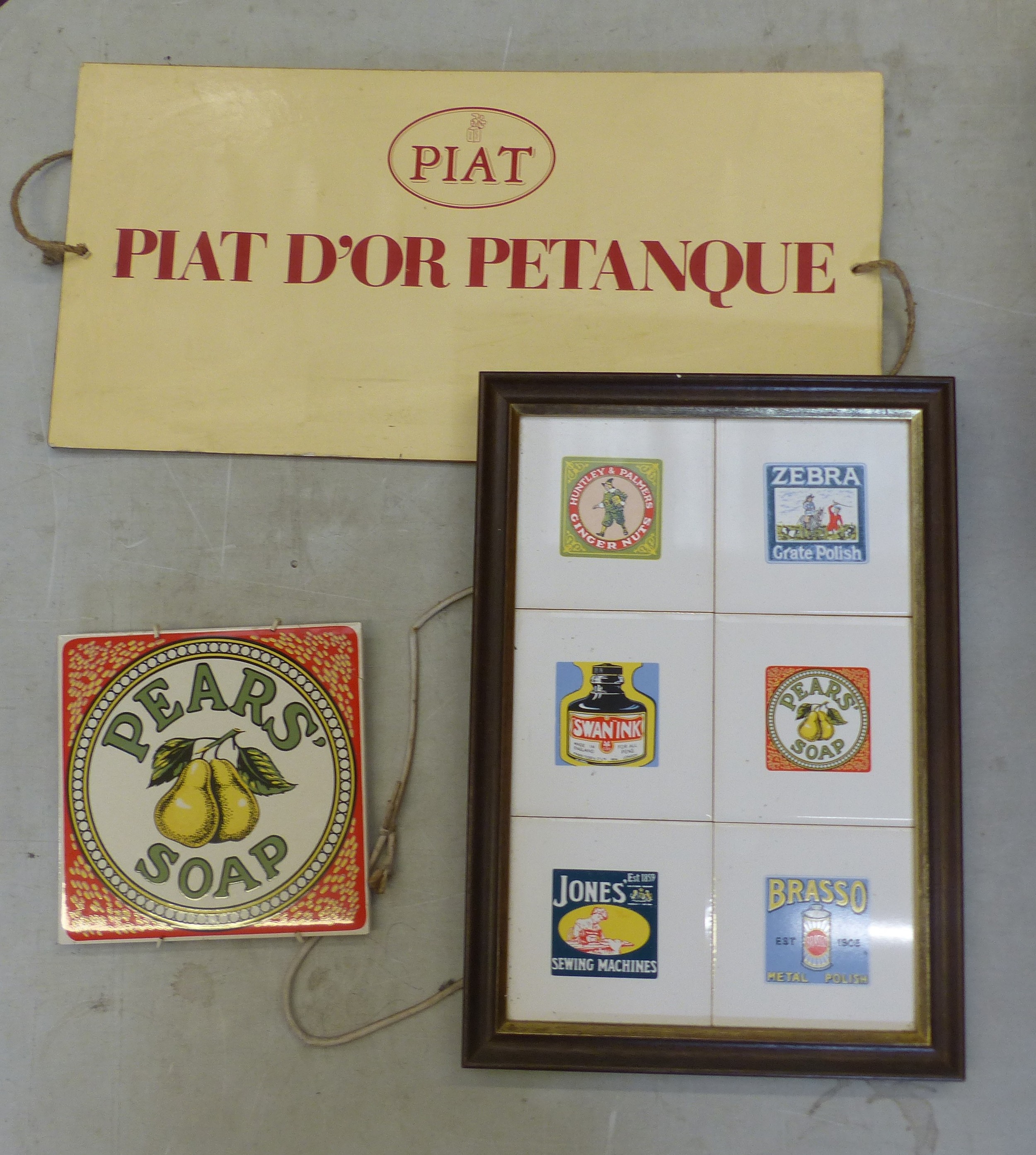 Framed advertising tiles together with a Pear's Soap tile and a hardboard Piat D'Or hanging sign (3).