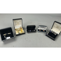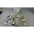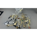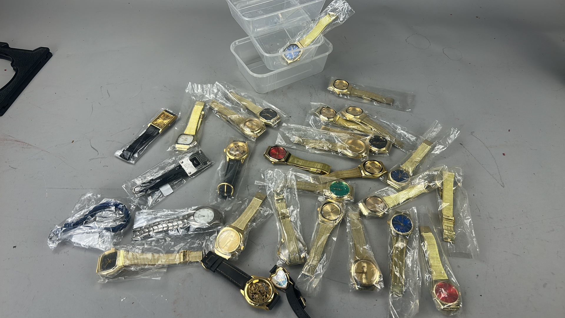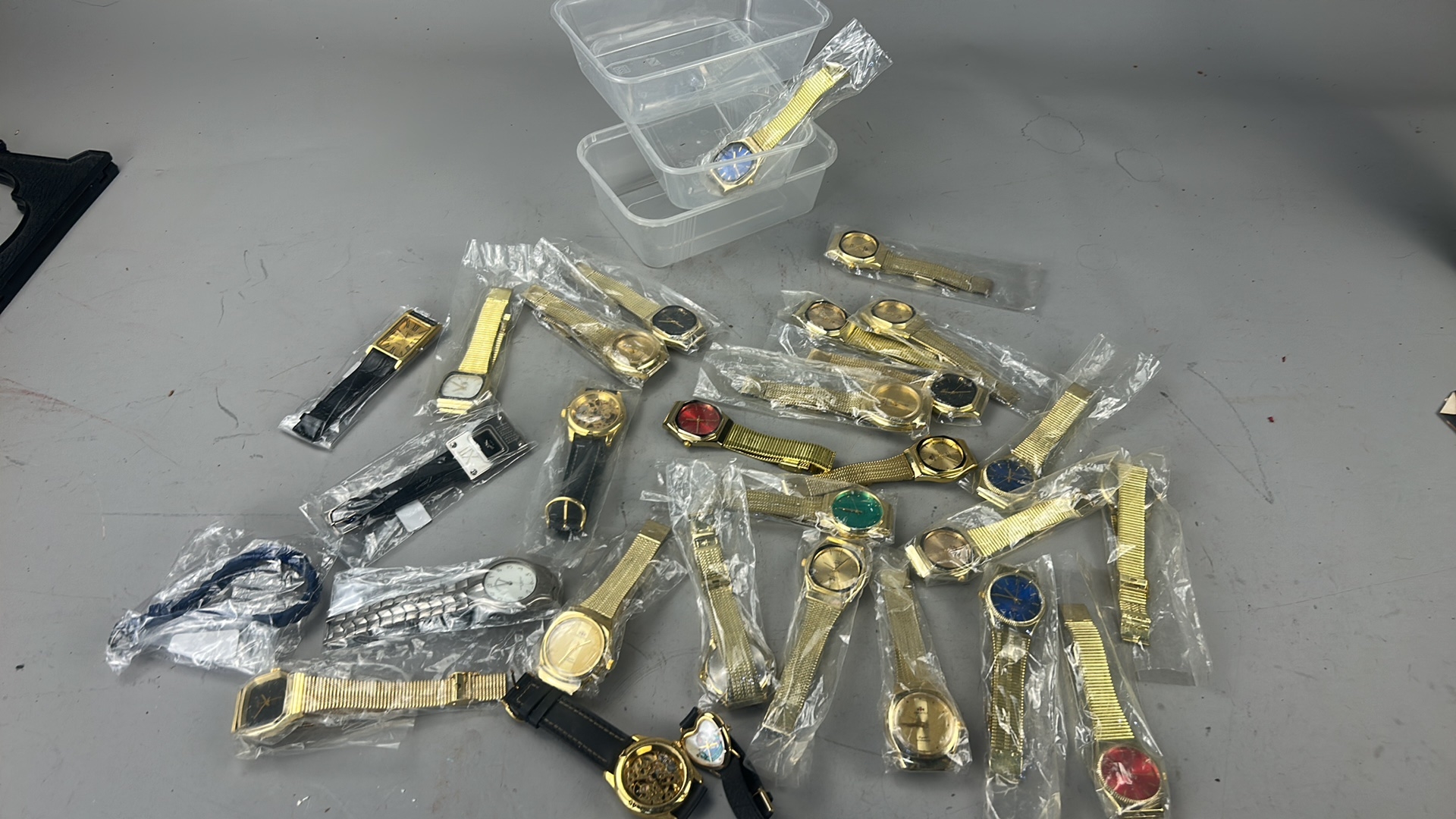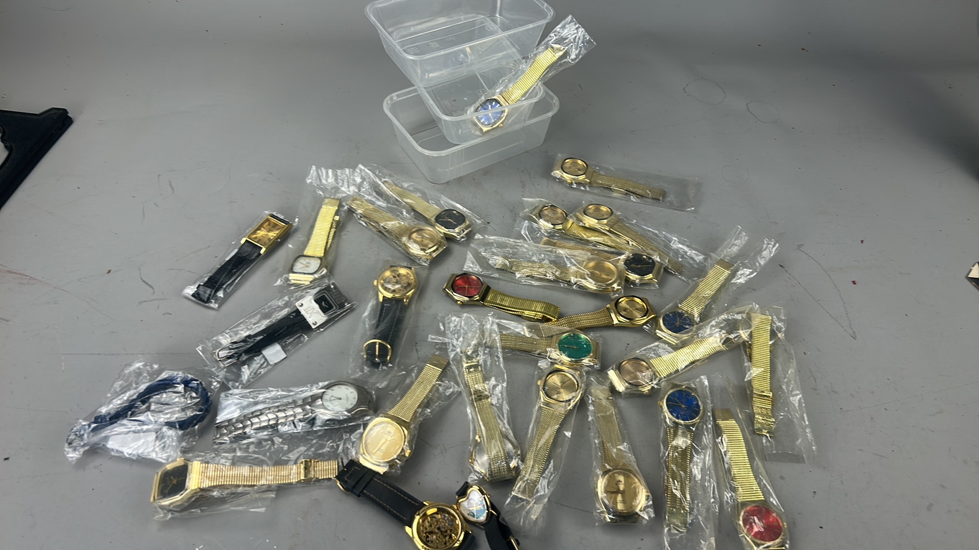 Collection of assorted gold-tone and mixed metal quartz wristwatches with varied dial colours and strap styles, many still in factory plastic sleeves.
