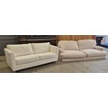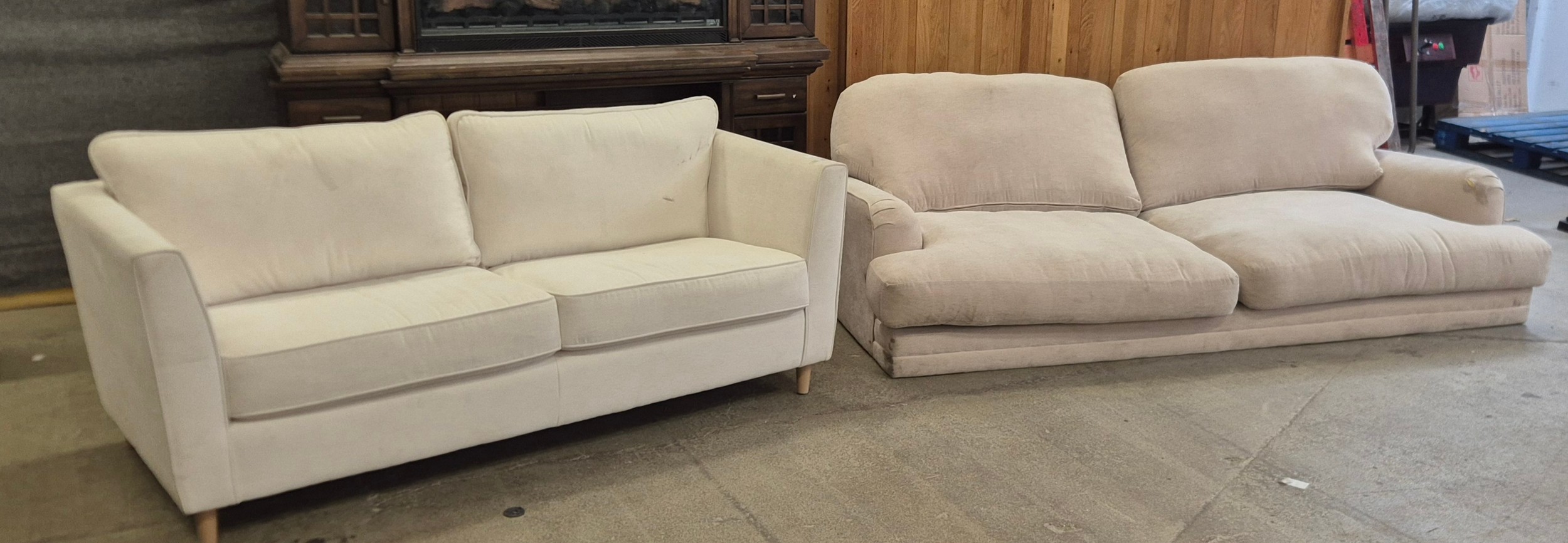 A cream fabric upholstered four seater sofa (transit marked/ torn) and another cream sofa (transit marked)