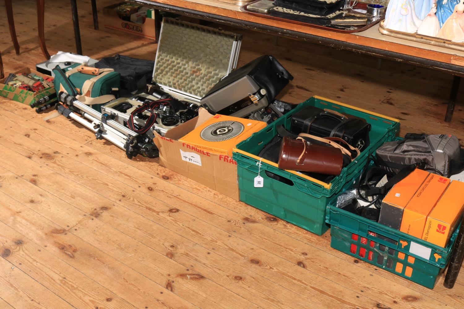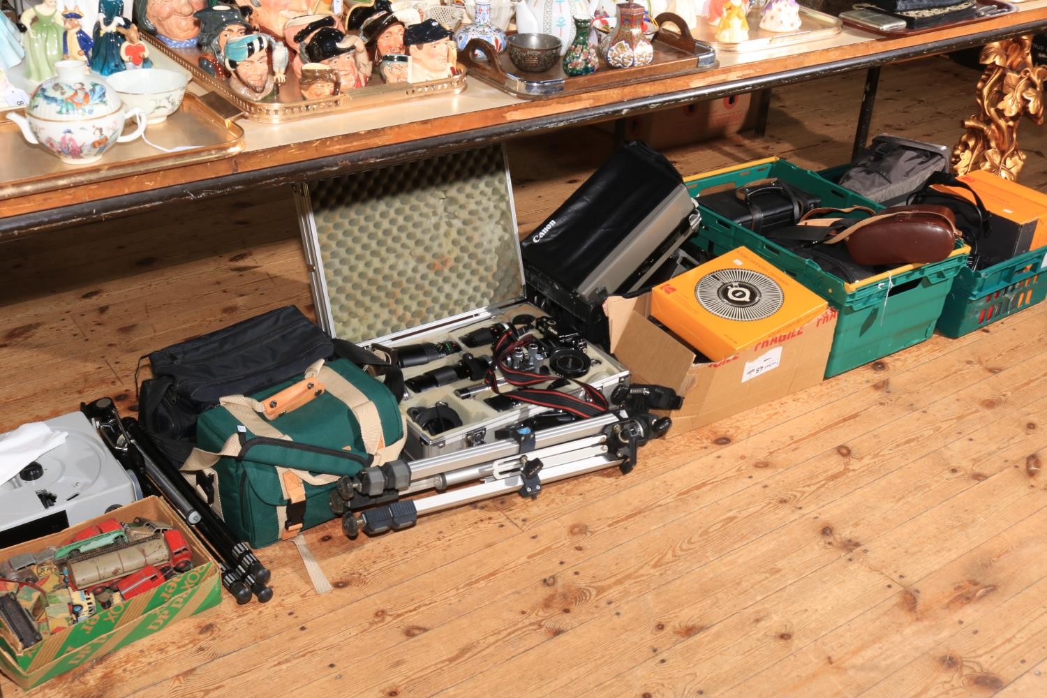 Large collection of photographic equipment including cased Canon F1 camera, lenses and accessories, other cameras, binoculars, model vehicles, etc.